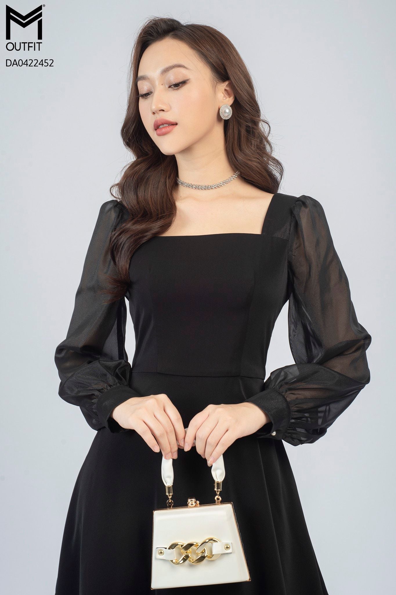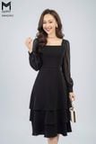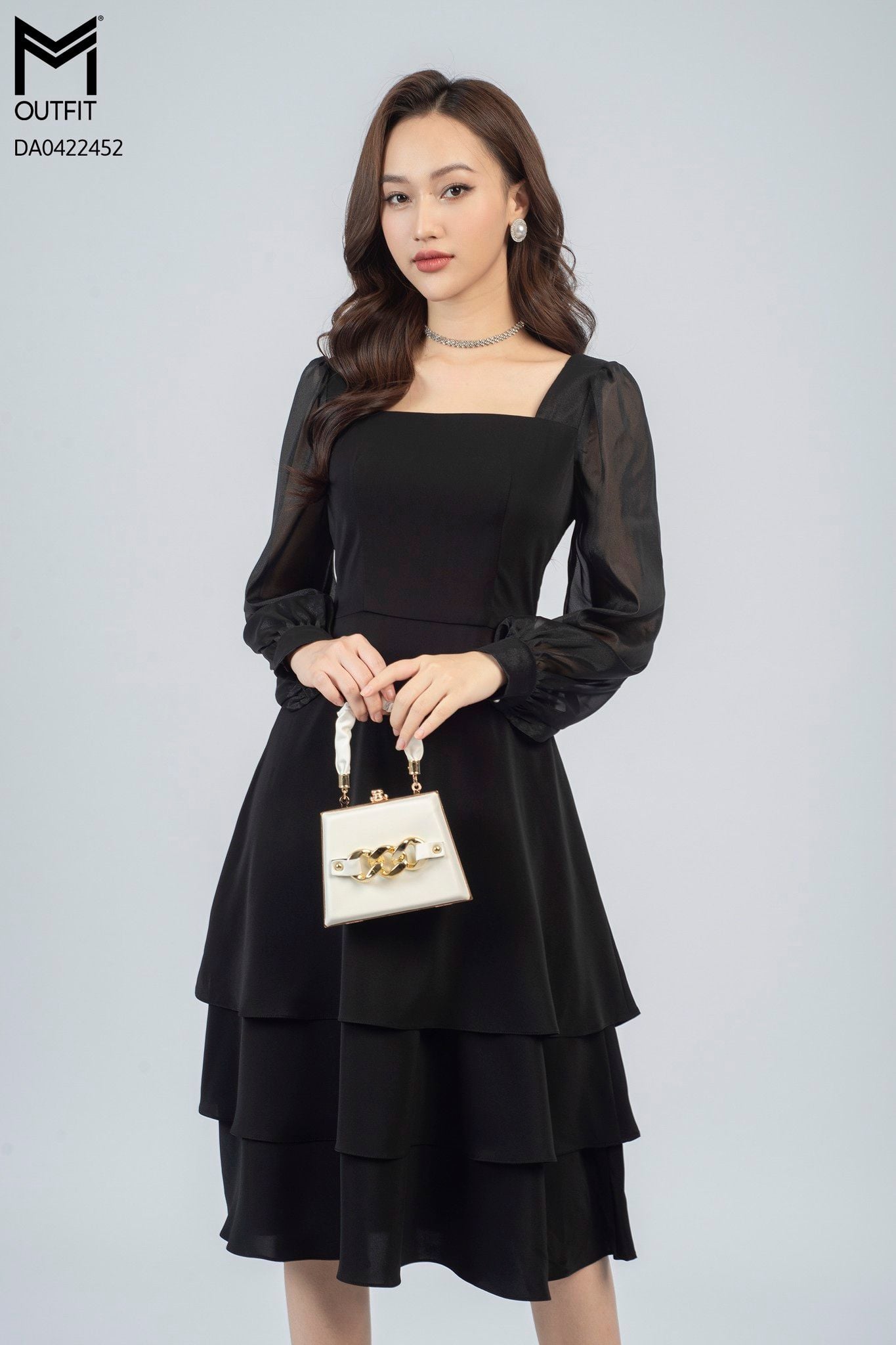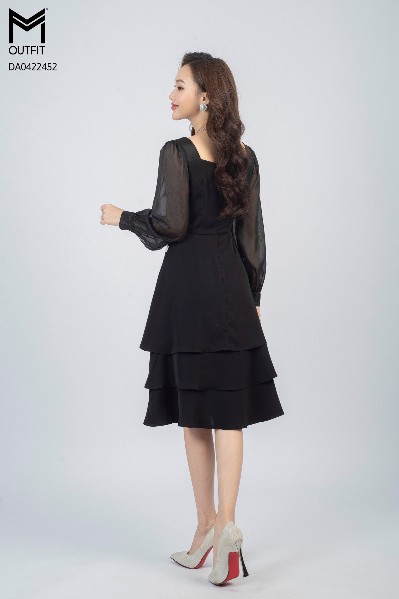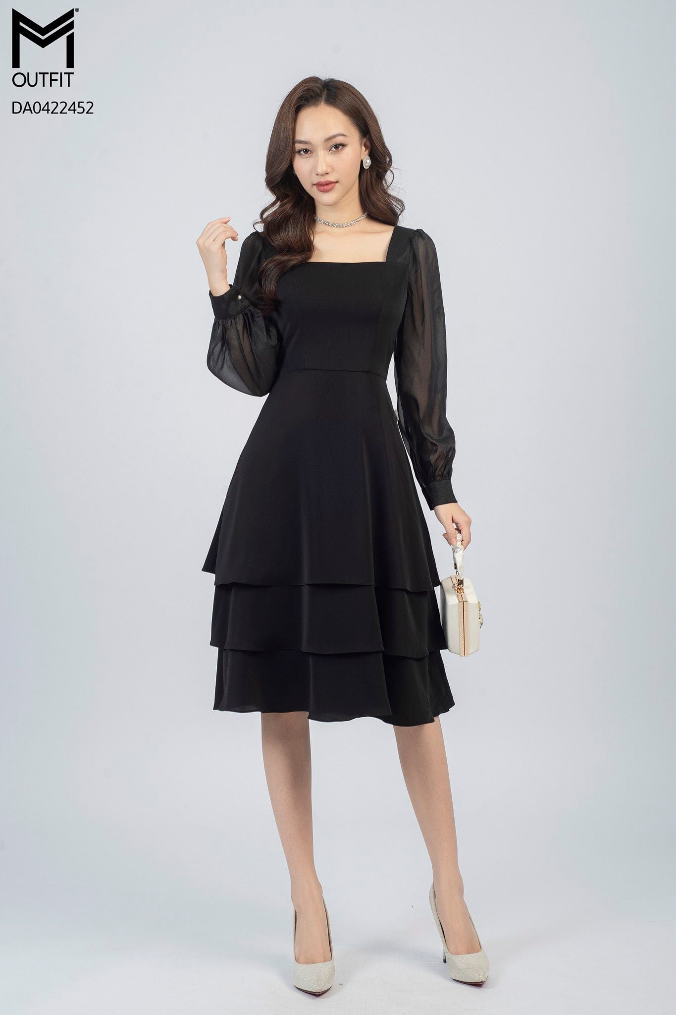 Đầm dáng xòe, 3 tầng, cổ U, tay dài phối voan