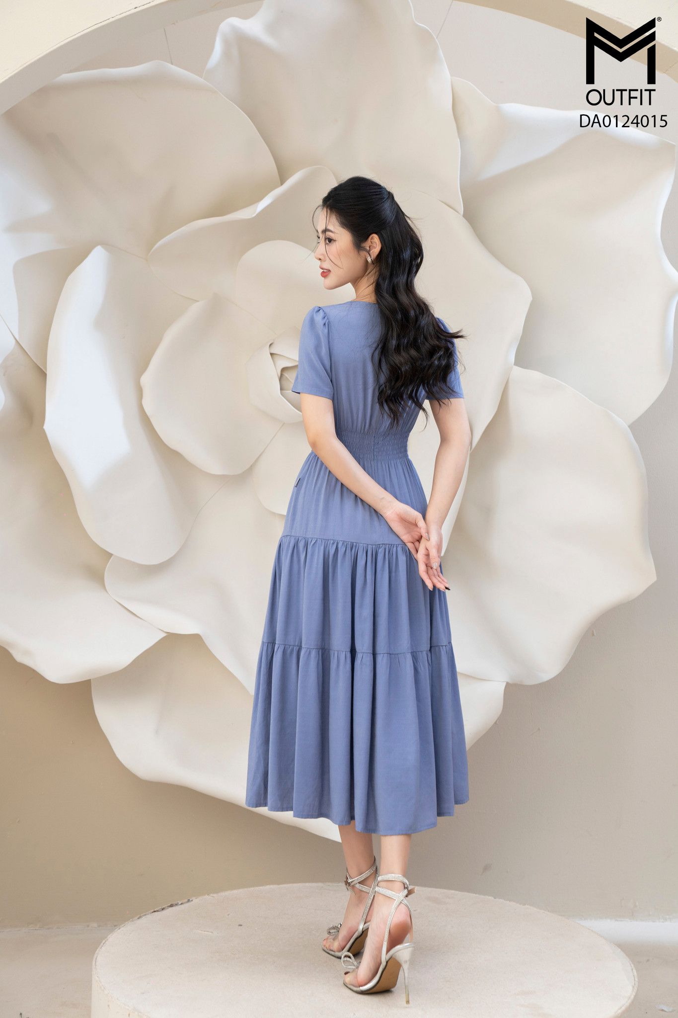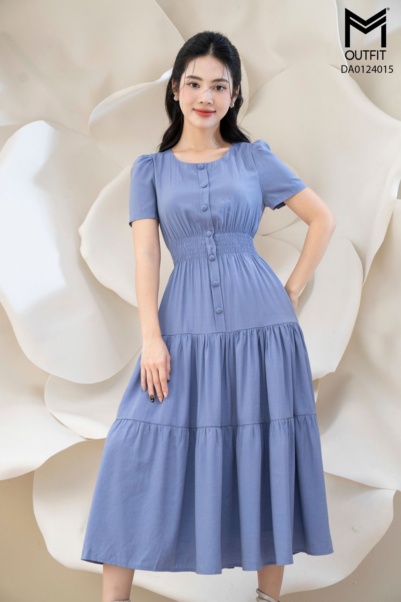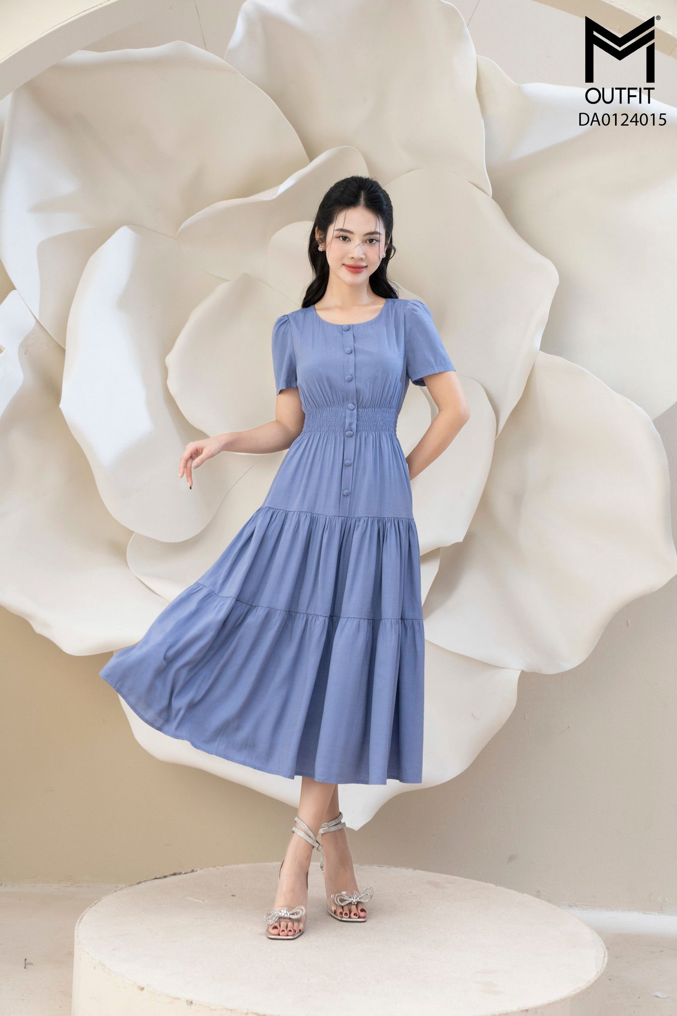 | Đặc điểm | Đầm dáng xòe chun eo tùng nhún nẹp bong đính cúc bọc |
