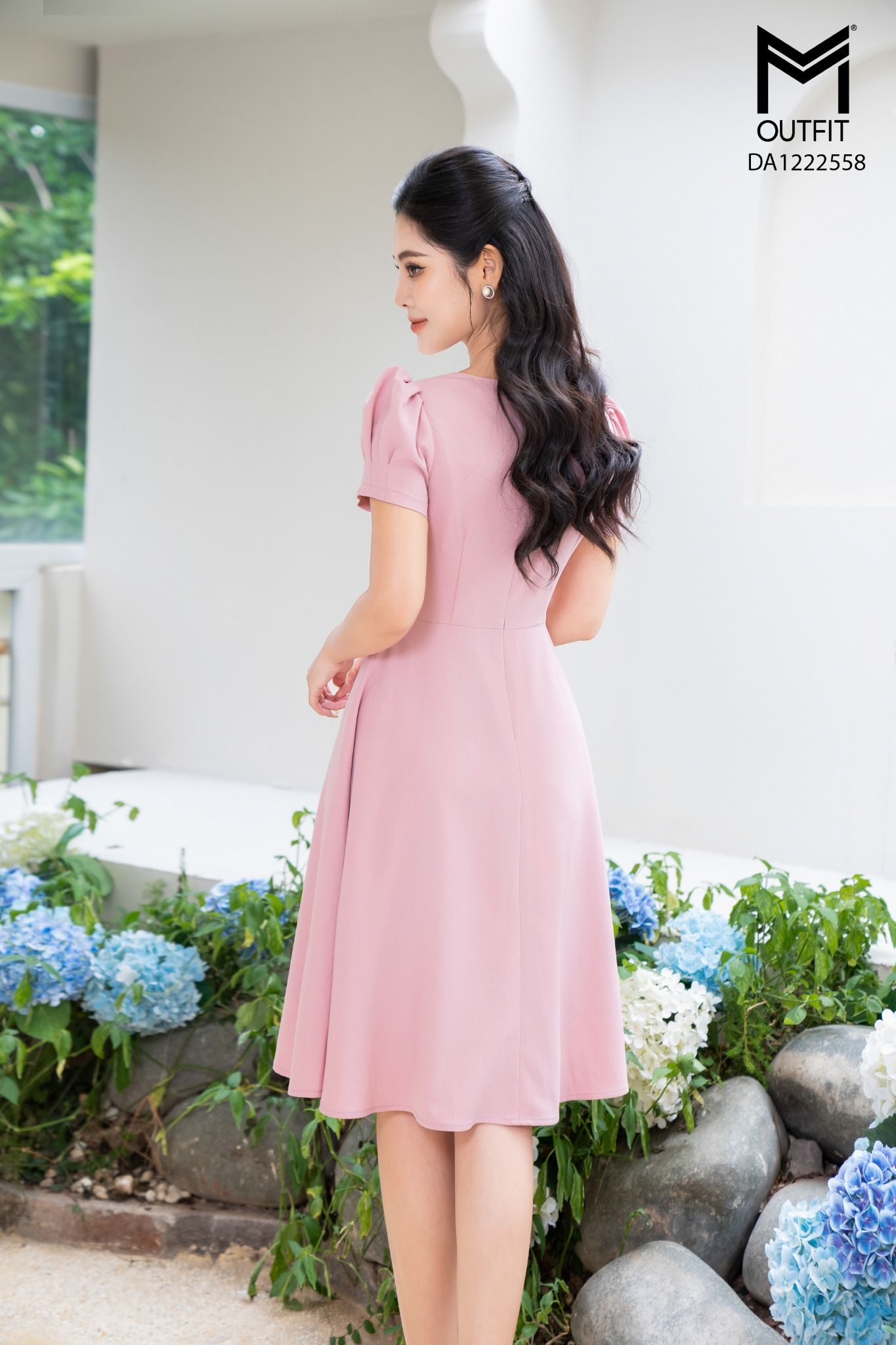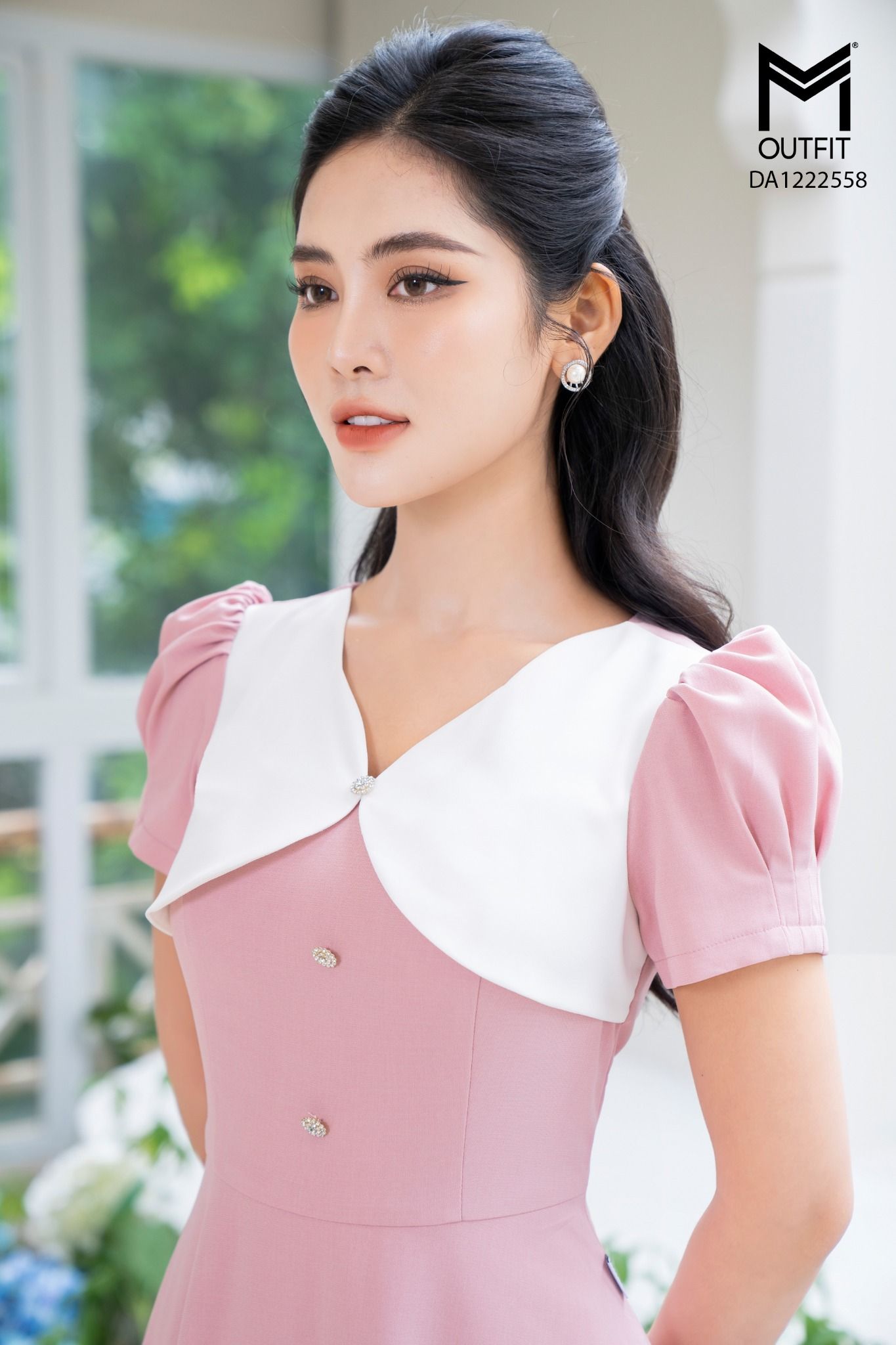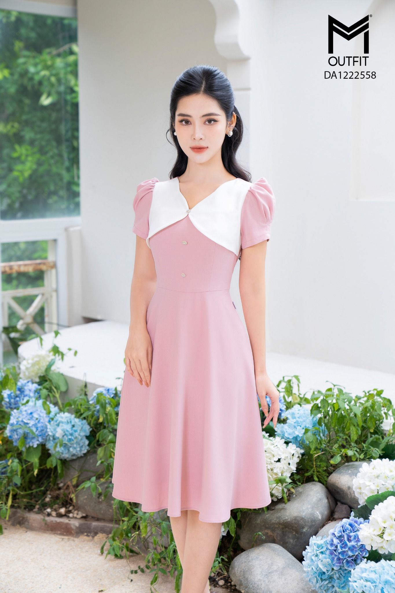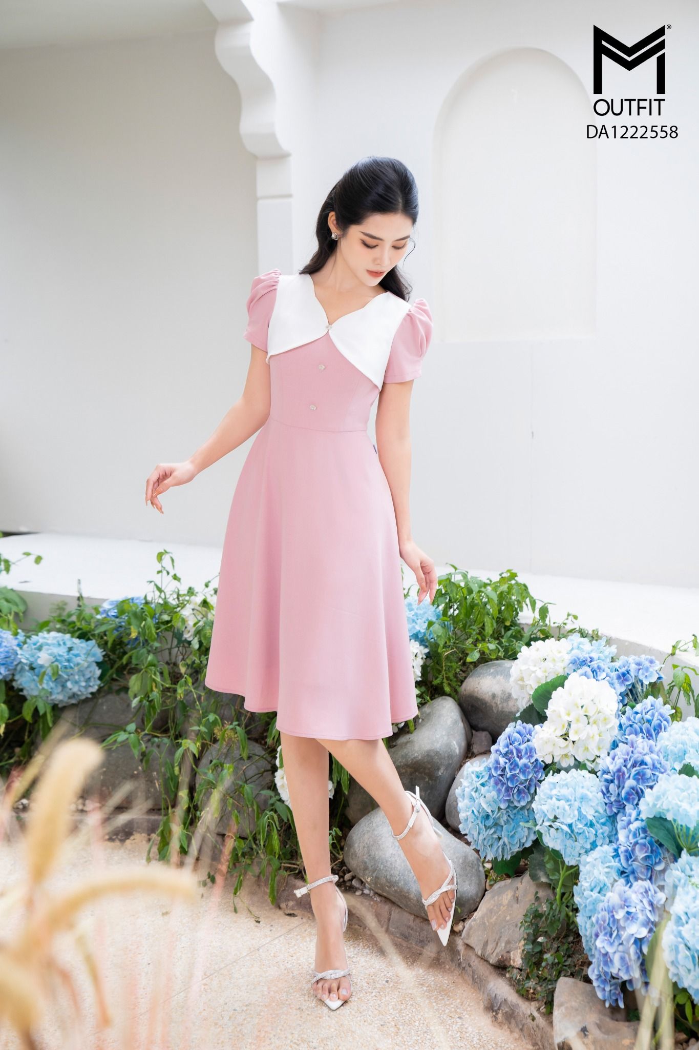 | Đặc điểm | Đầm dáng xòe, cổ chéo phối trắng |