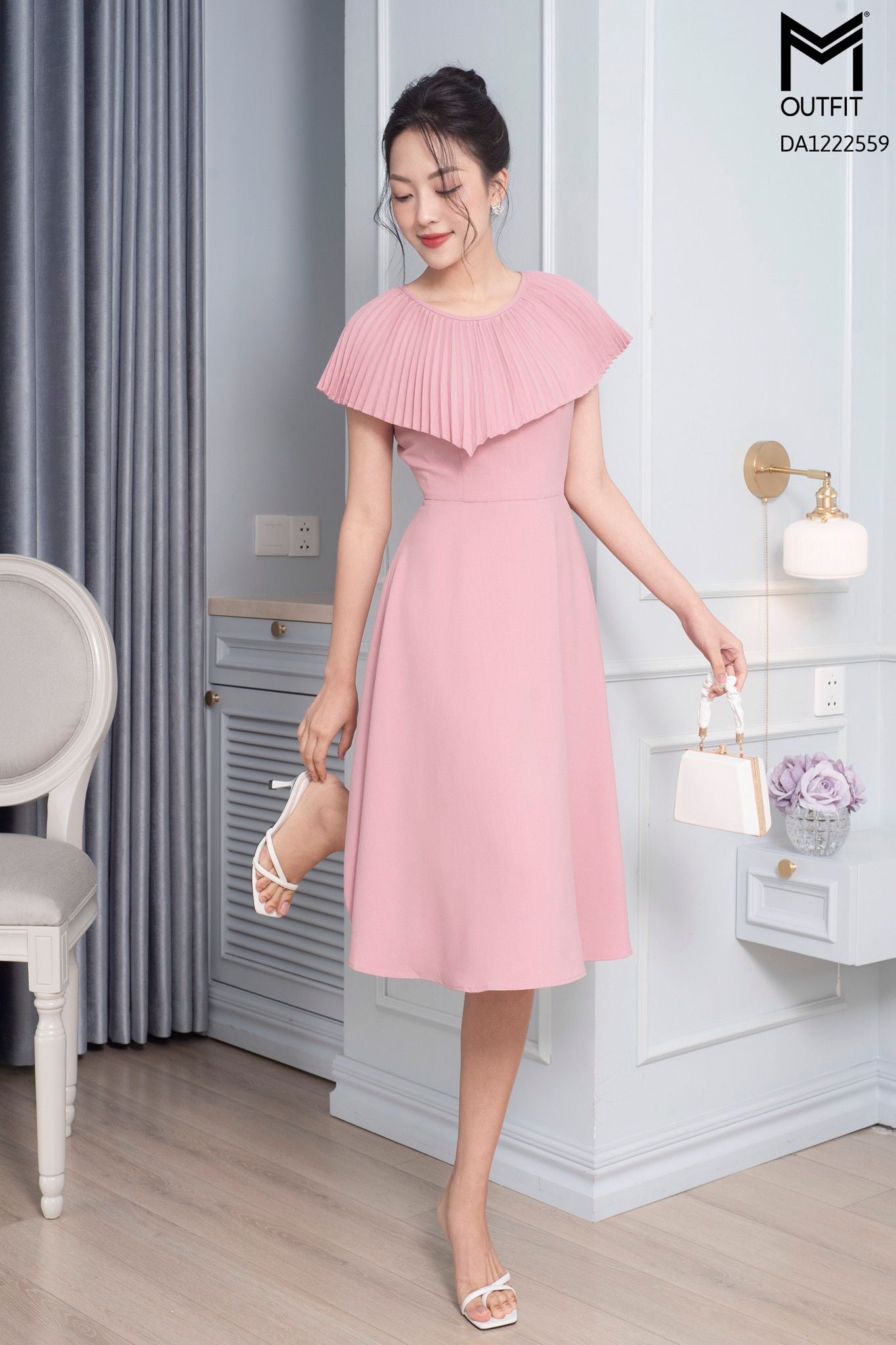 | Đặc điểm | Đầm dáng xòe, cổ dập ly |