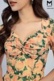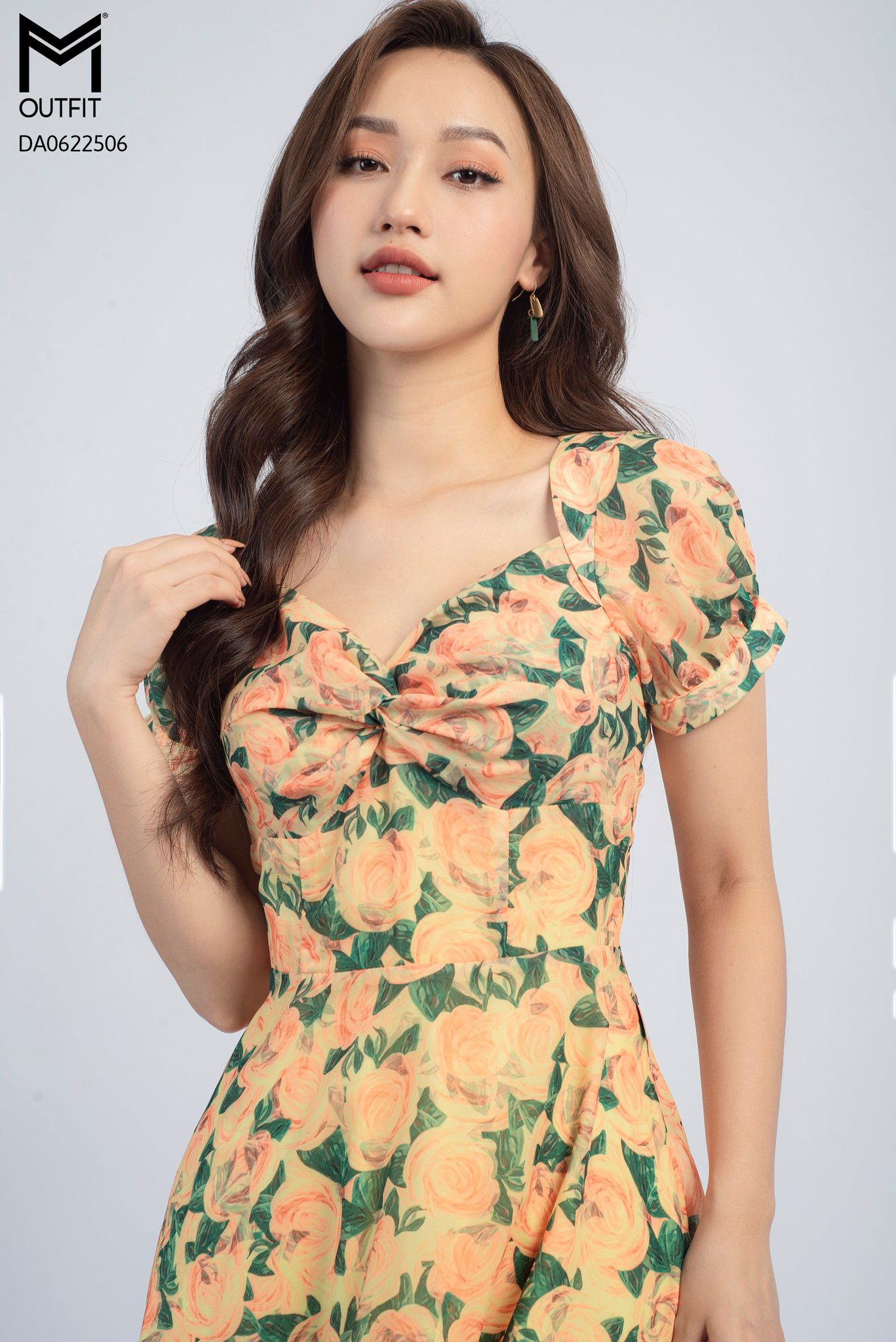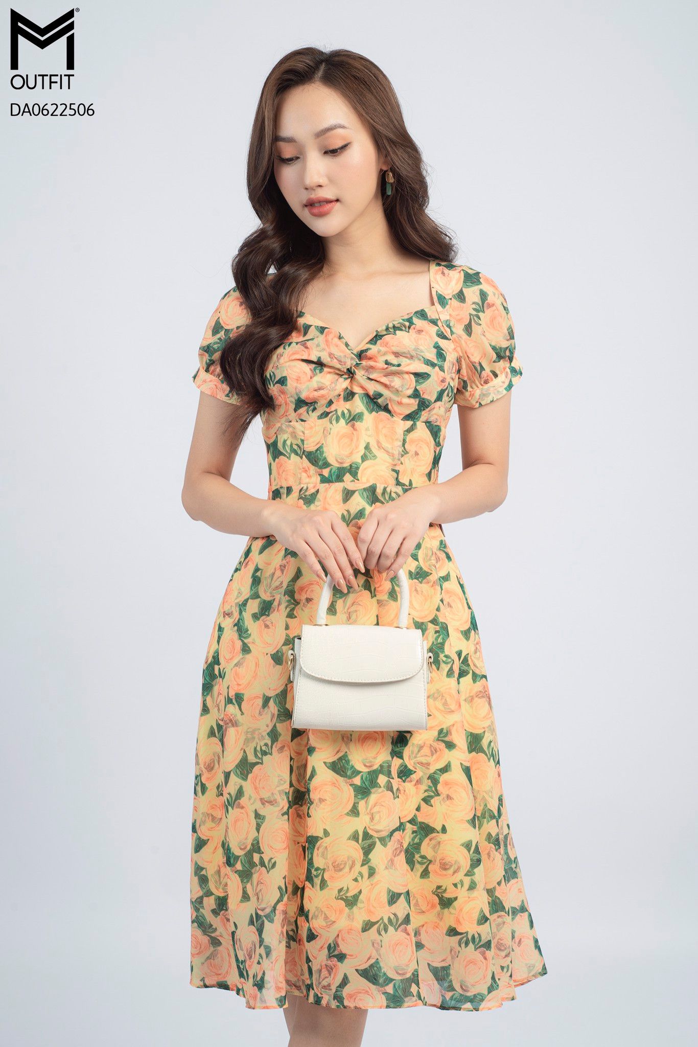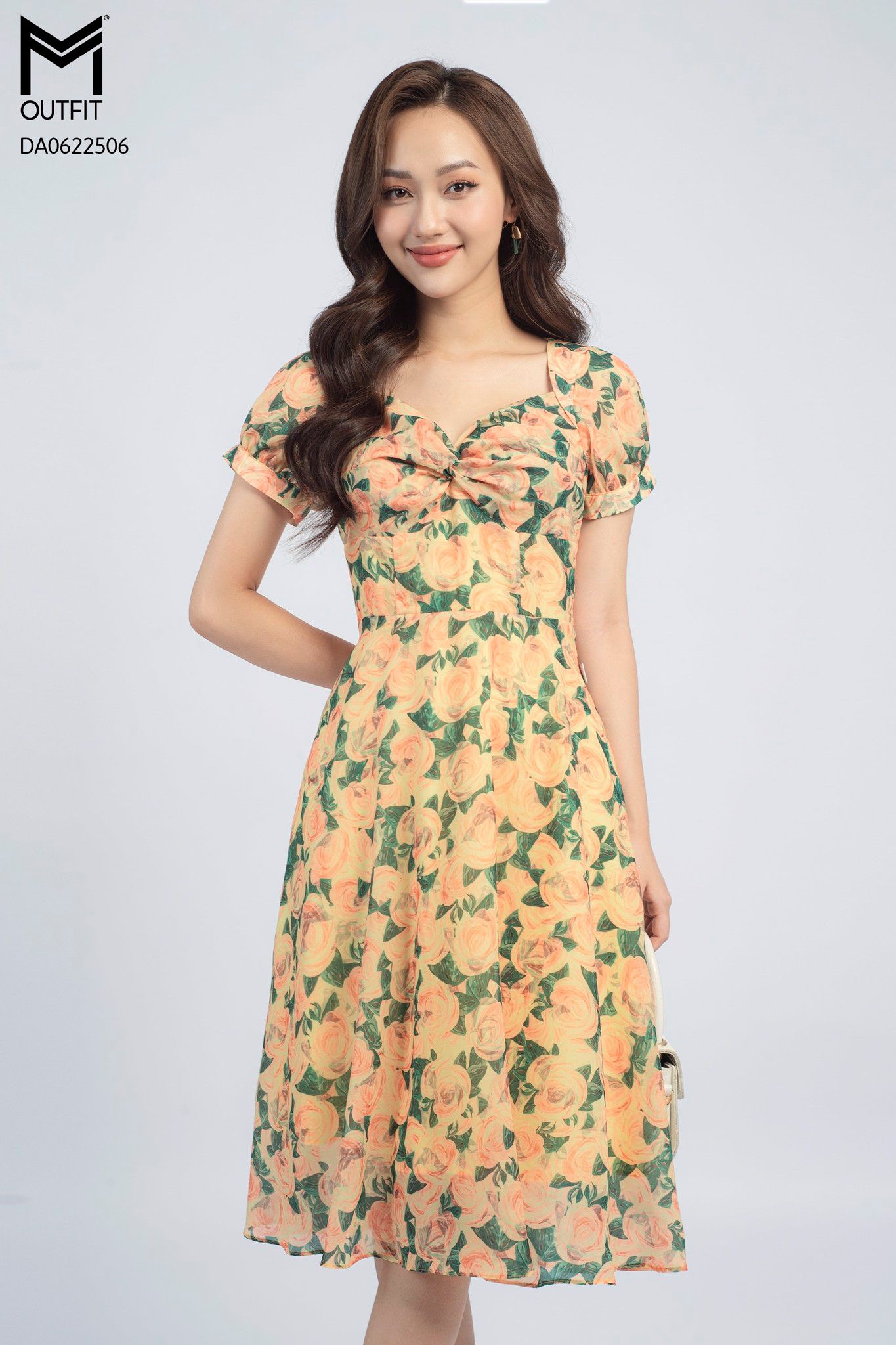 | Đặc điểm | Đầm dáng xòe, cổ U xoắn ngực |