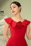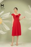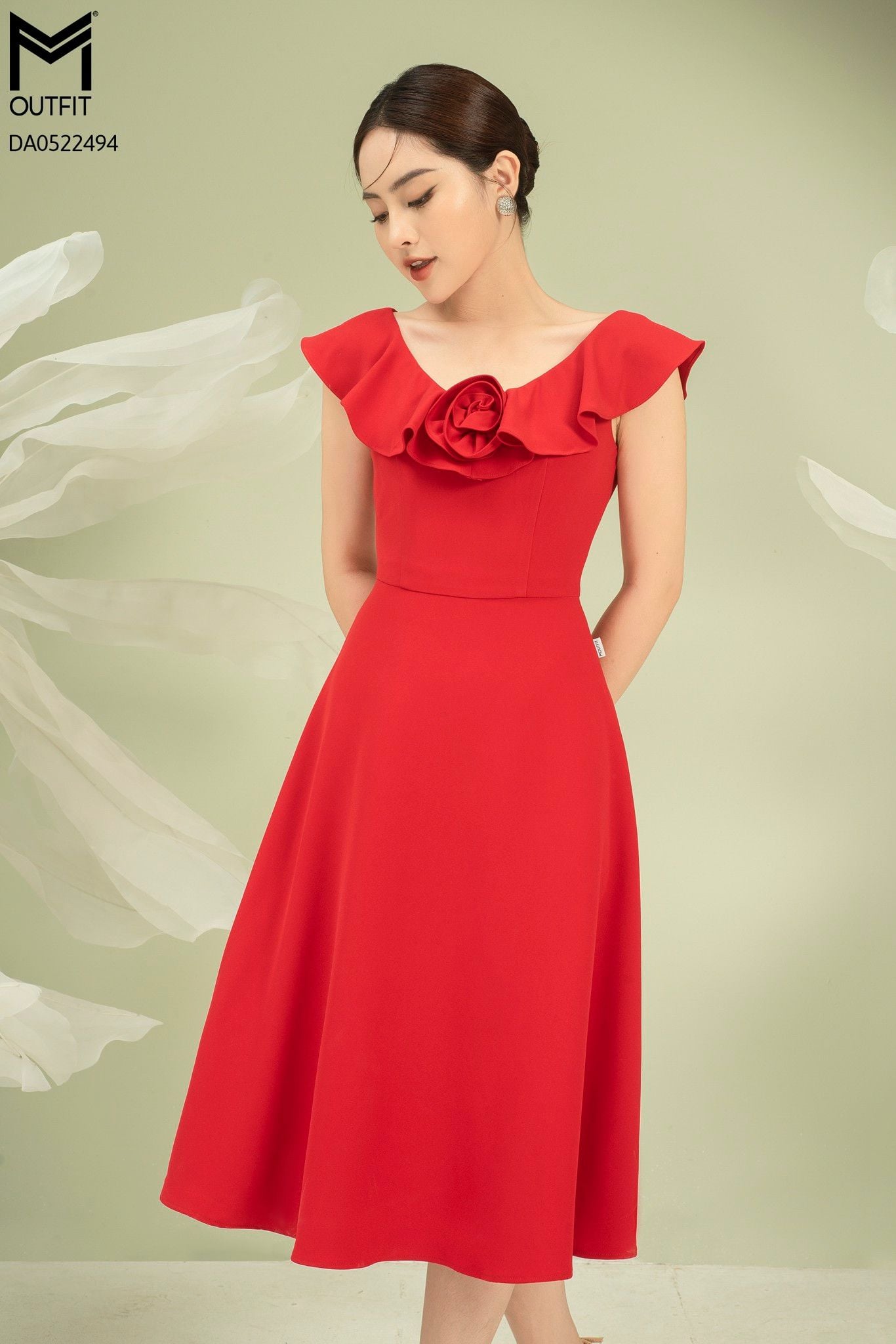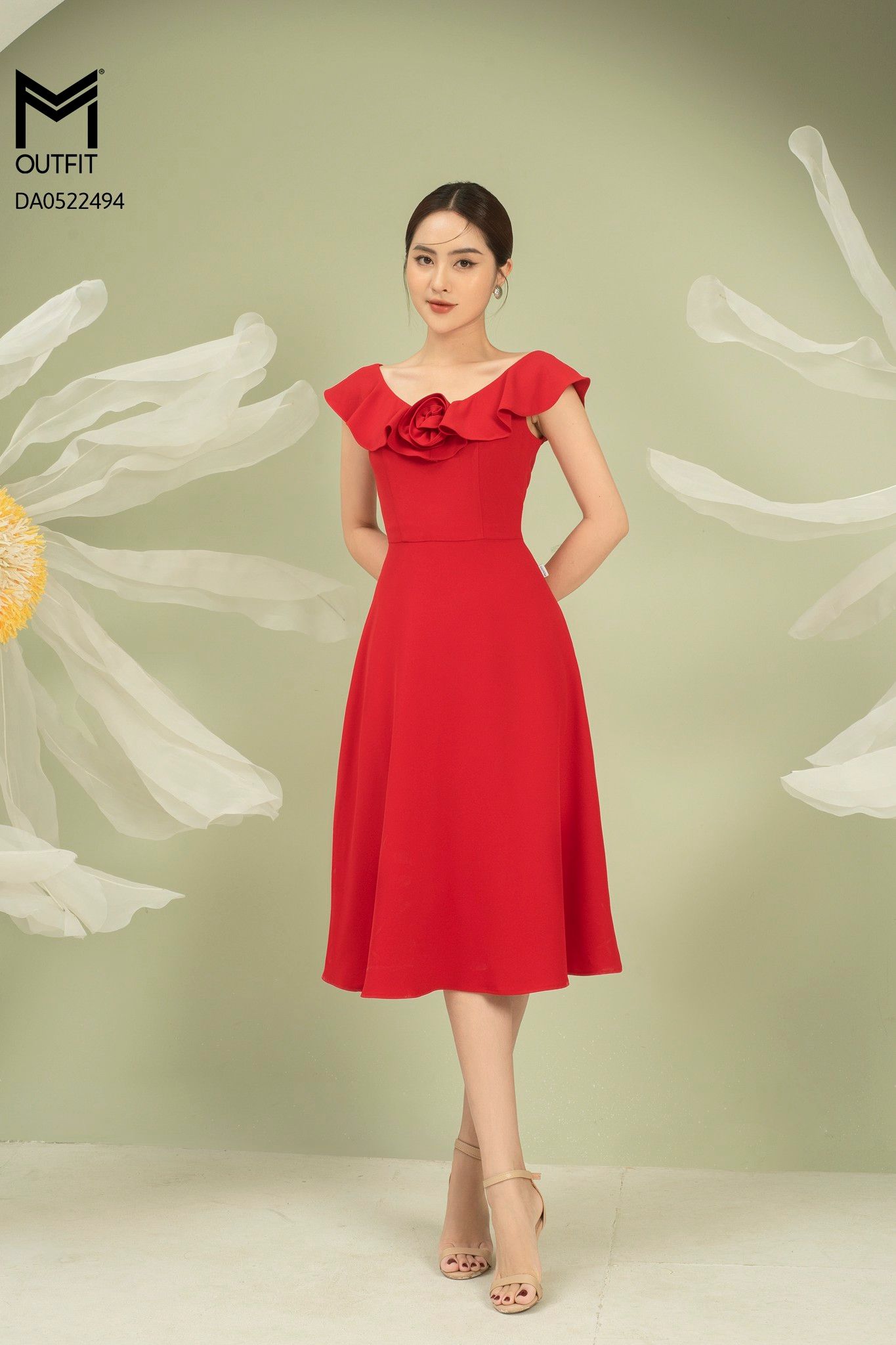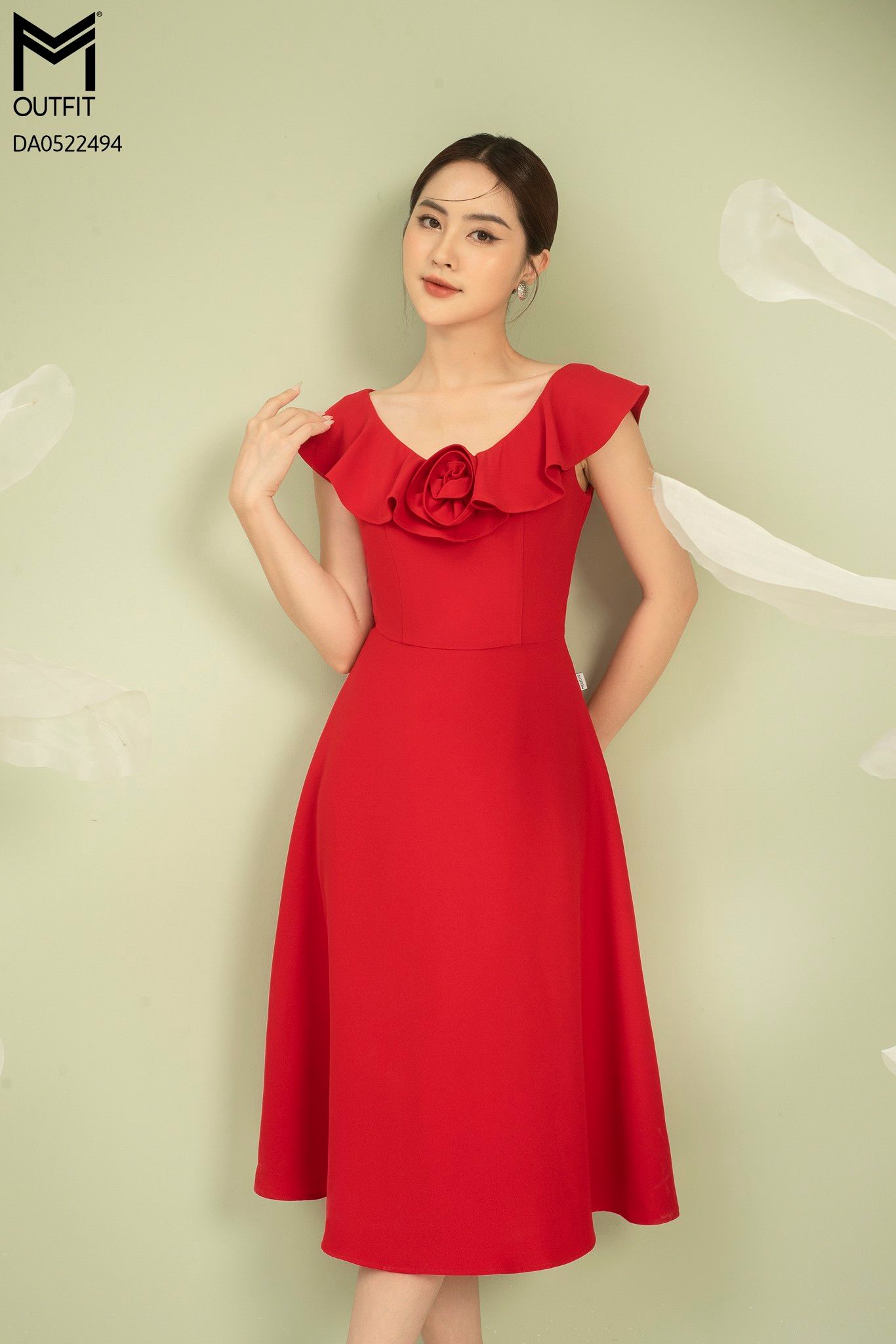 | Đặc điểm | Đầm dáng xòe, cổ V bèo rủ đính hoa TT |