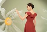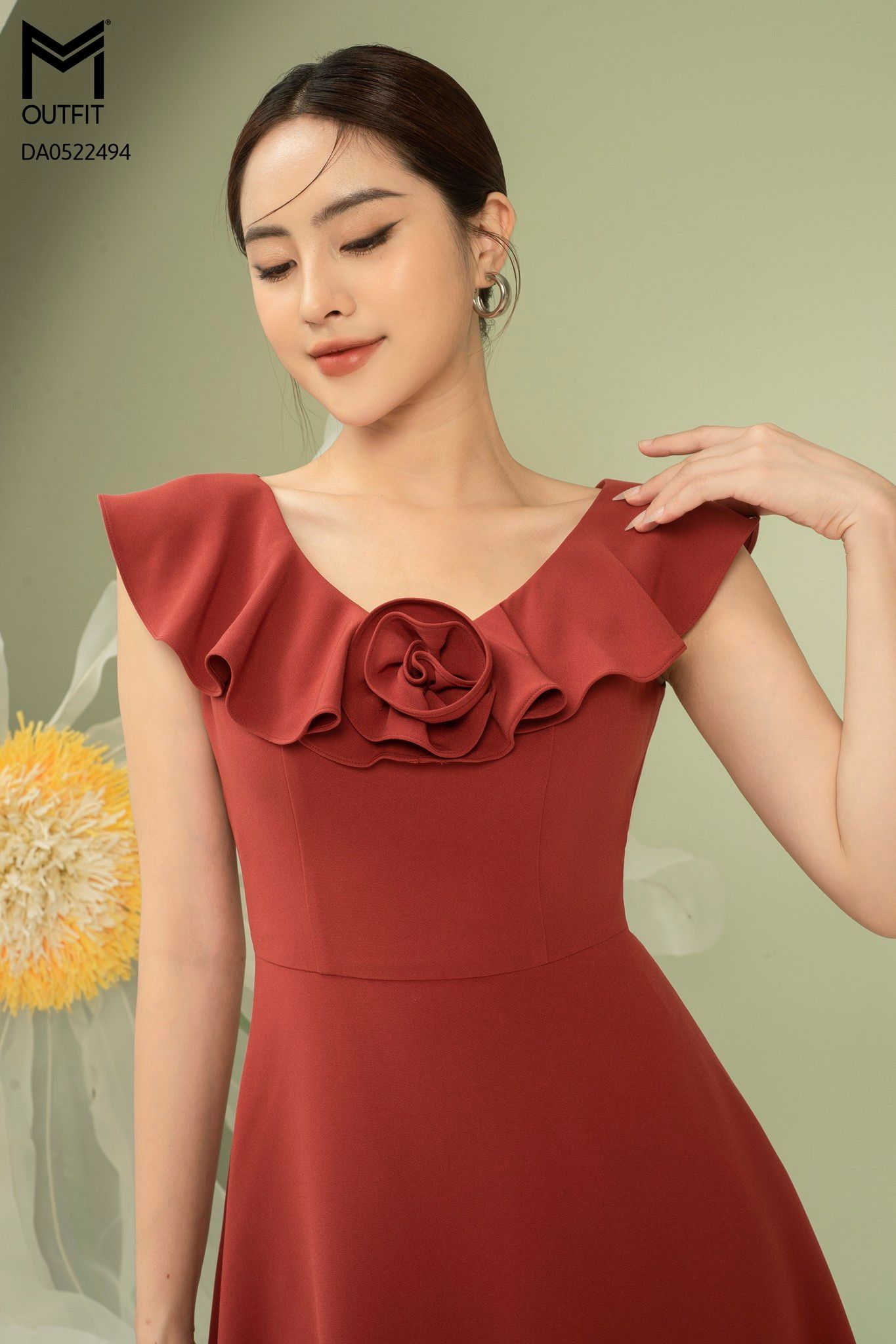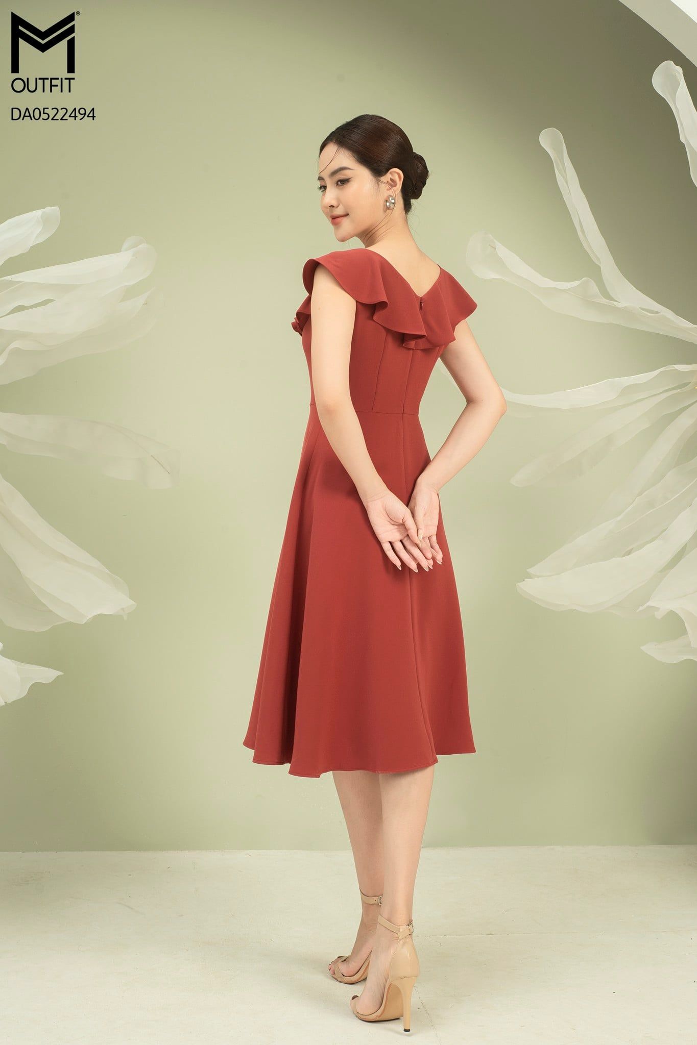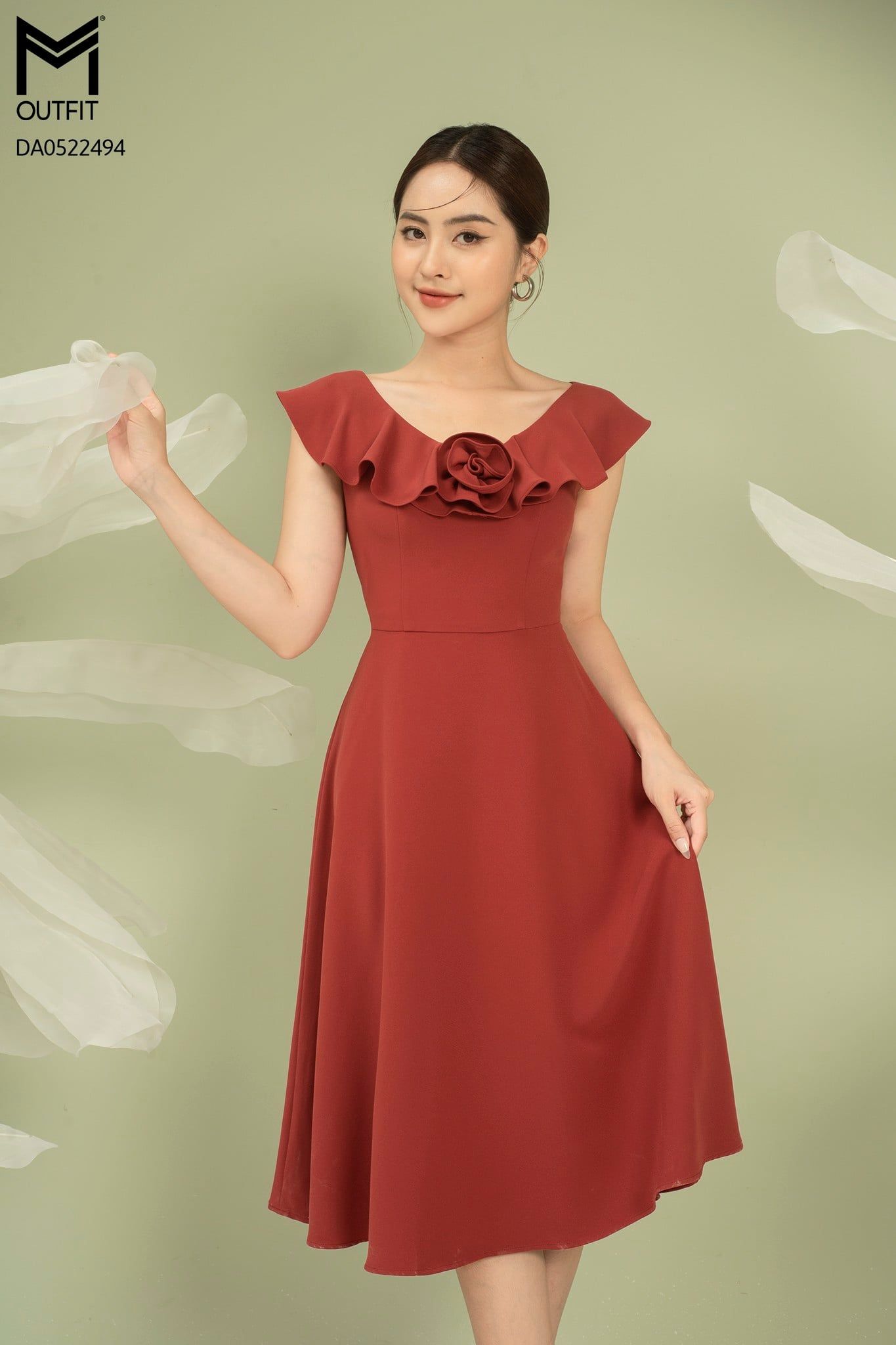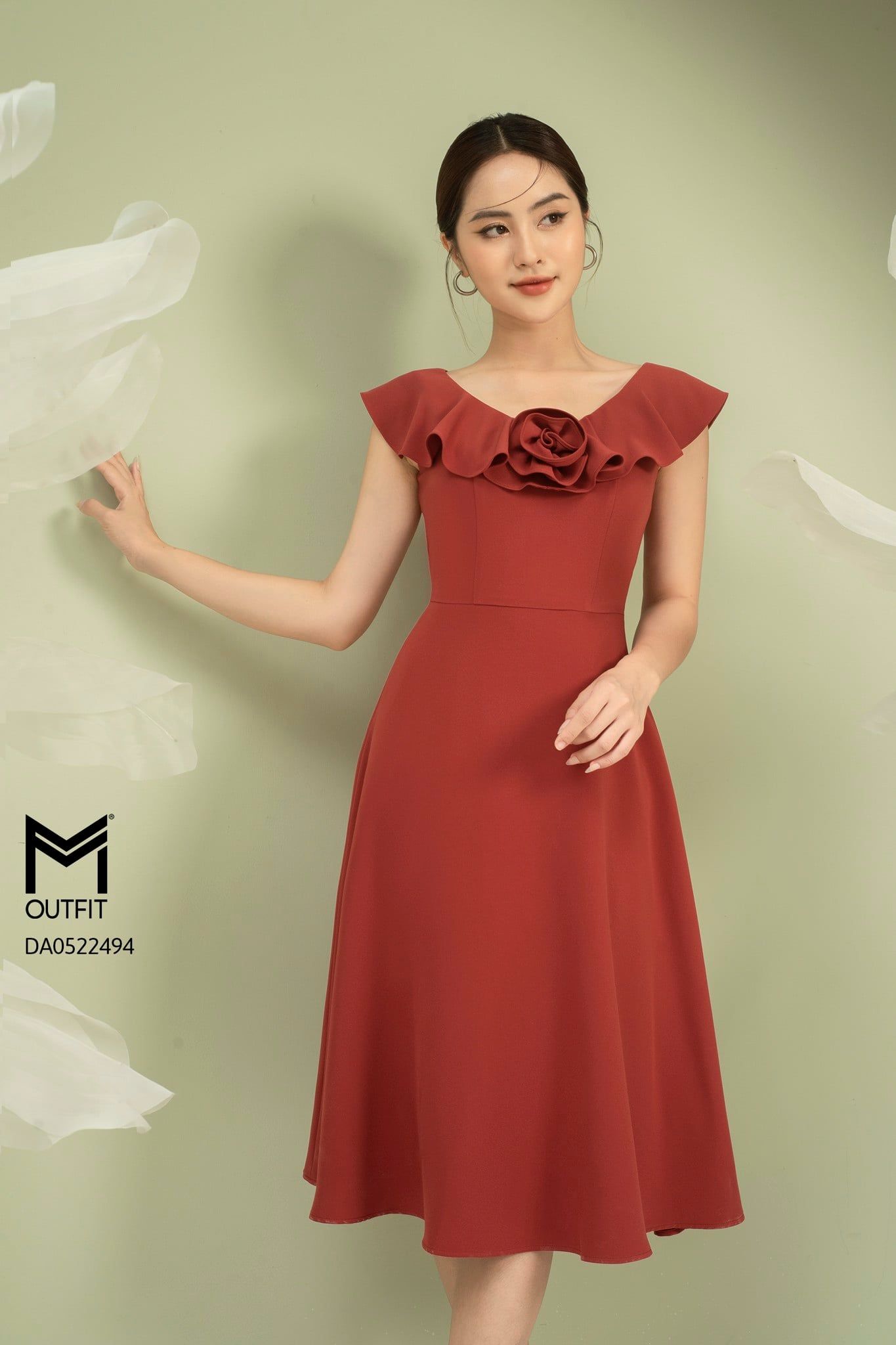 | Đặc điểm | Đầm dáng xòe, cổ V bèo rủ đính hoa TT |