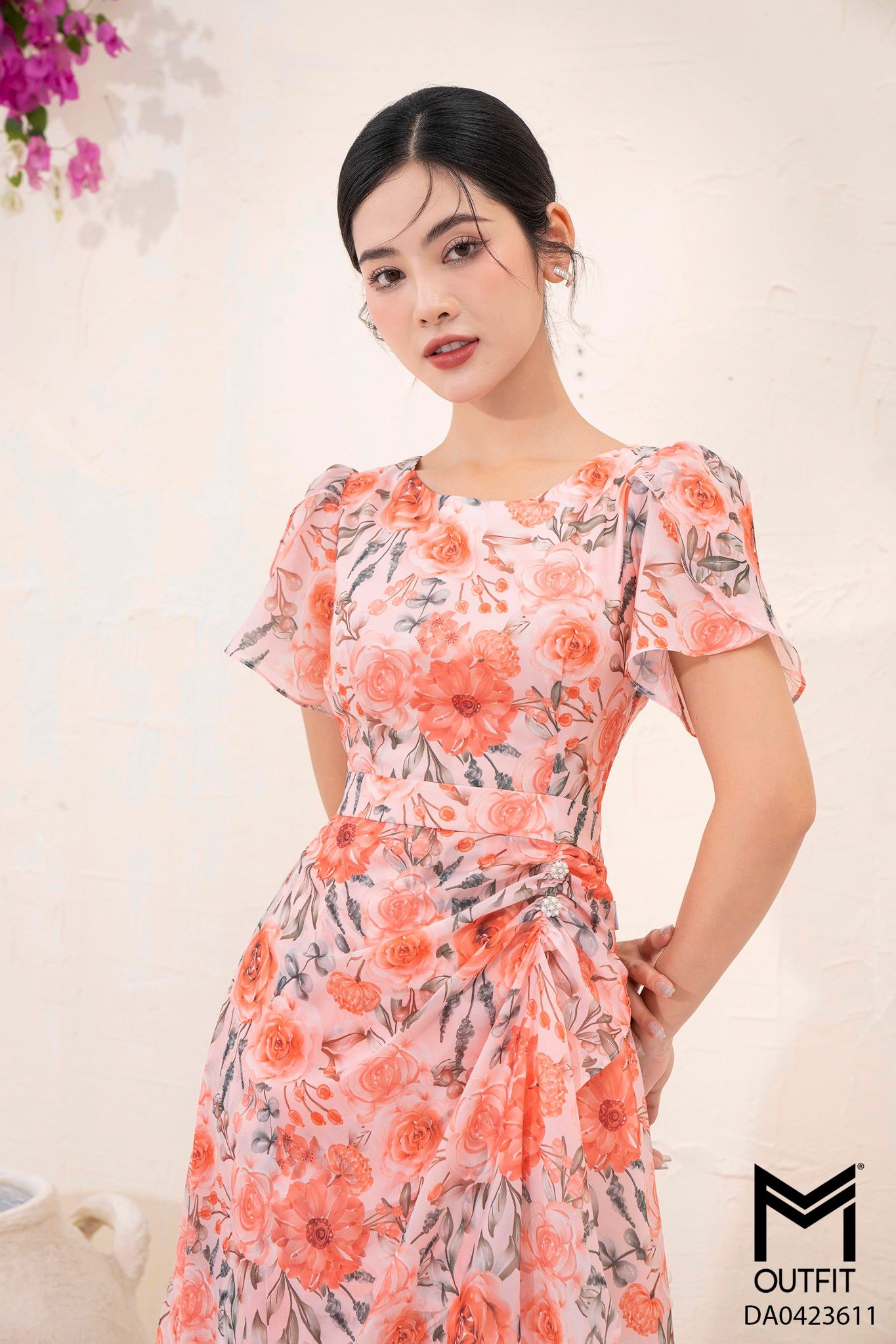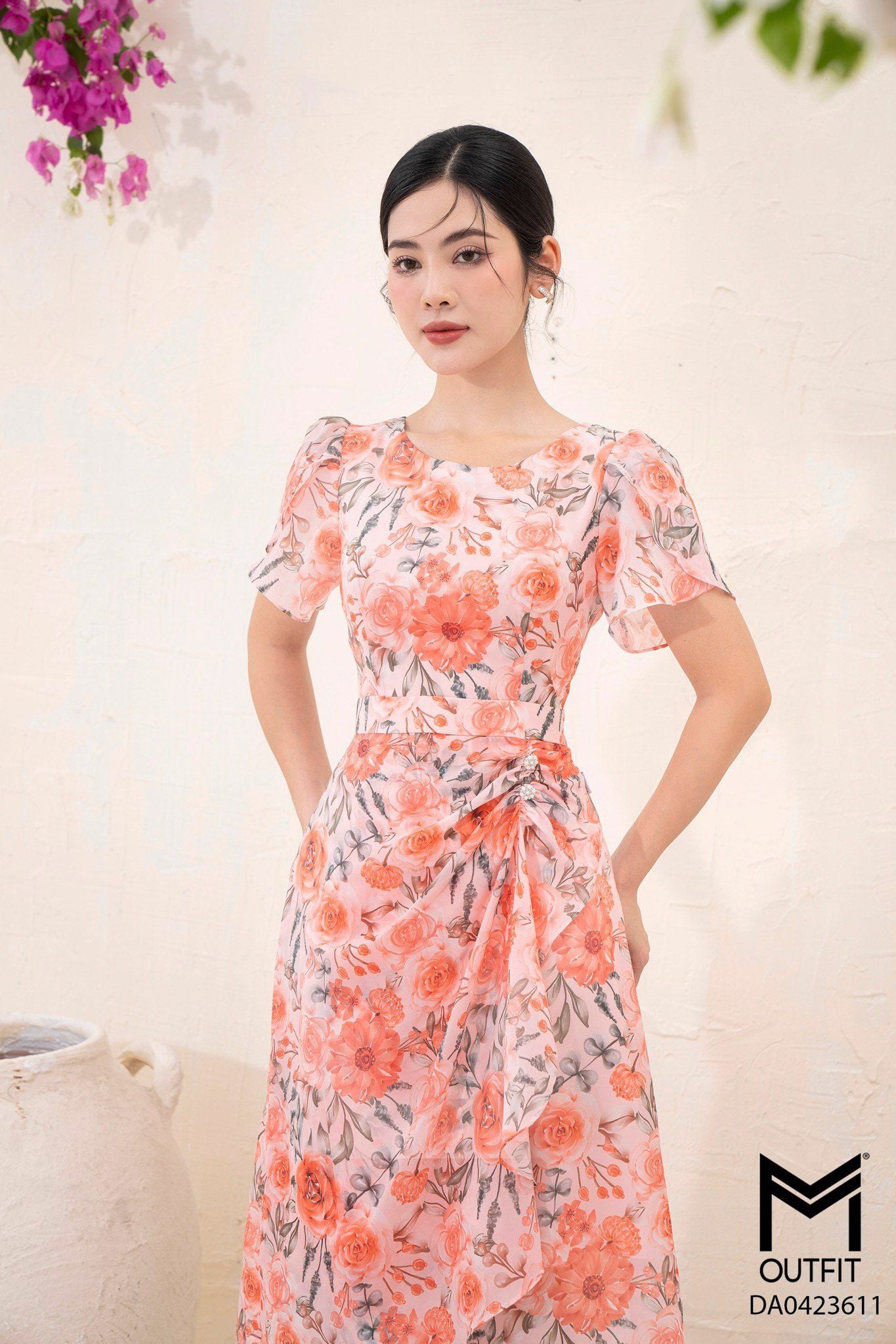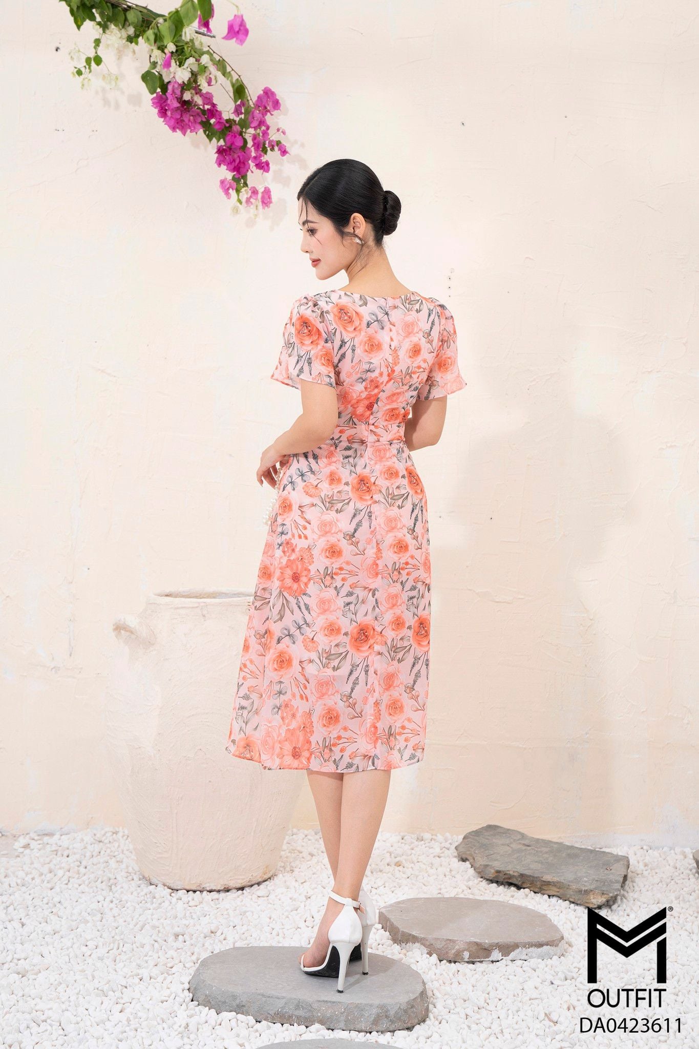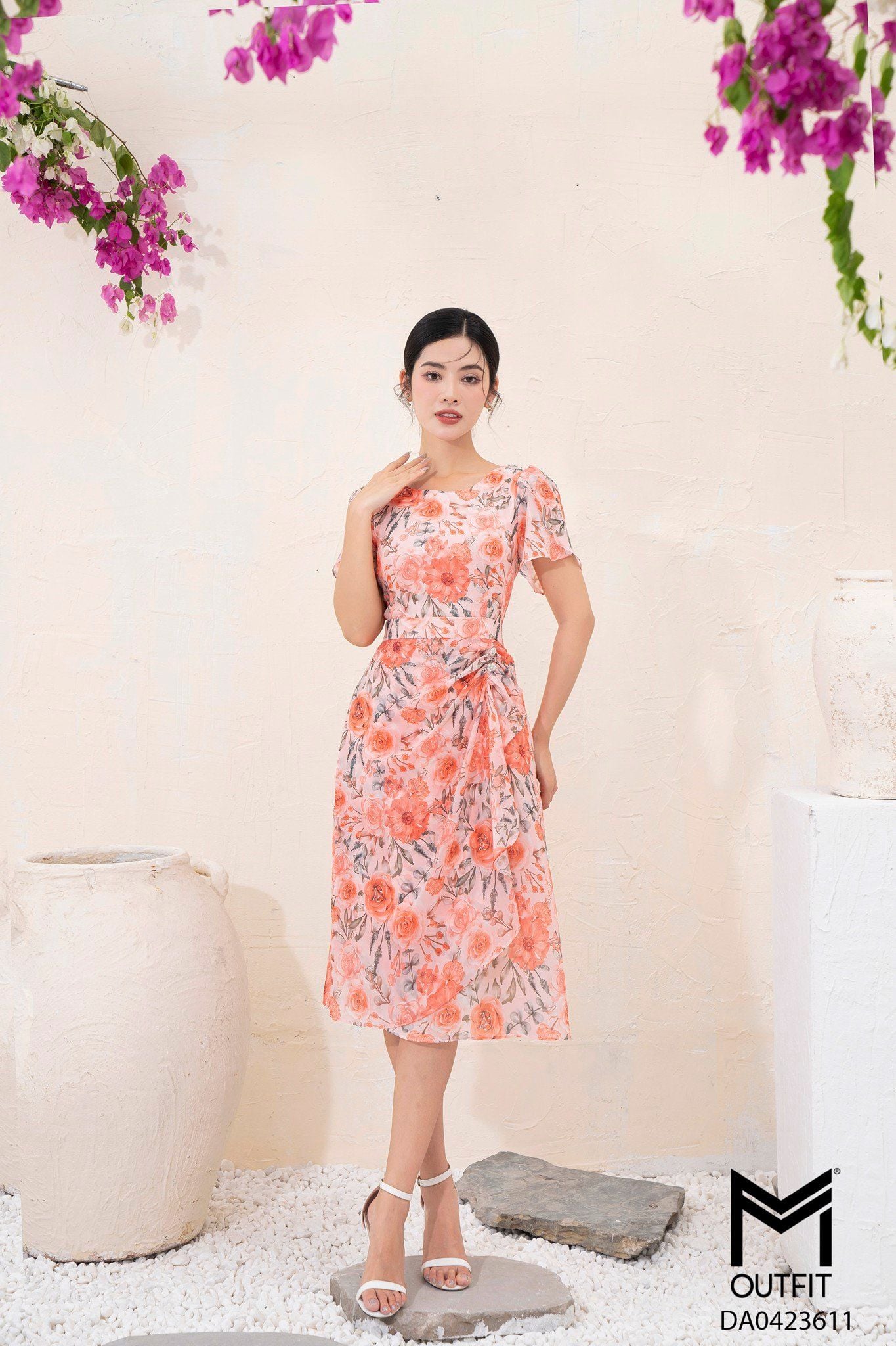 | Đặc điểm | Đầm dáng xòe, tà bong nhún đính cúc |