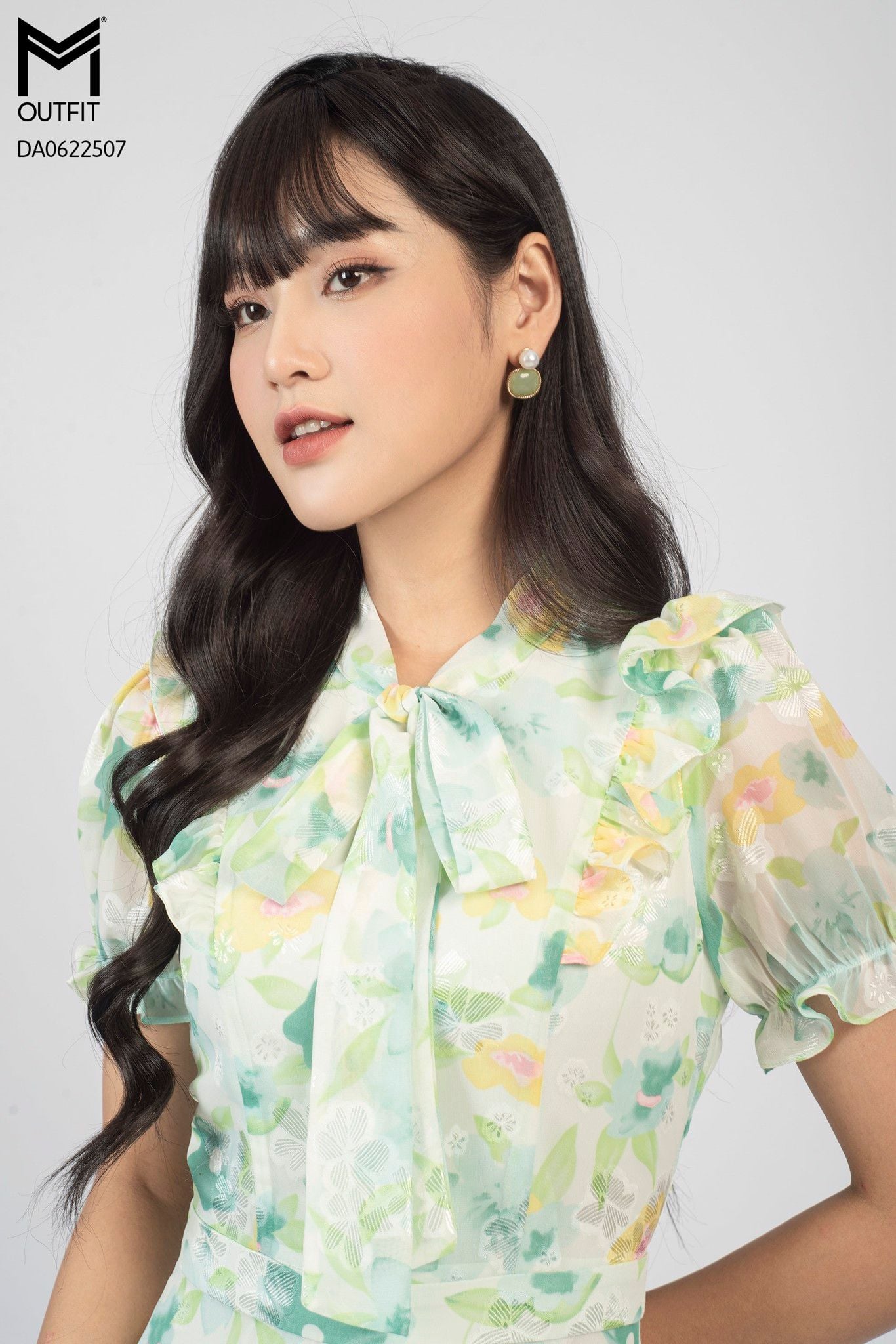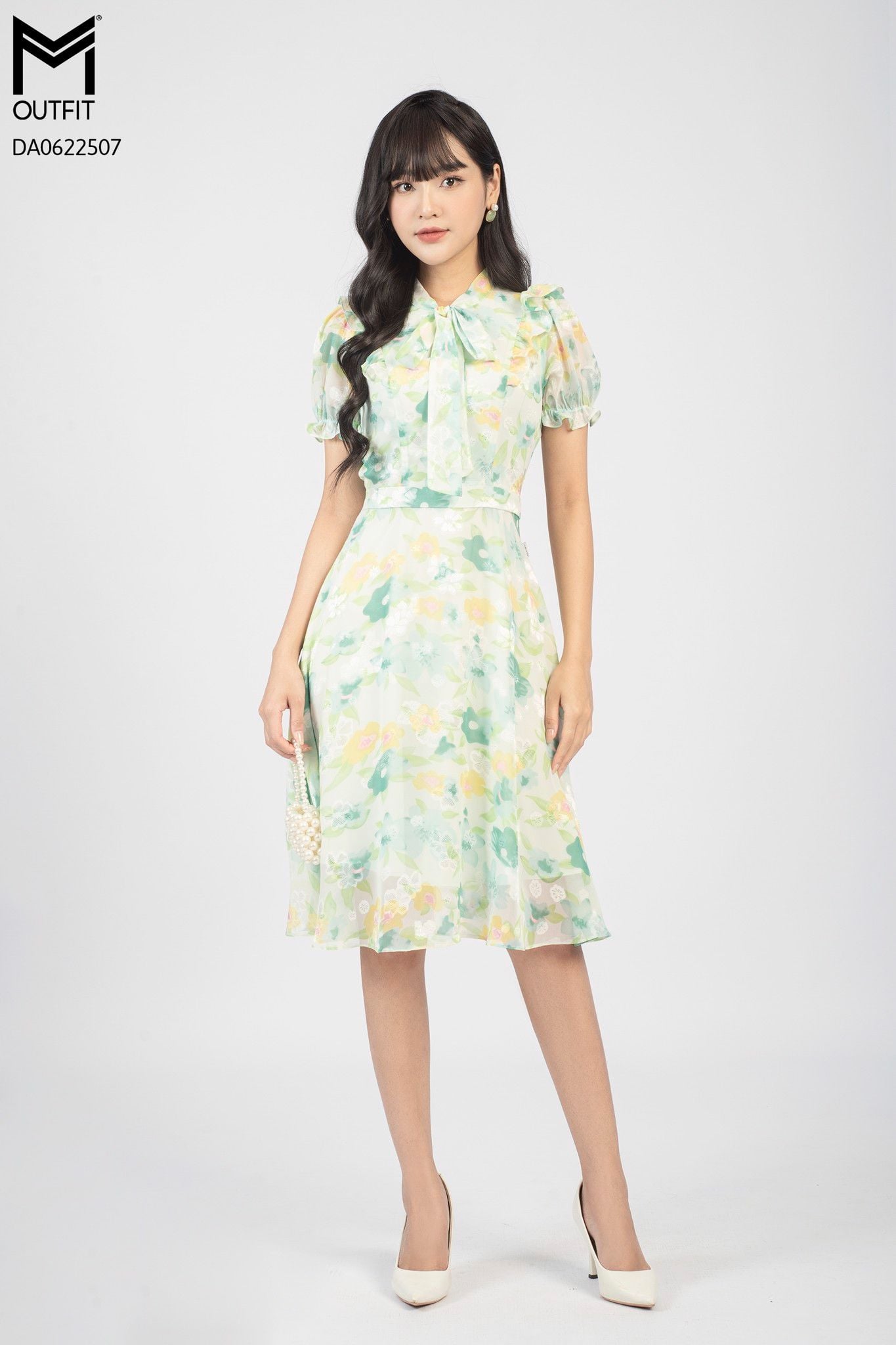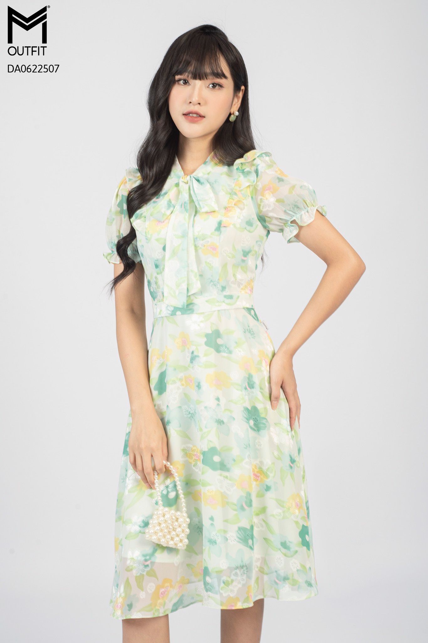 | Đặc điểm | Đầm dáng xòe, tay bo chun, cổ buộc nơ |