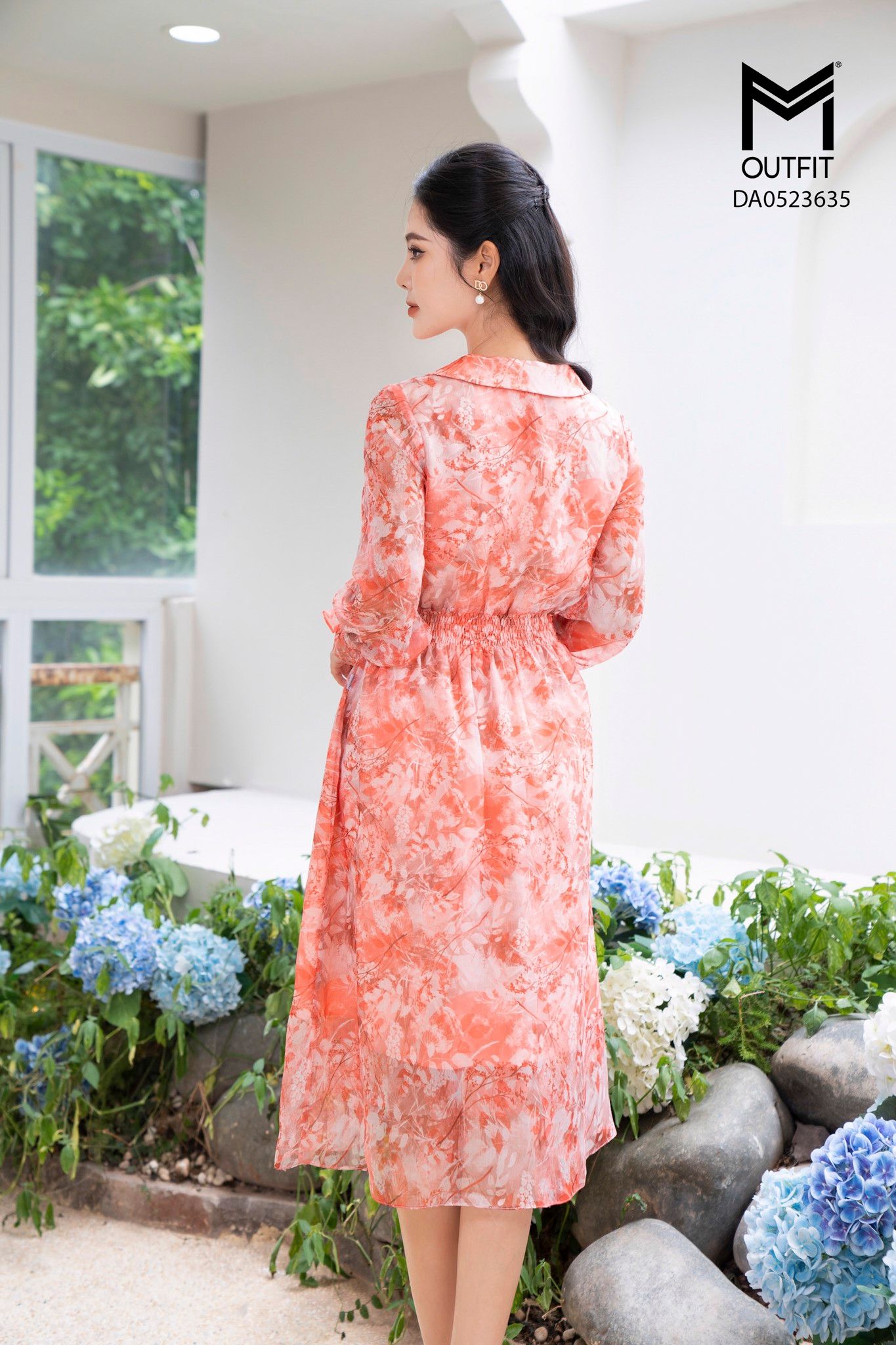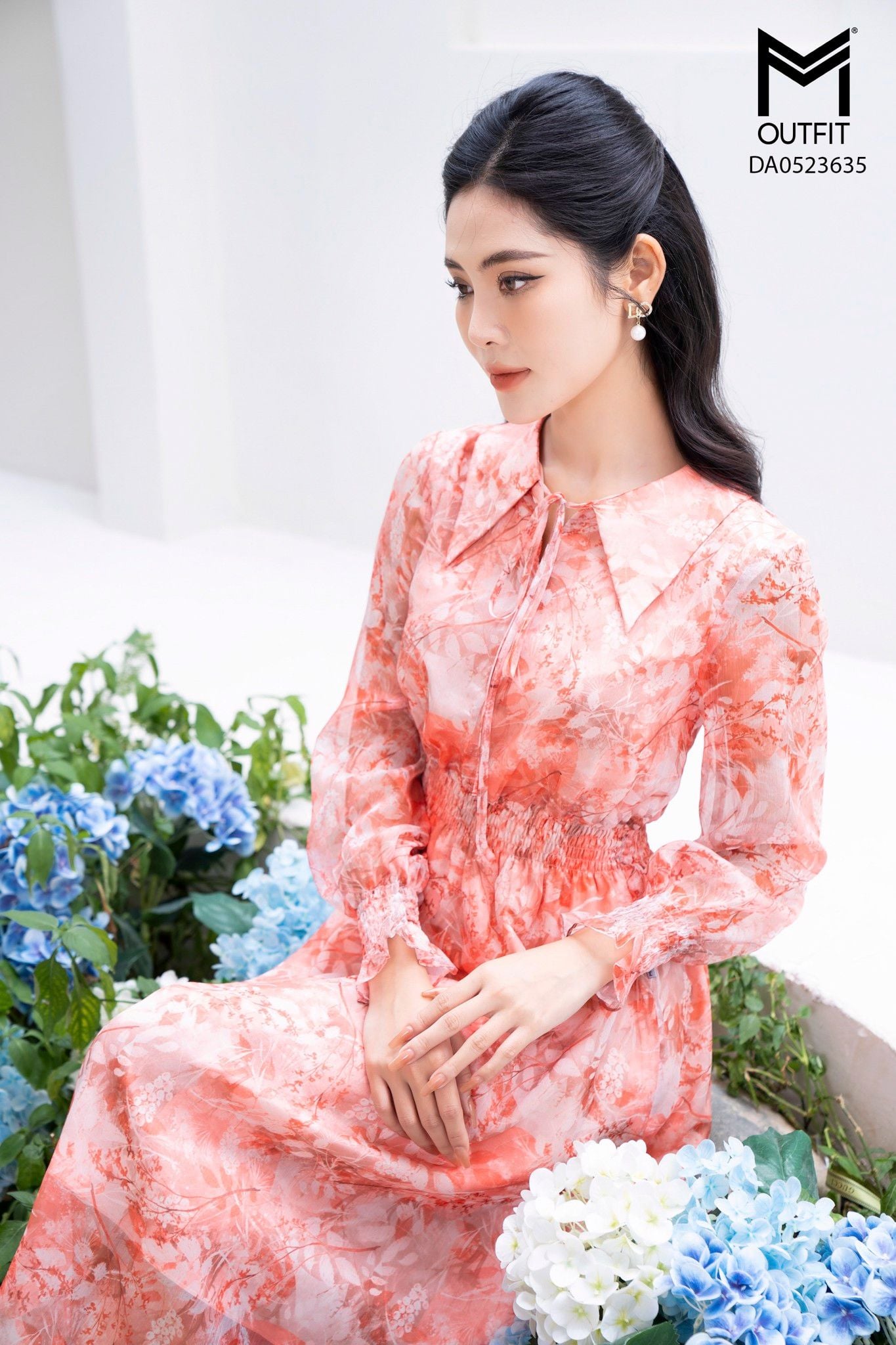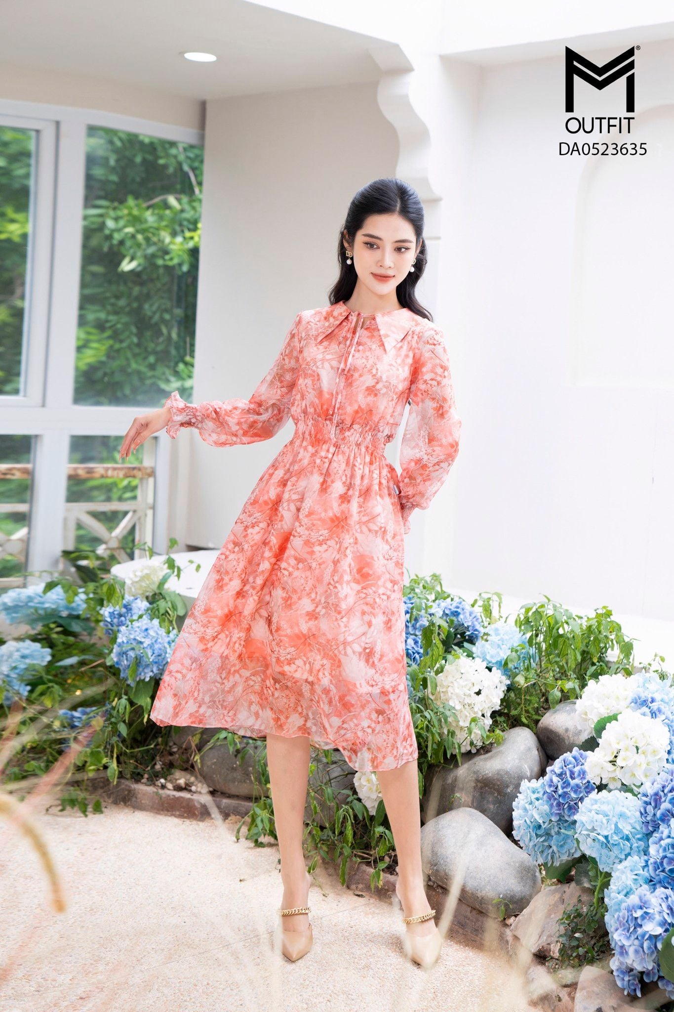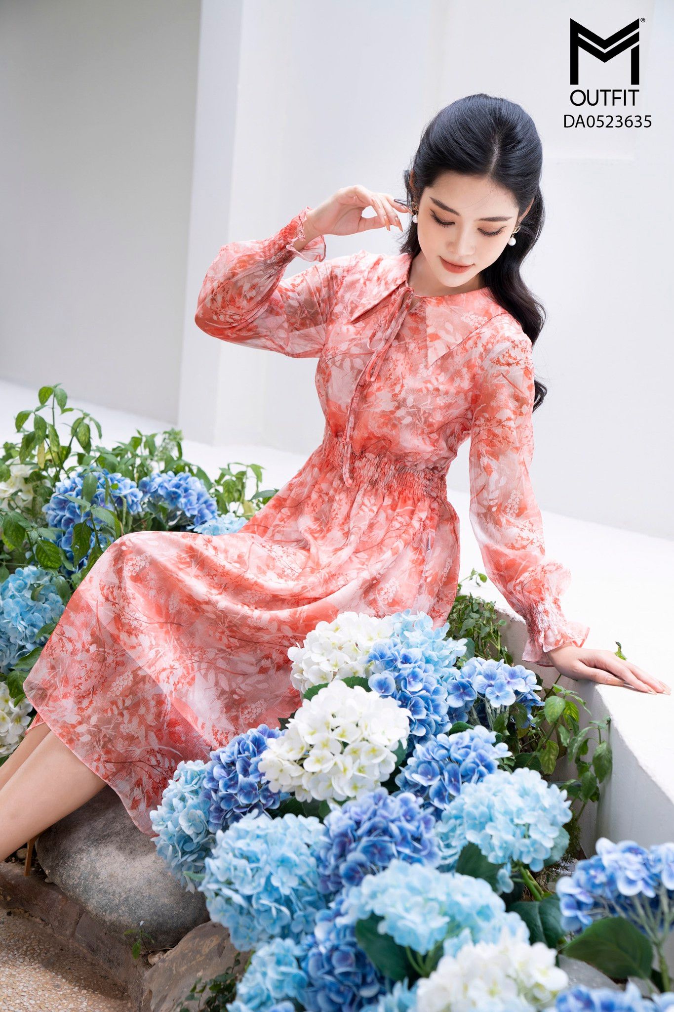 | Đặc điểm | Đầm dáng xòe, tay dài, cổ buộc nơ |