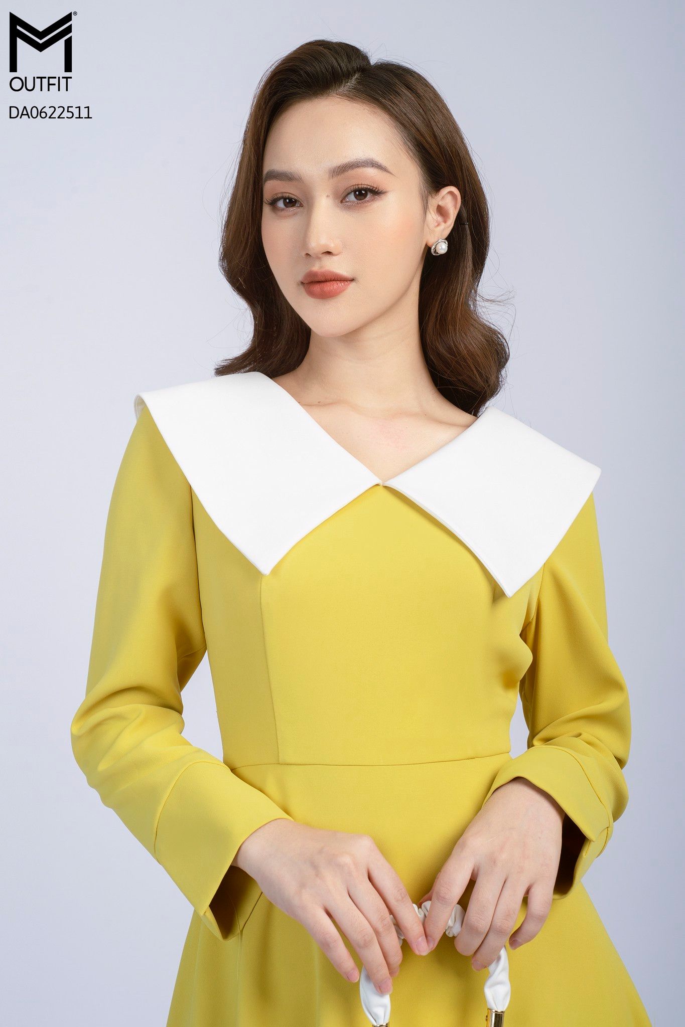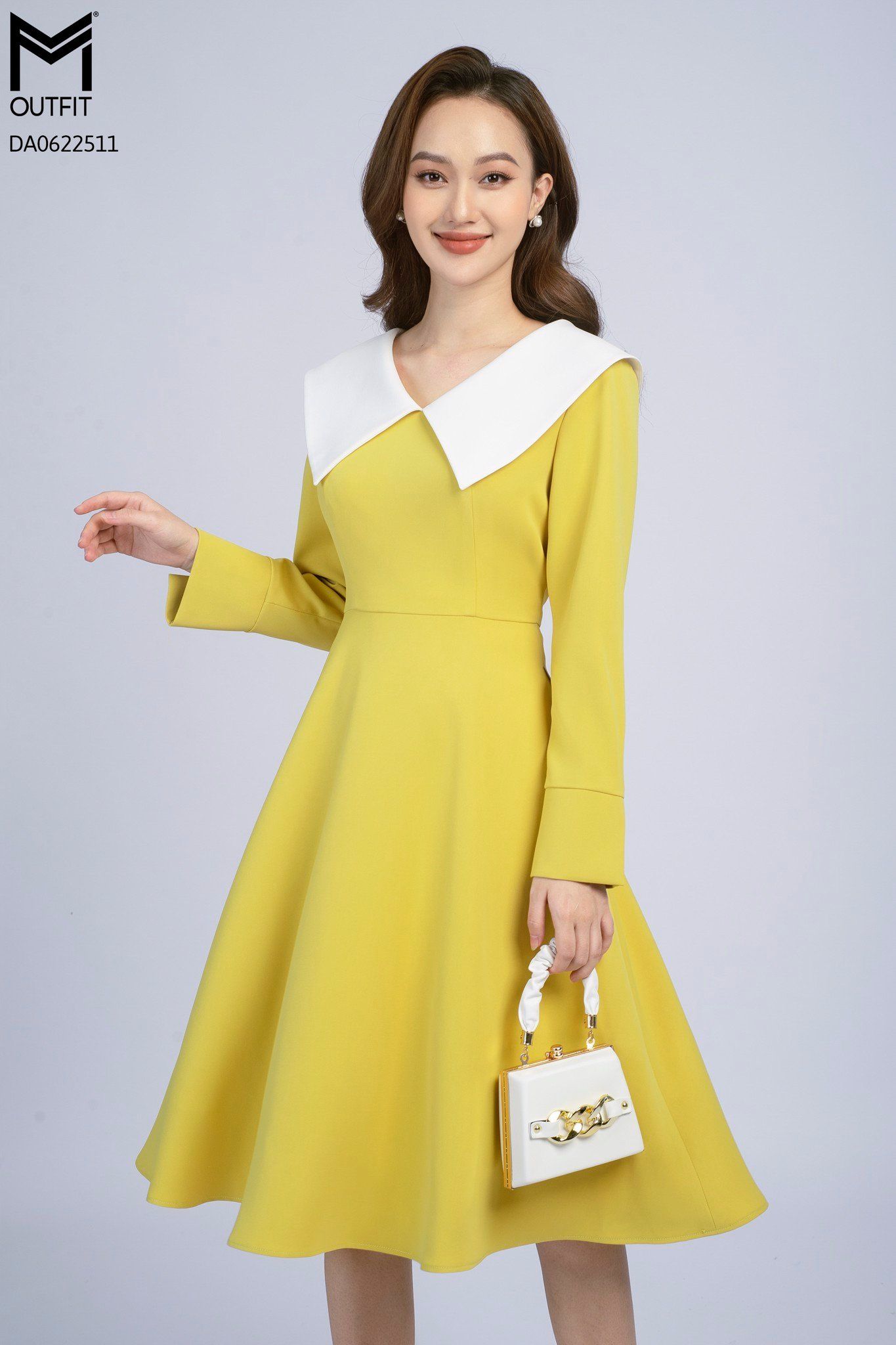 | Đặc điểm | Đầm dáng xòe, tay dài, cổ phối trắng |