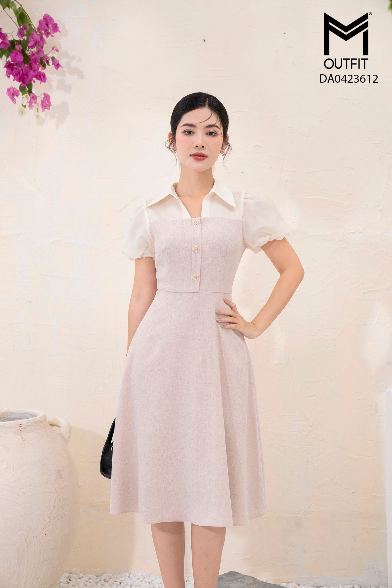 | Đặc điểm | Đầm dáng xòe, tay lồng đèn phối voan |