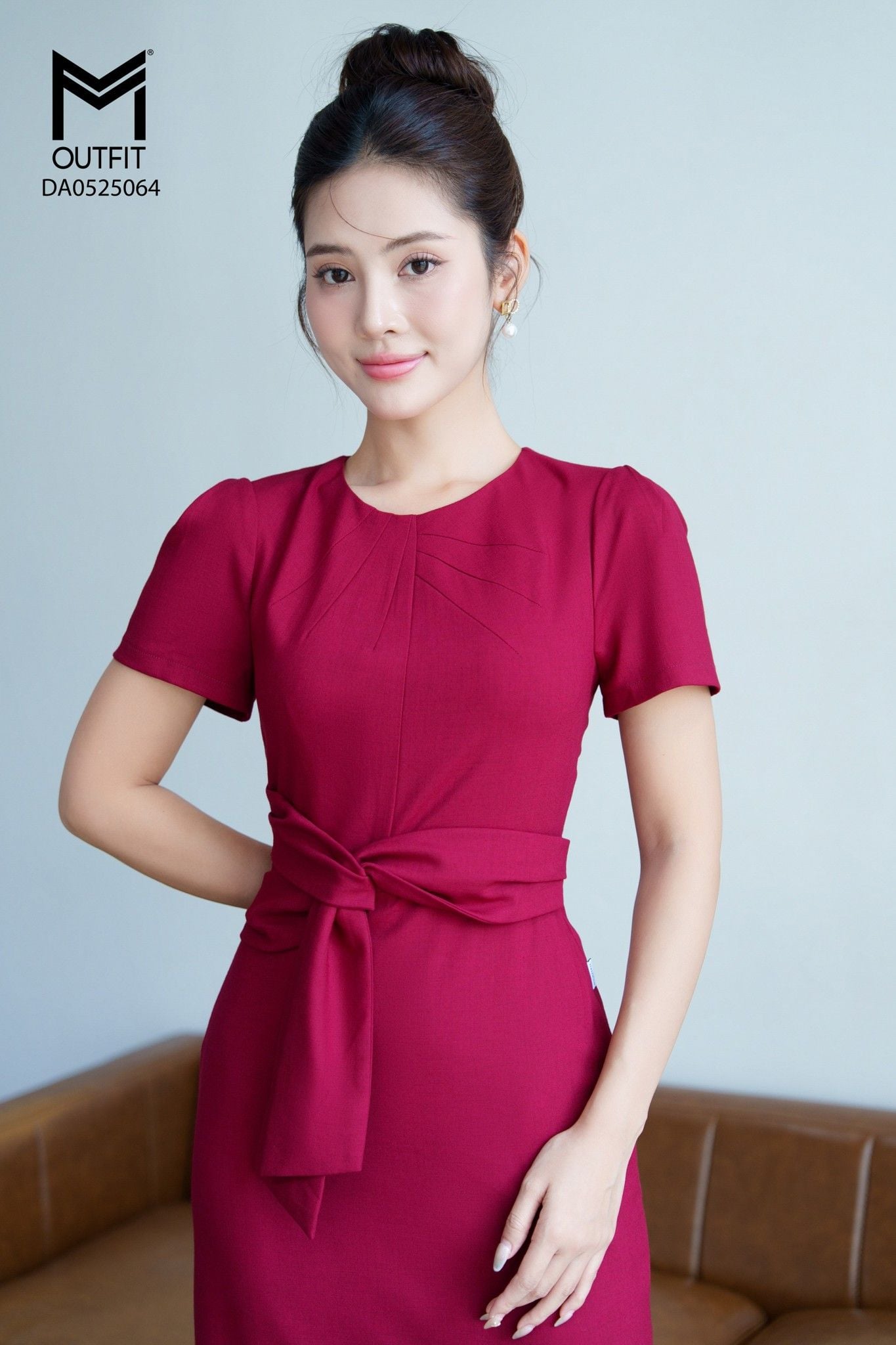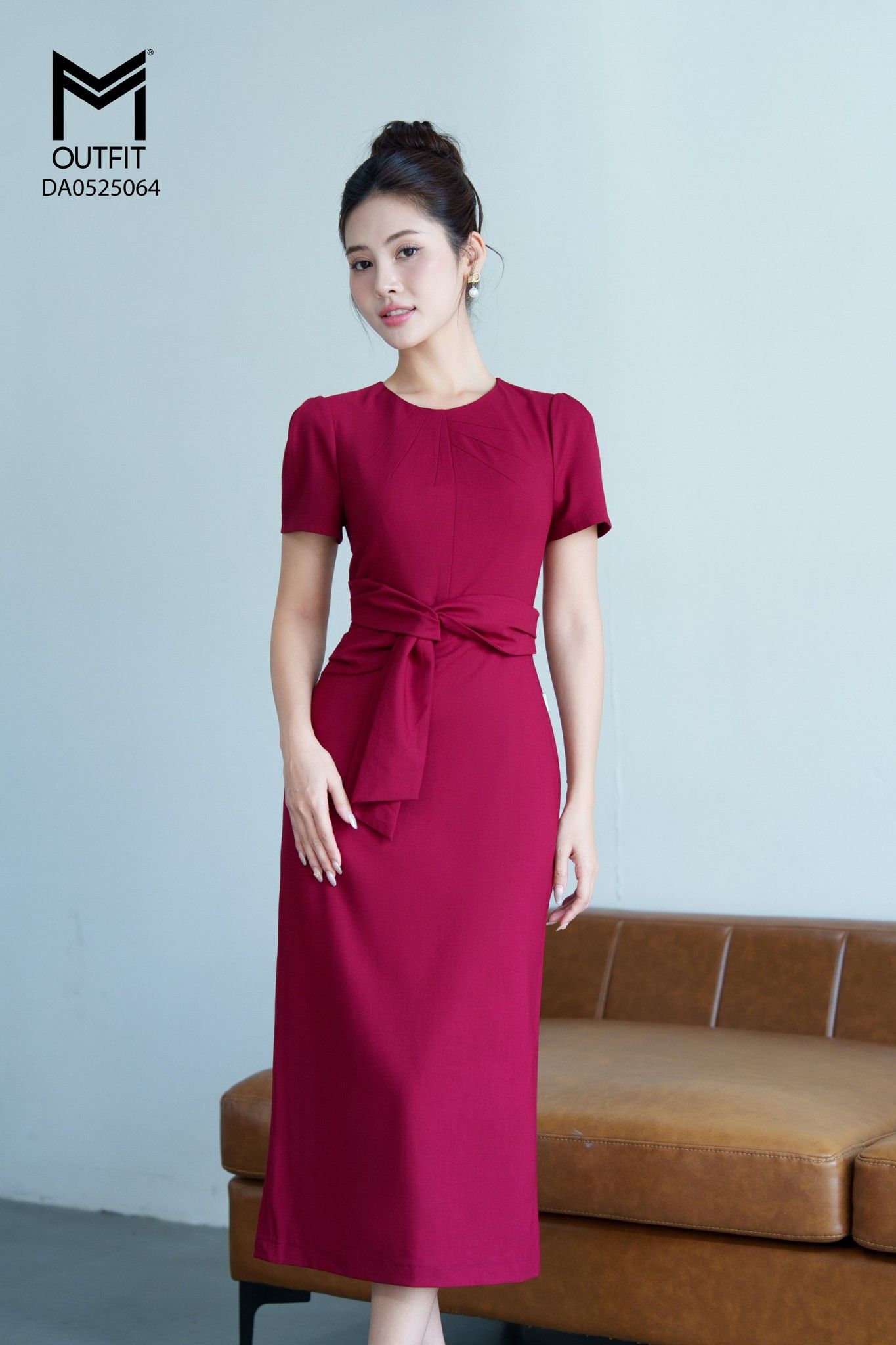 | Đặc điểm | Đầm ôm cổ tròn có dây nơ trang trí eo |