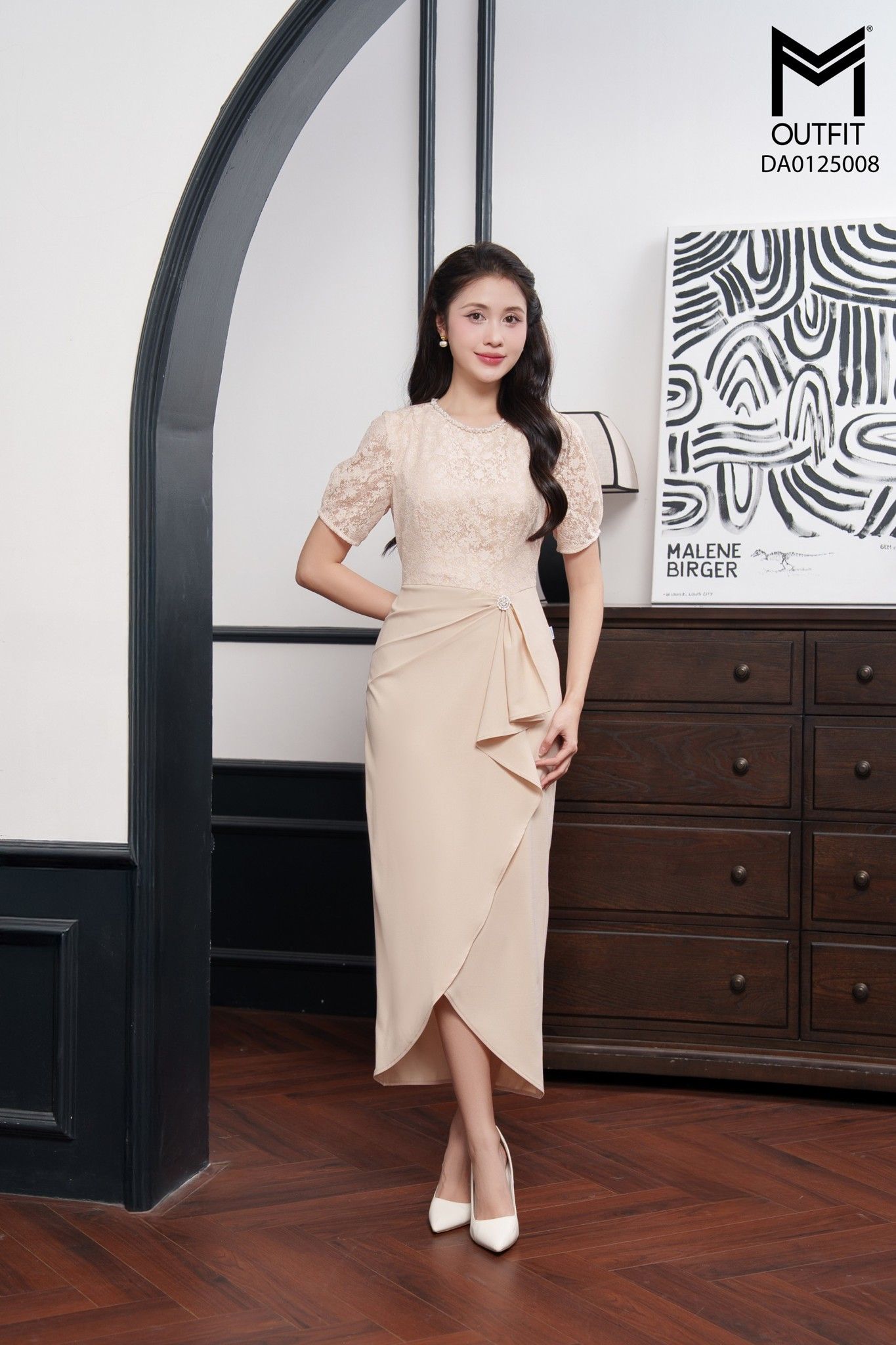 | Đặc điểm | Đầm ôm pha ren tay nhún bồng cổ đính dây đá |