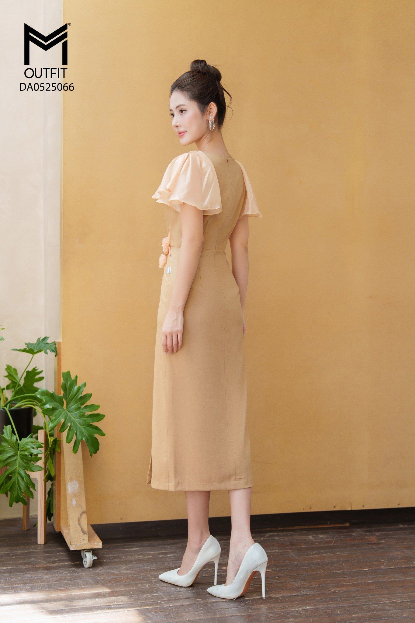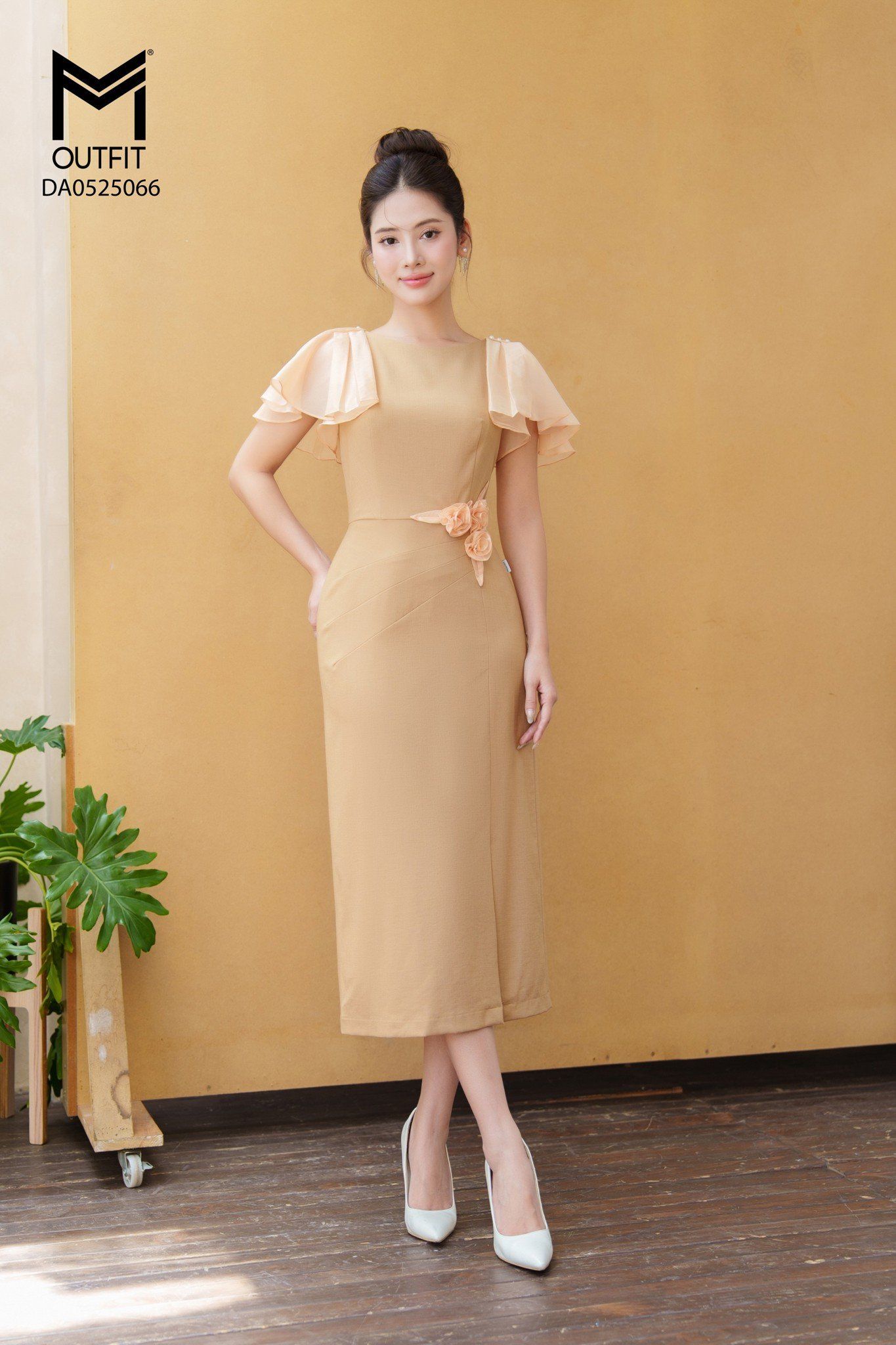 | Đặc điểm | Đầm ôm tay phối tơ xếp ly đính hoa eo |