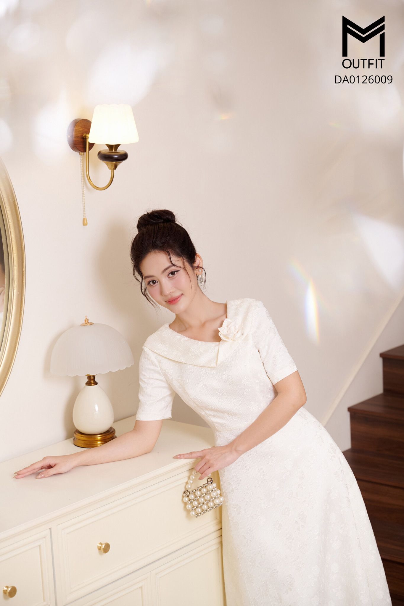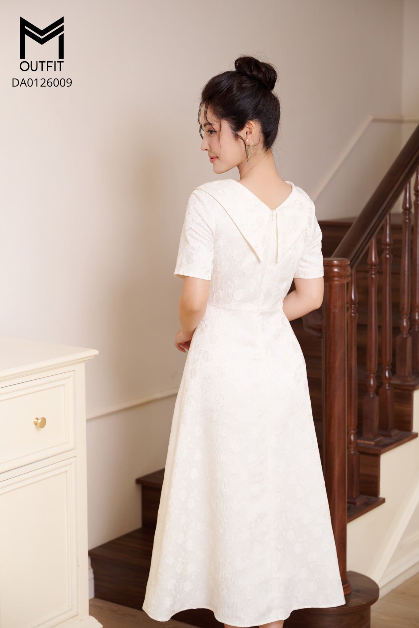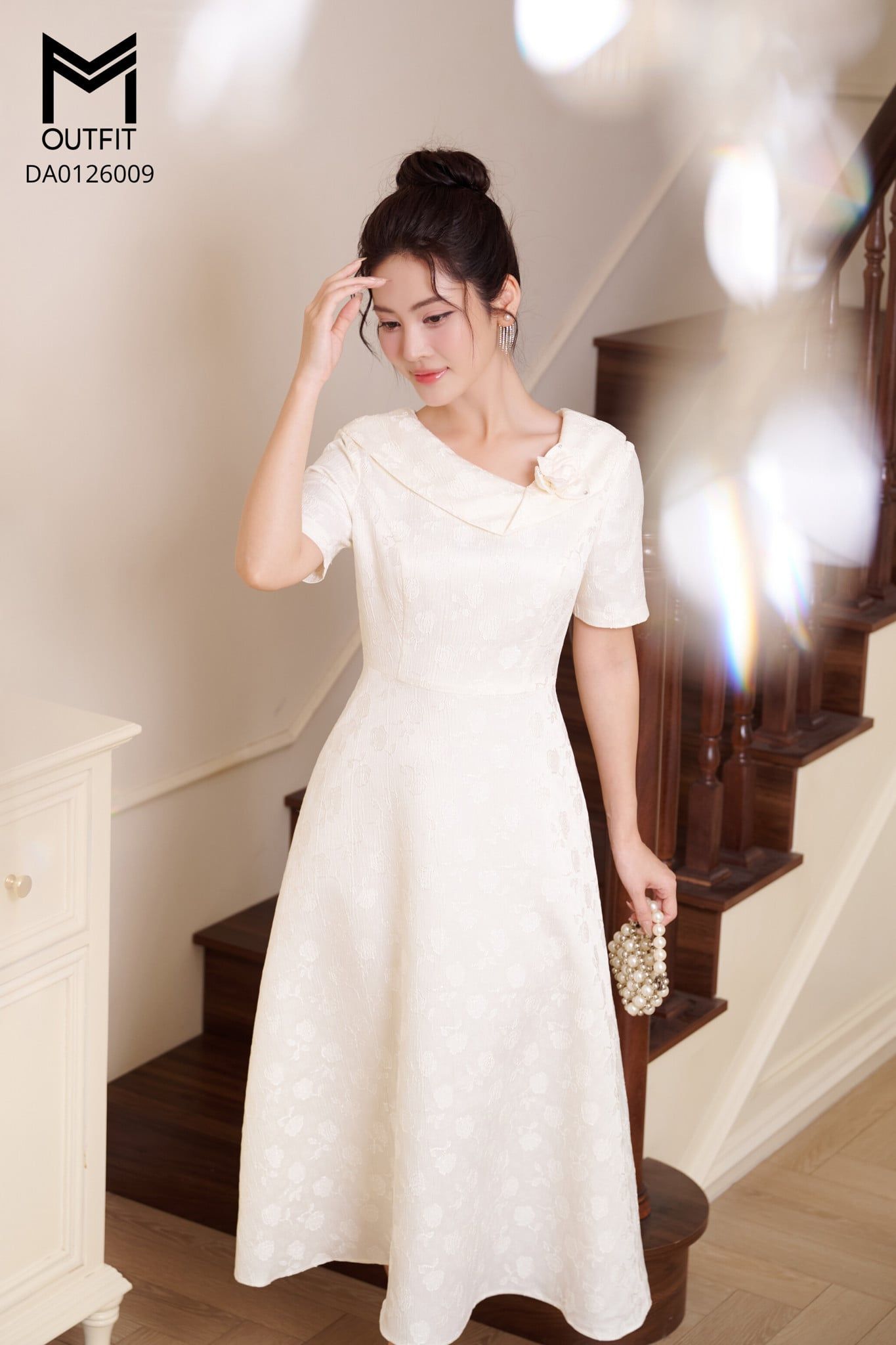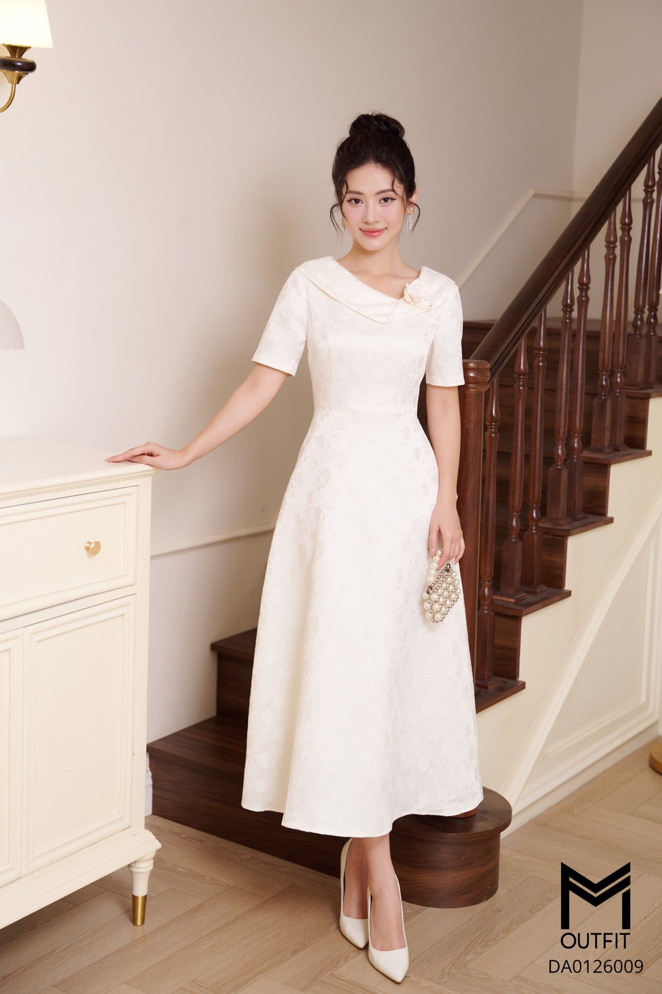 | Đặc điểm | Đầm tiệc dáng A cổ tà bong xoắn đính hoa |