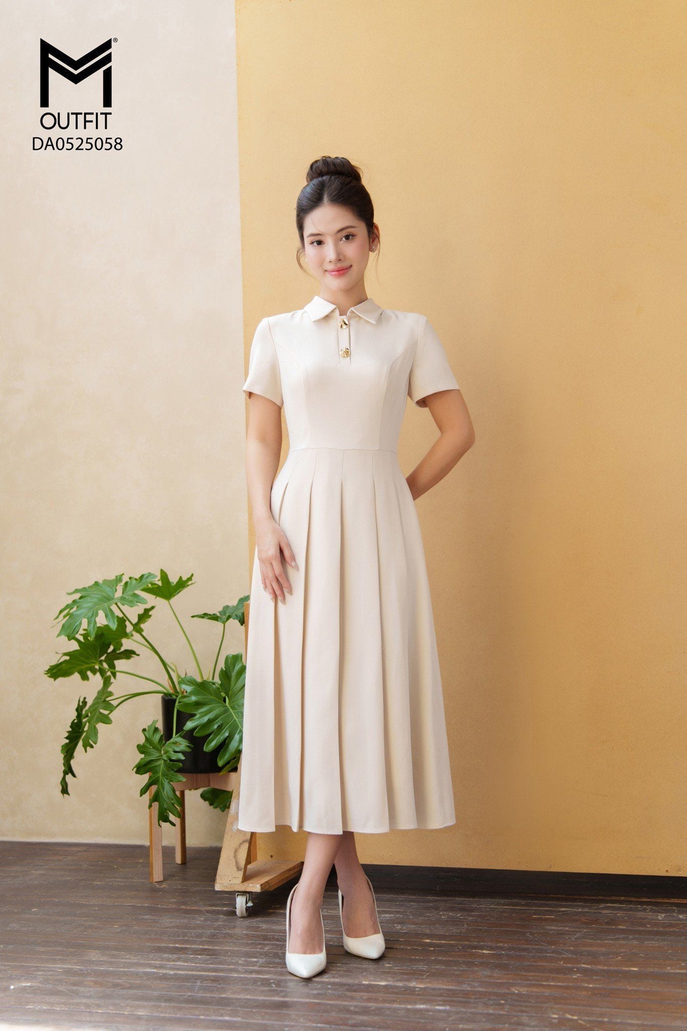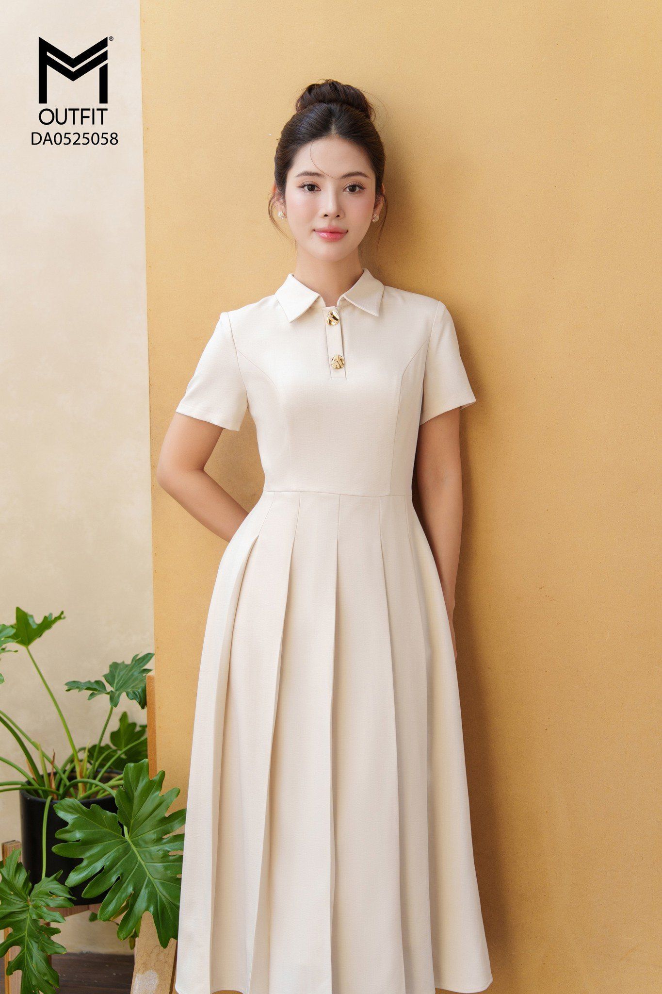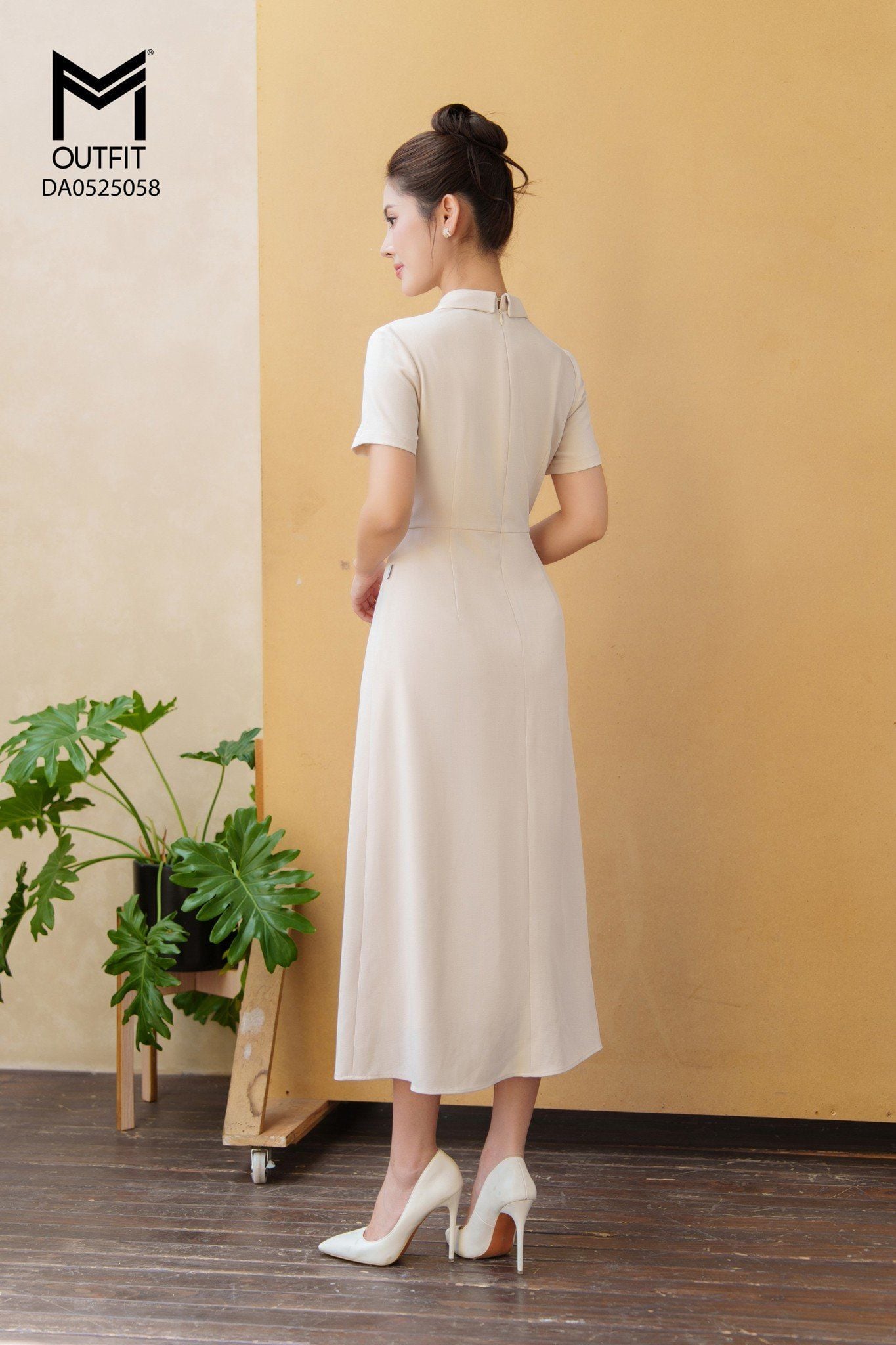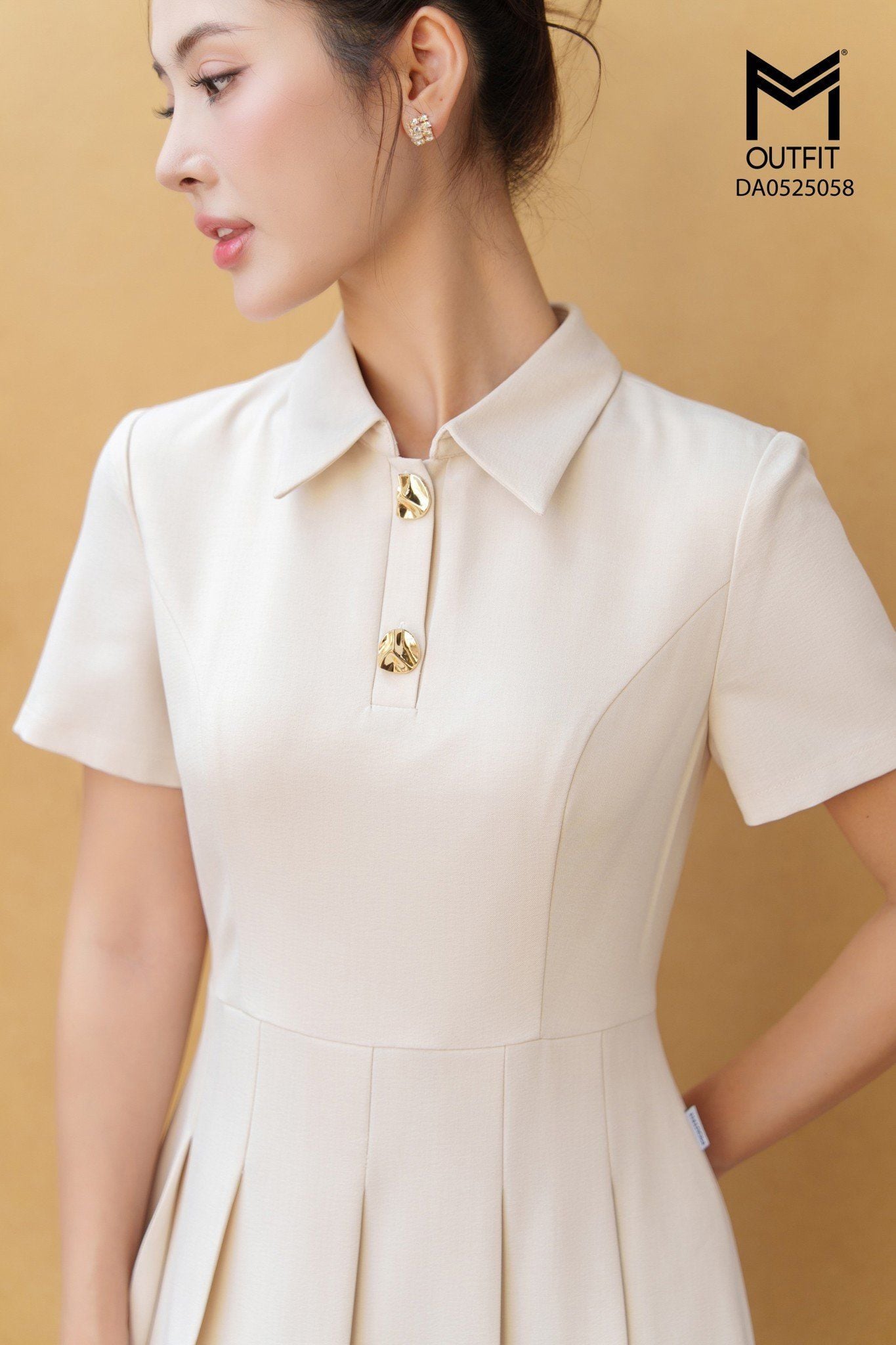 | Đặc điểm | Đầm xếp ly cổ nơ ập đính cúc trang trí |