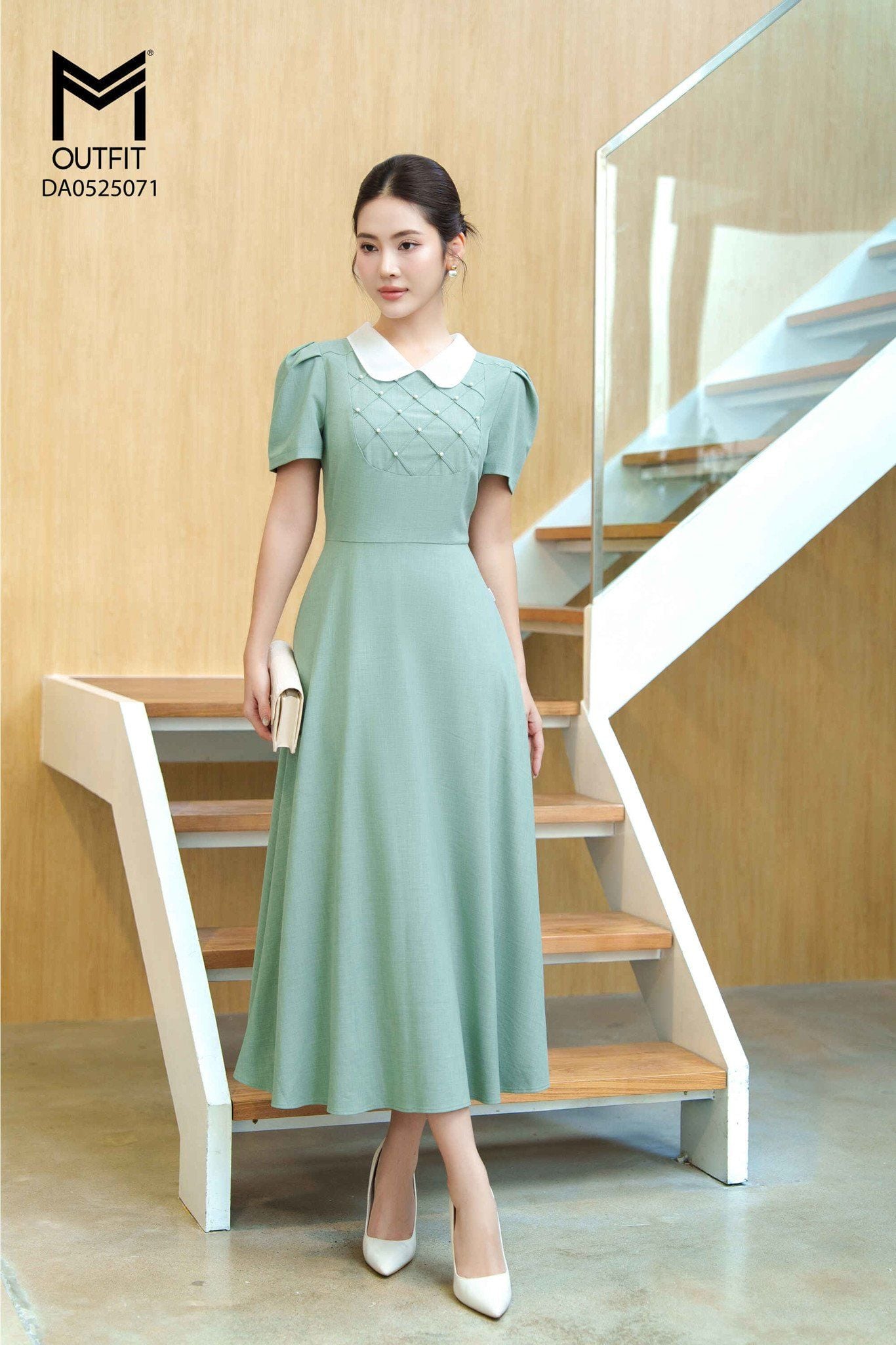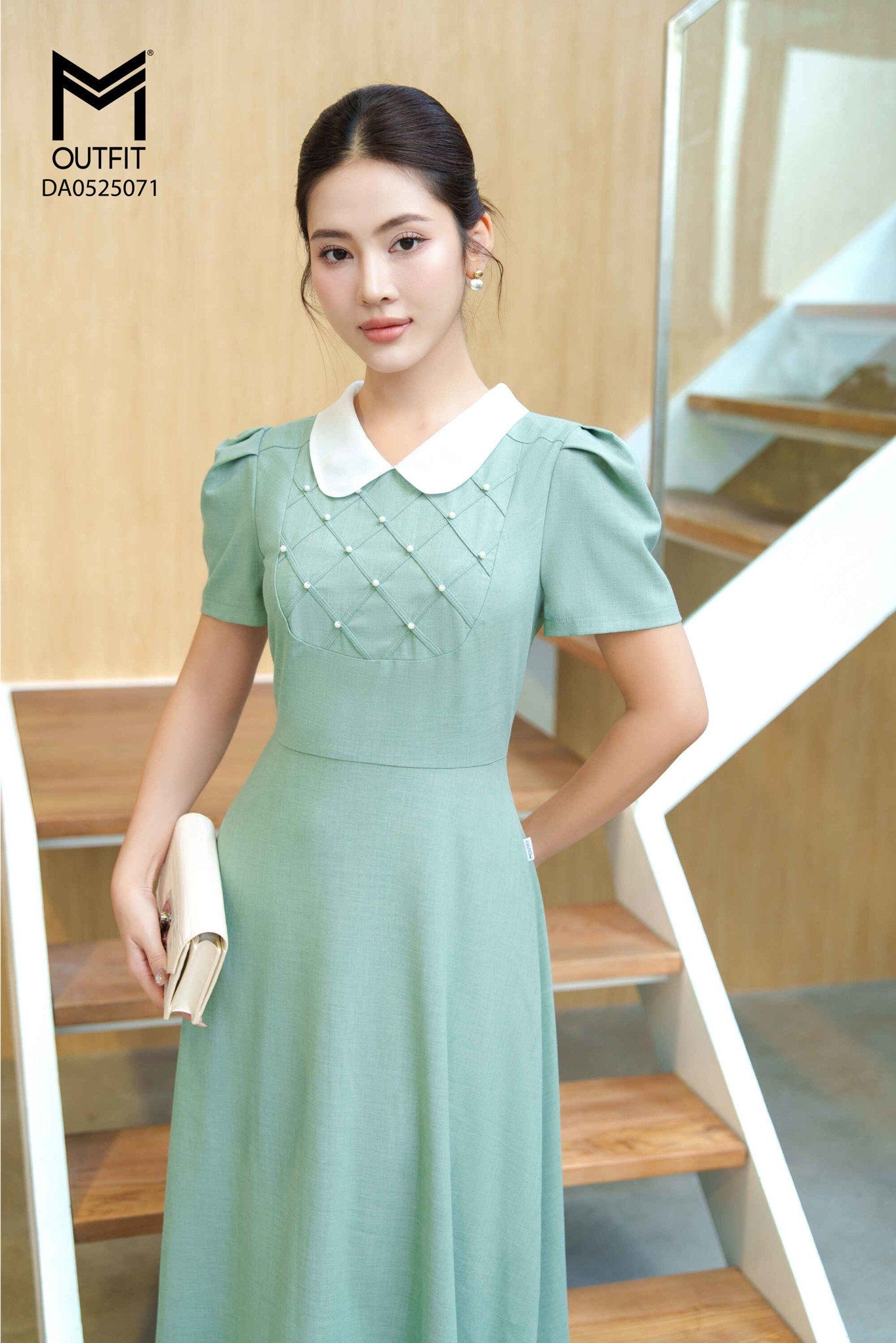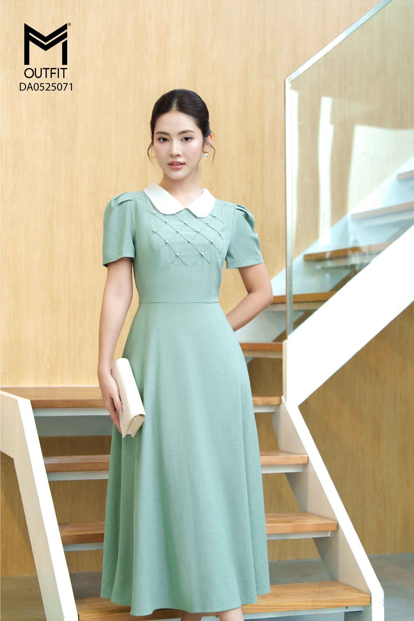 Đầm xòe cổ phối tơ thân đính hạt trai