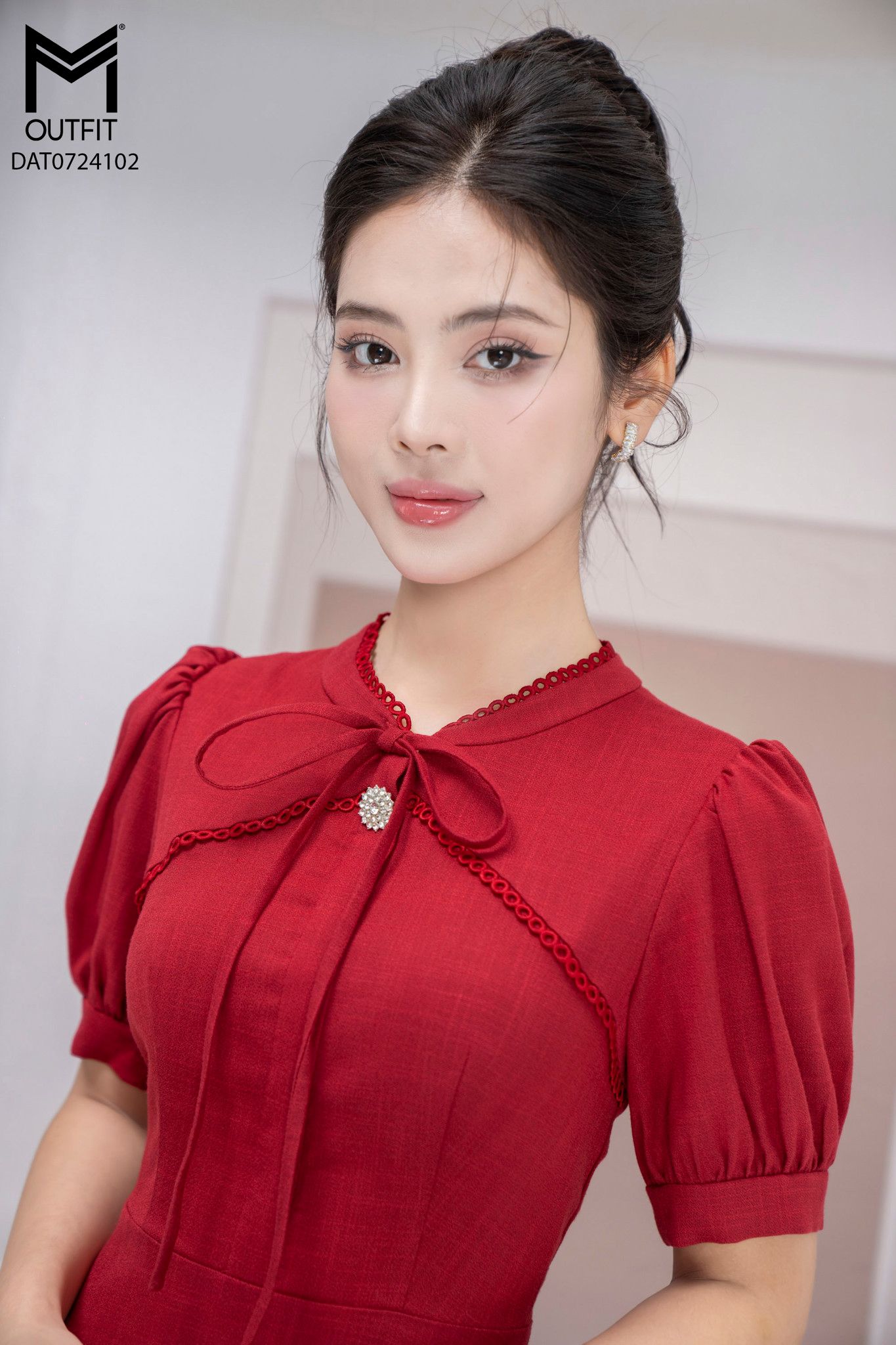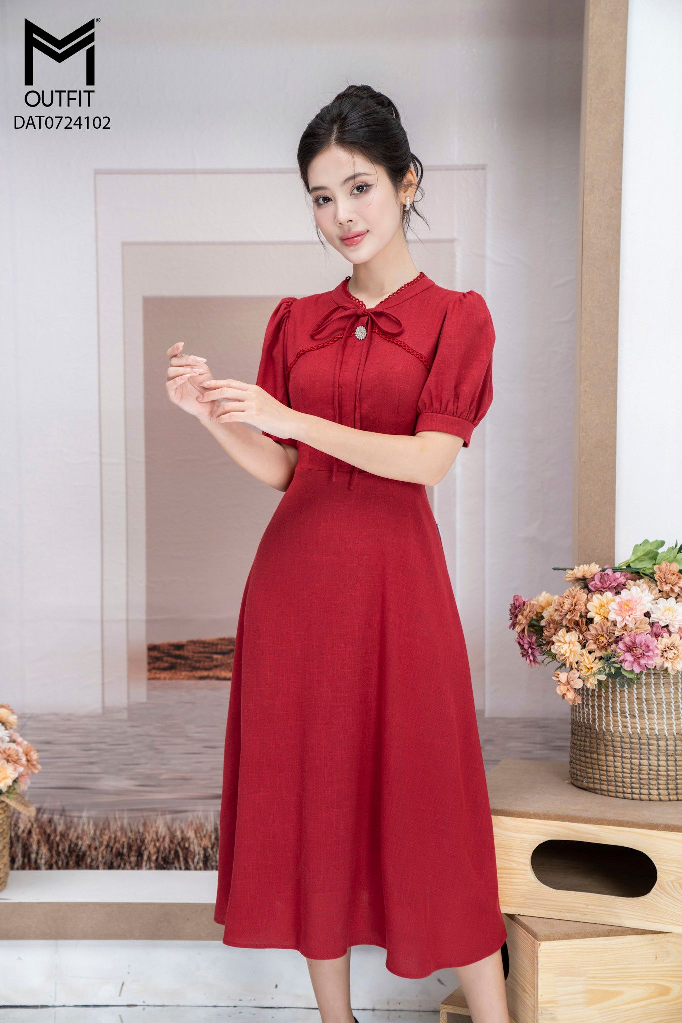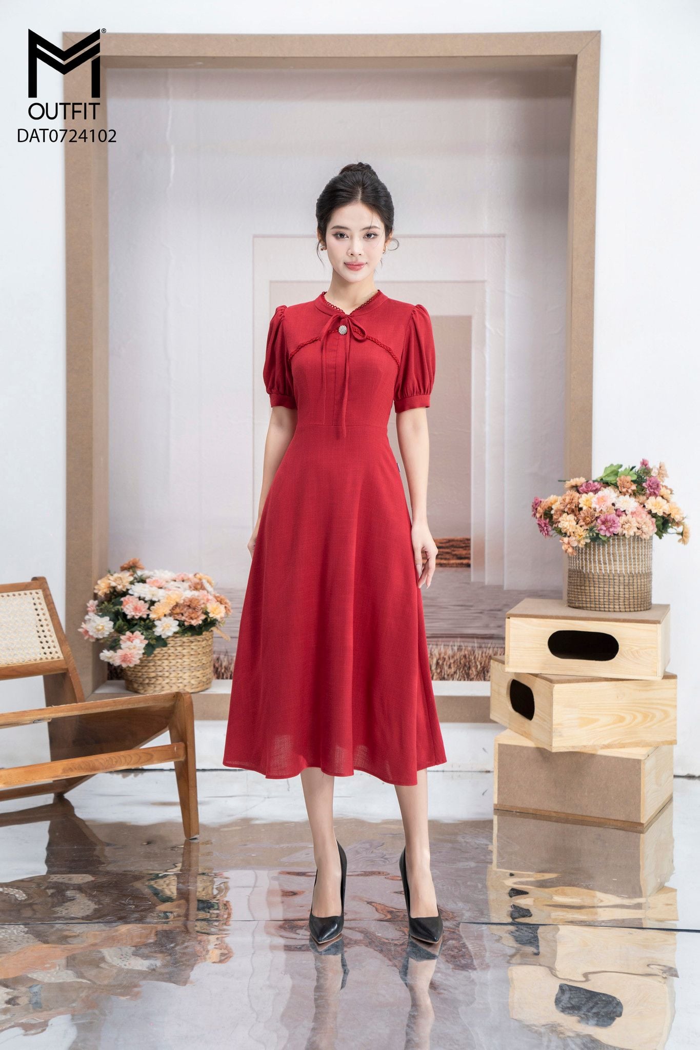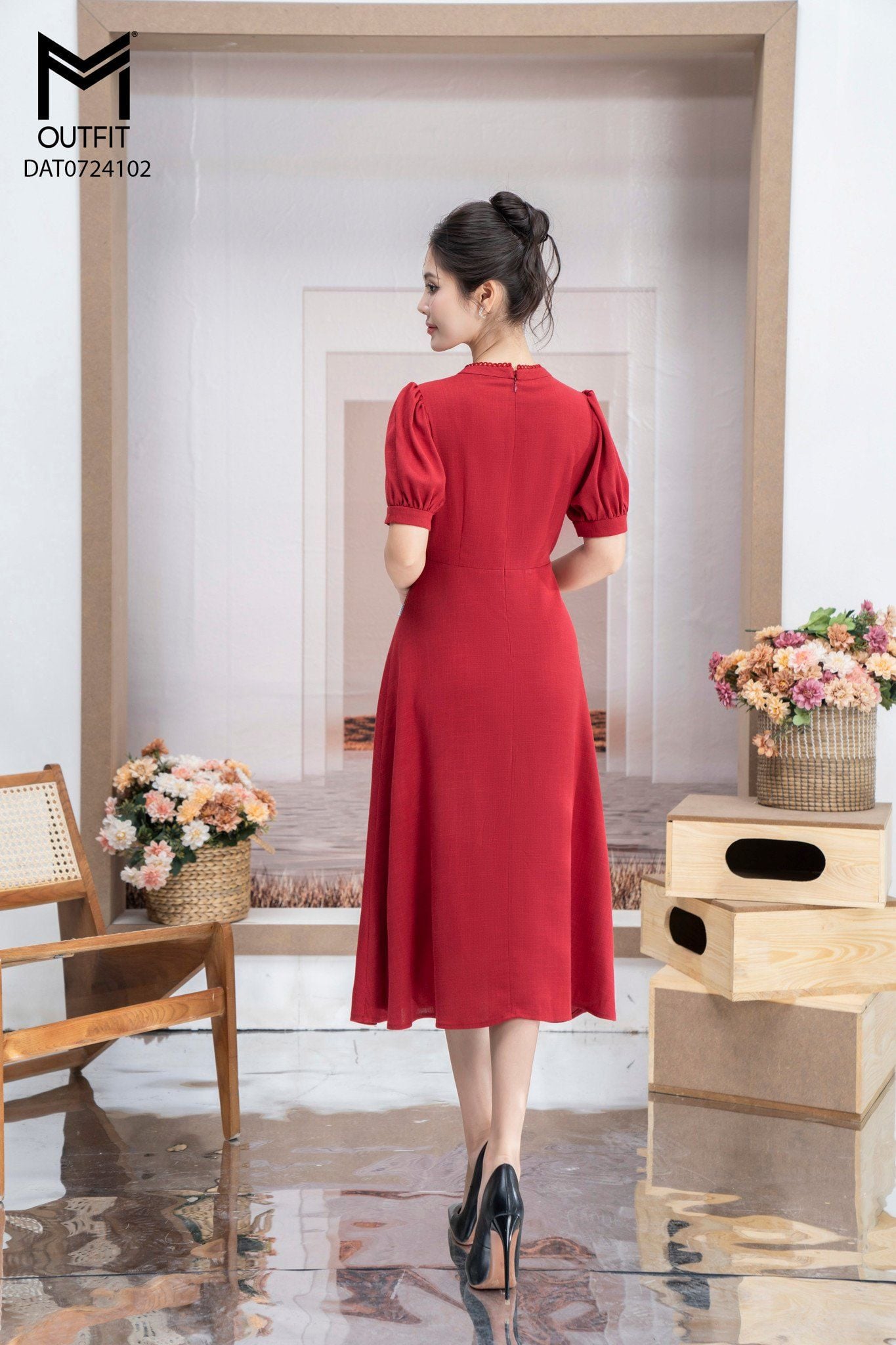 | Đặc điểm | Đầm xòe cổ tàu nằm kẹp ren cổ đính cúc đá |