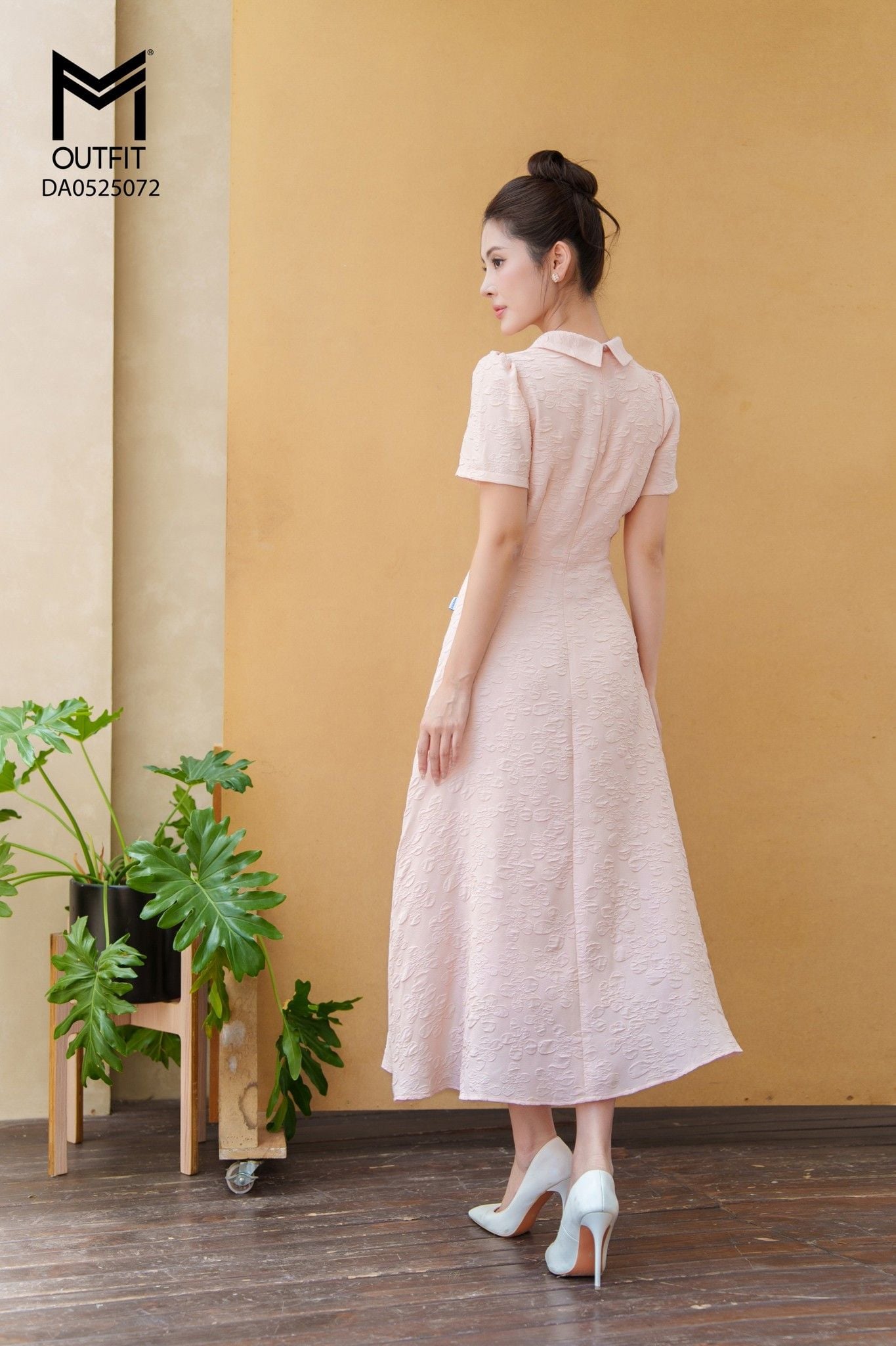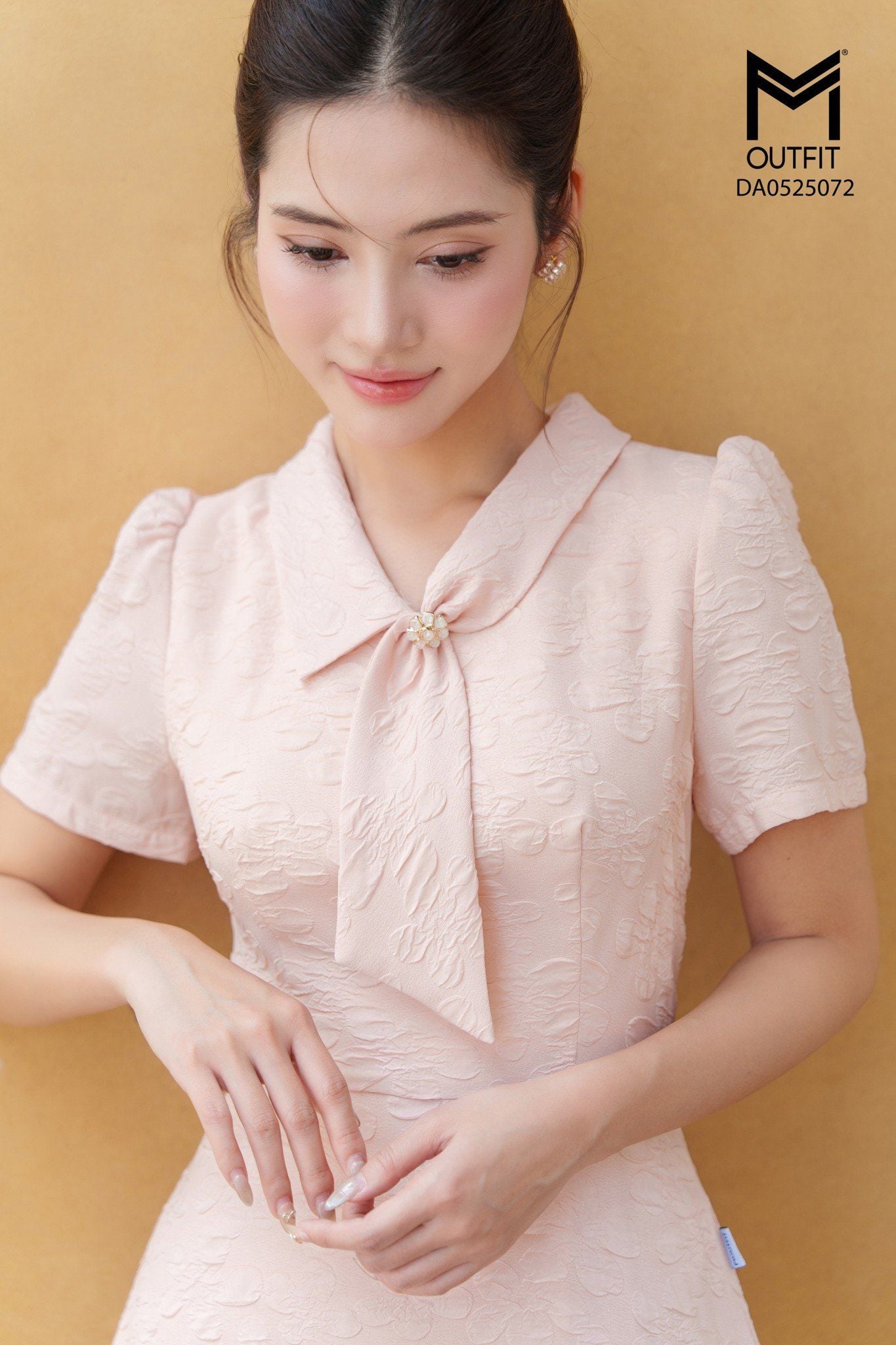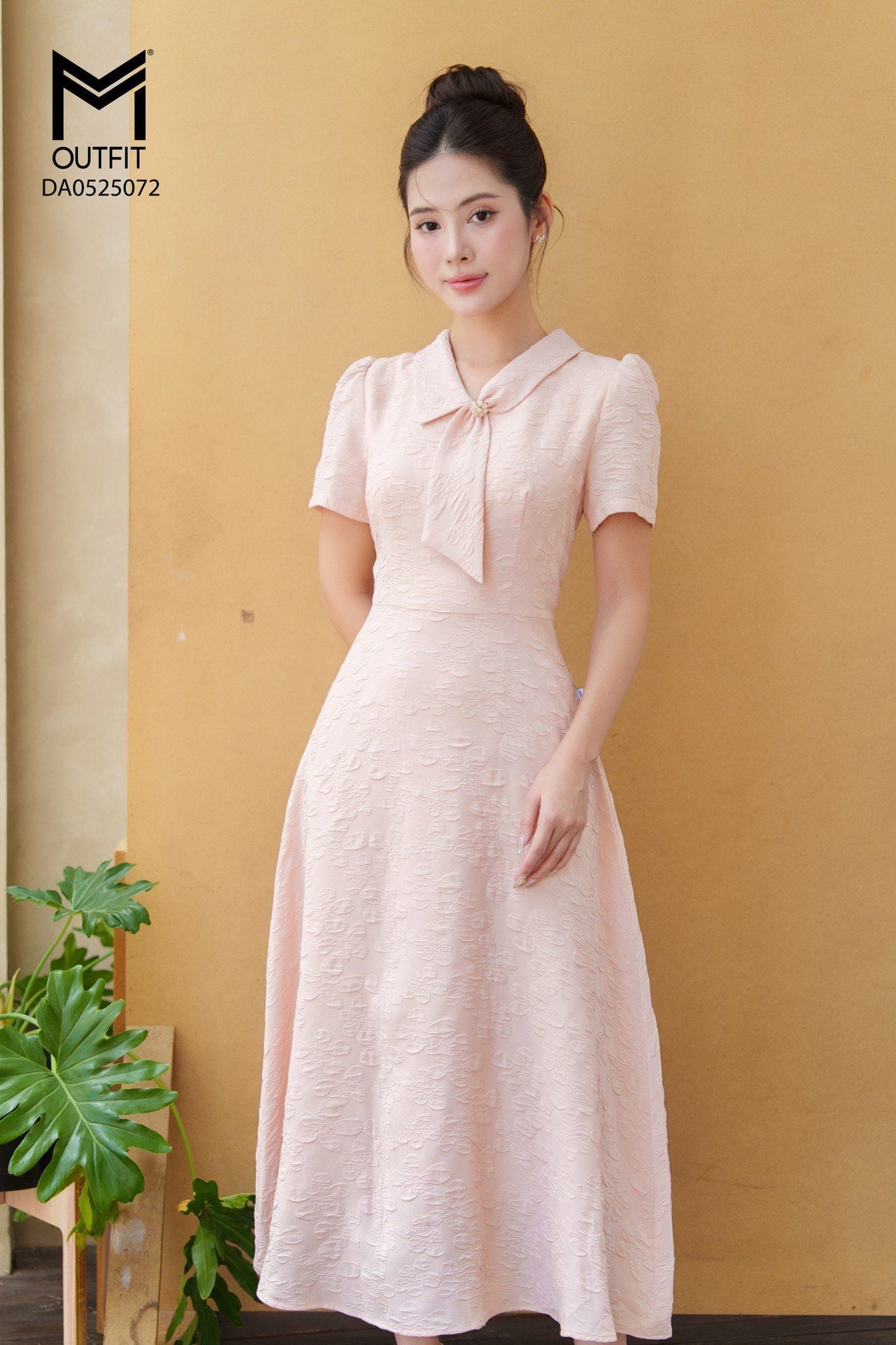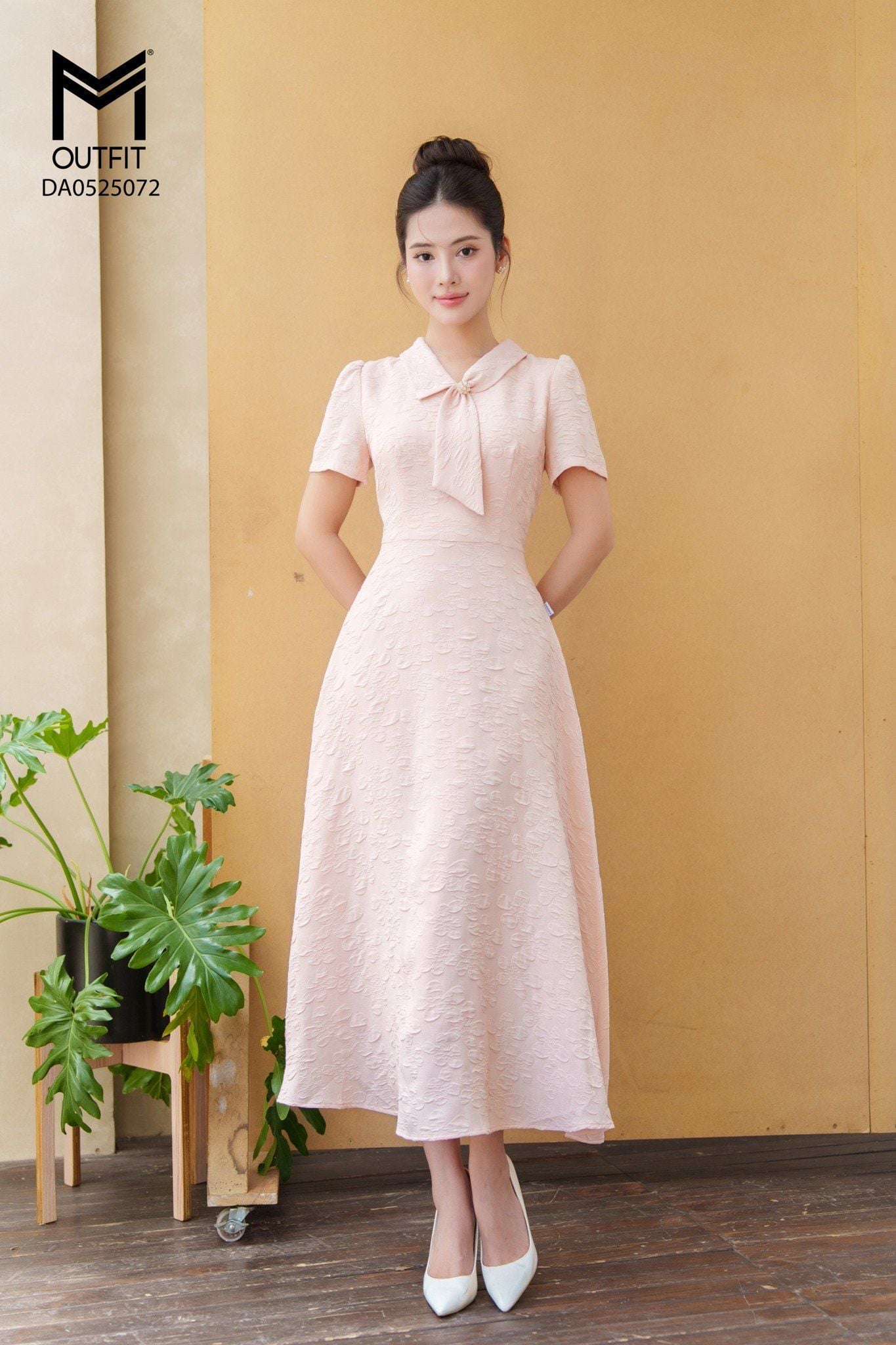 | Đặc điểm | Đầm xòe cổ thắt nơ đính cúc đá |