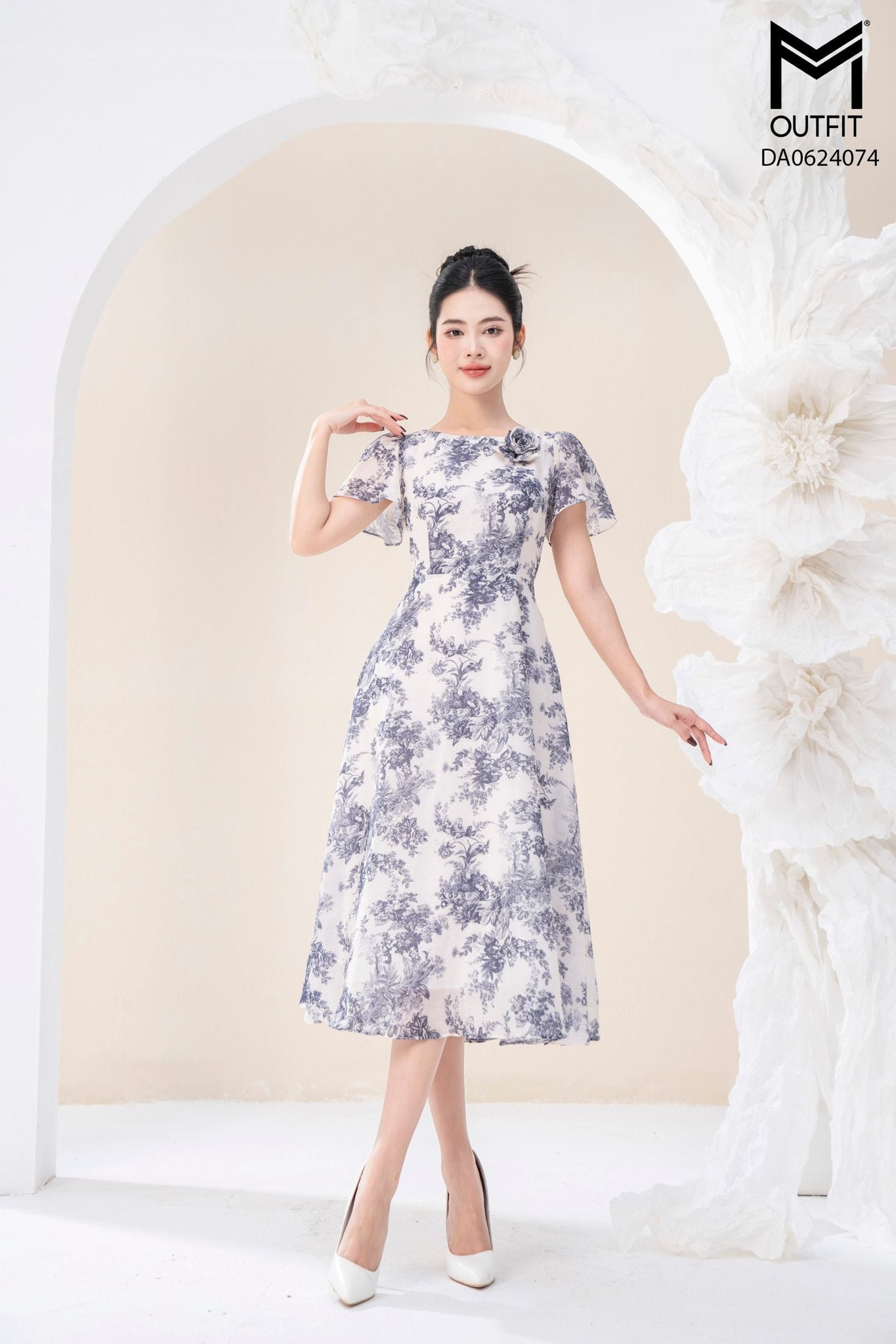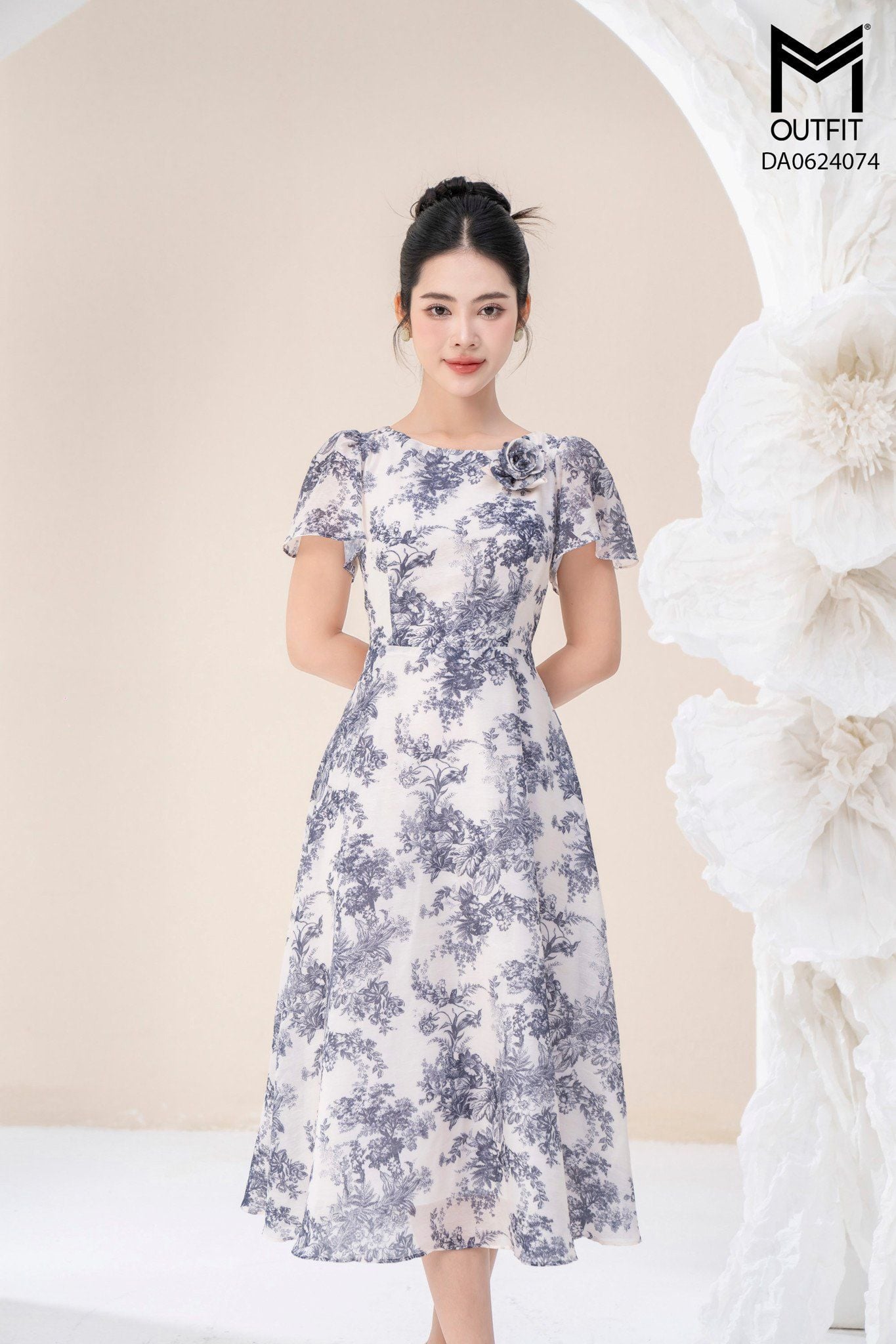 Đầm xòe cổ thuyền đính hoa ngực,tay nhún bồng vai