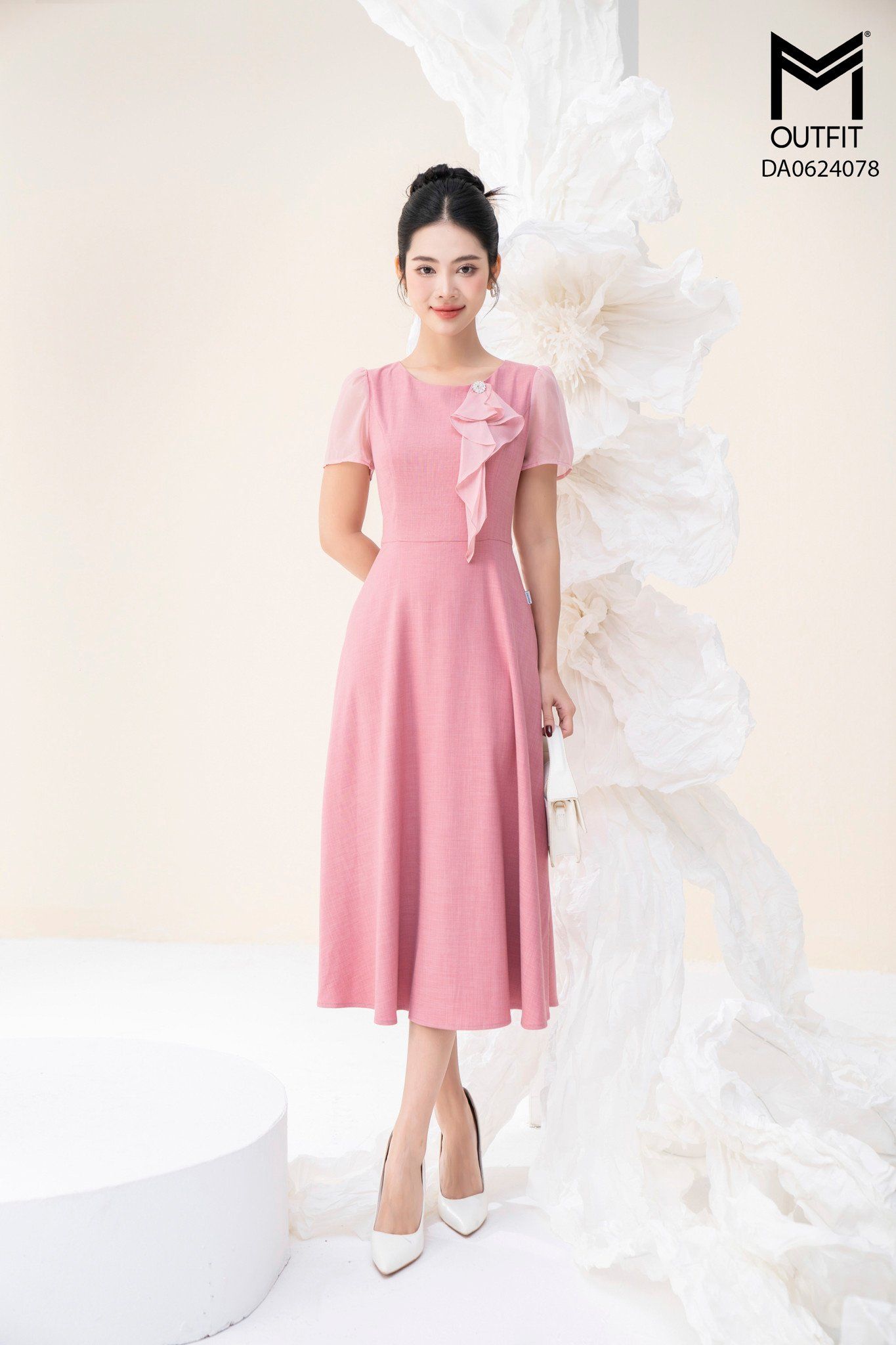 | Đặc điểm | Đầm xòe cổ tròn đính bèo nơ |