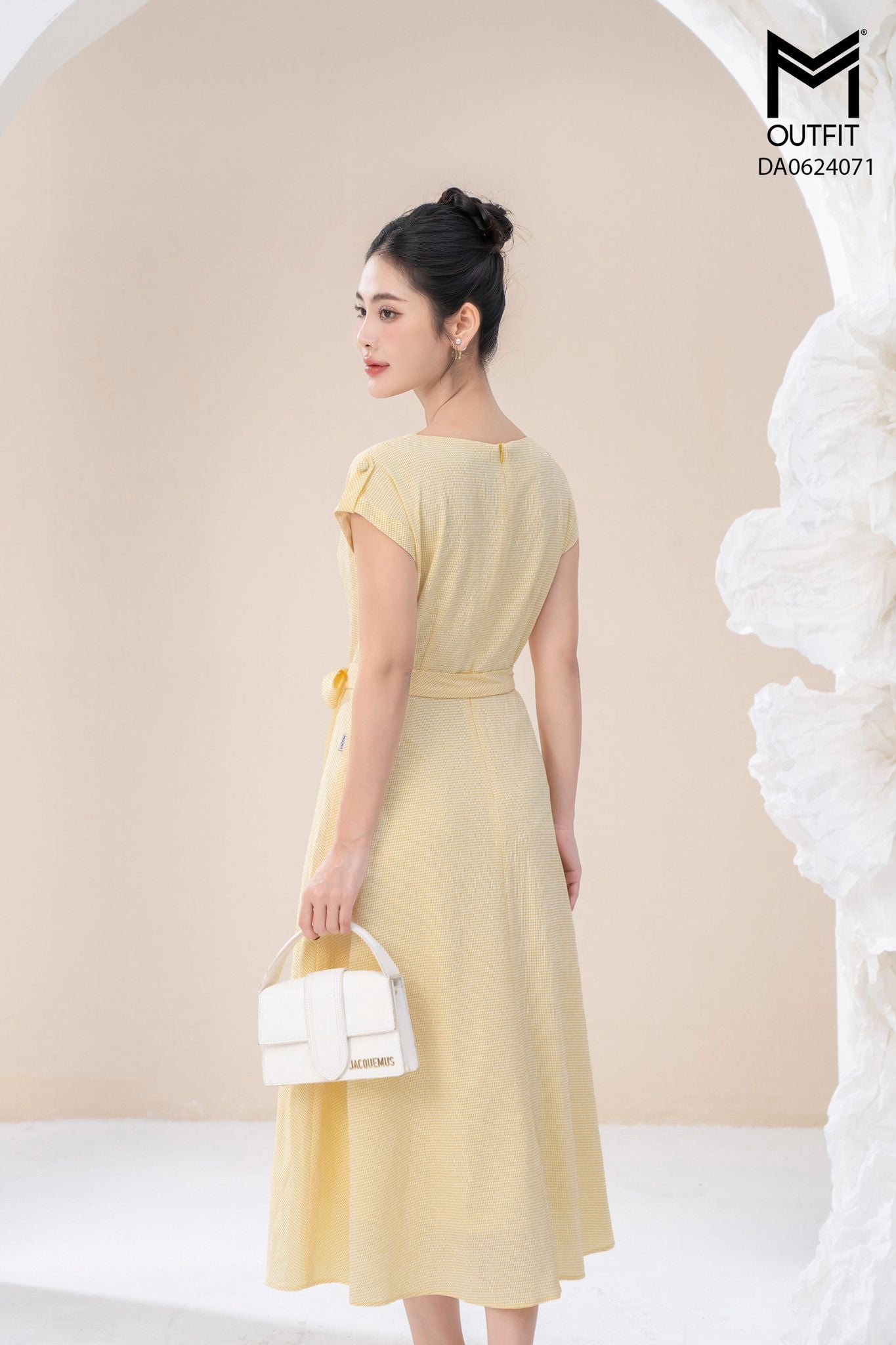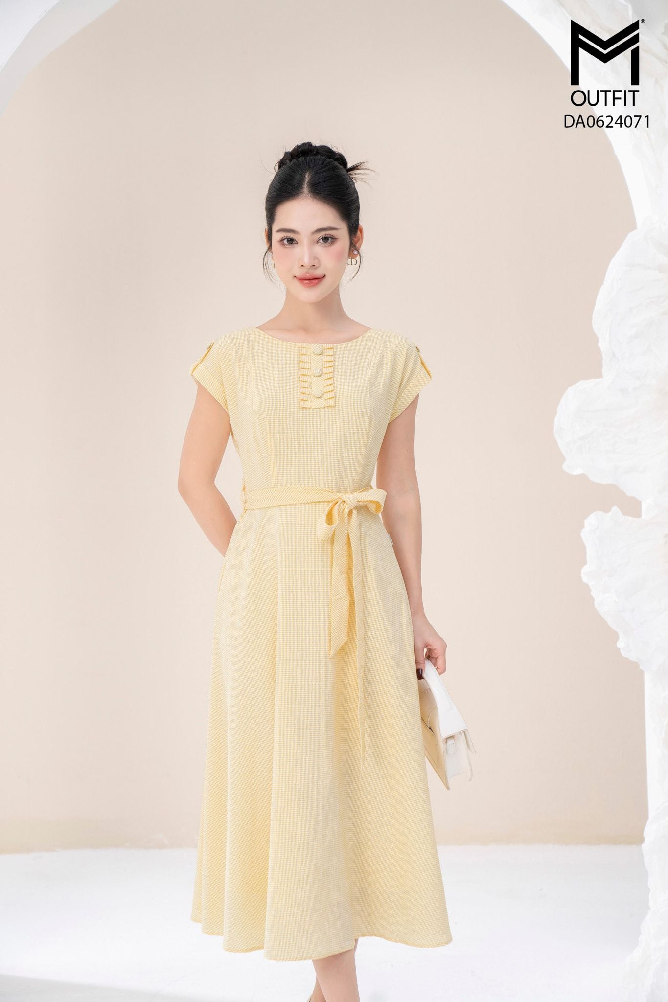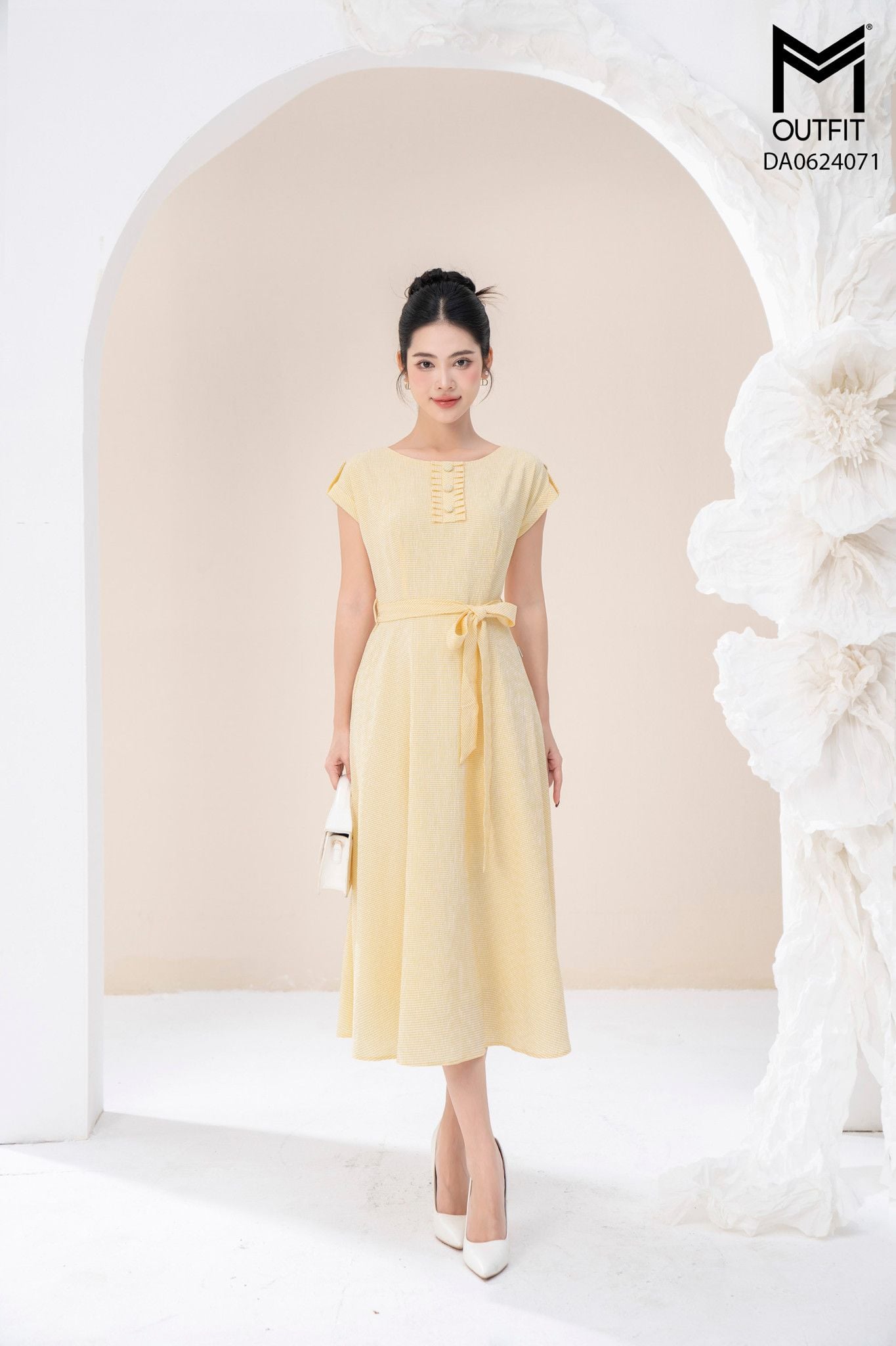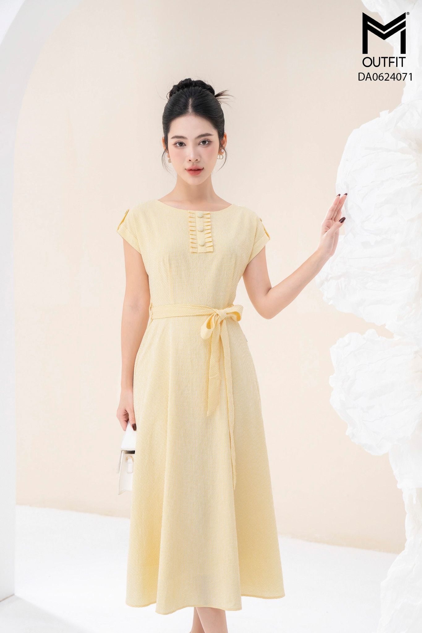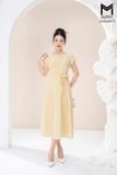 | Đặc điểm | Đầm xòe cổ tròn đính cúc bọc đai cài rời |