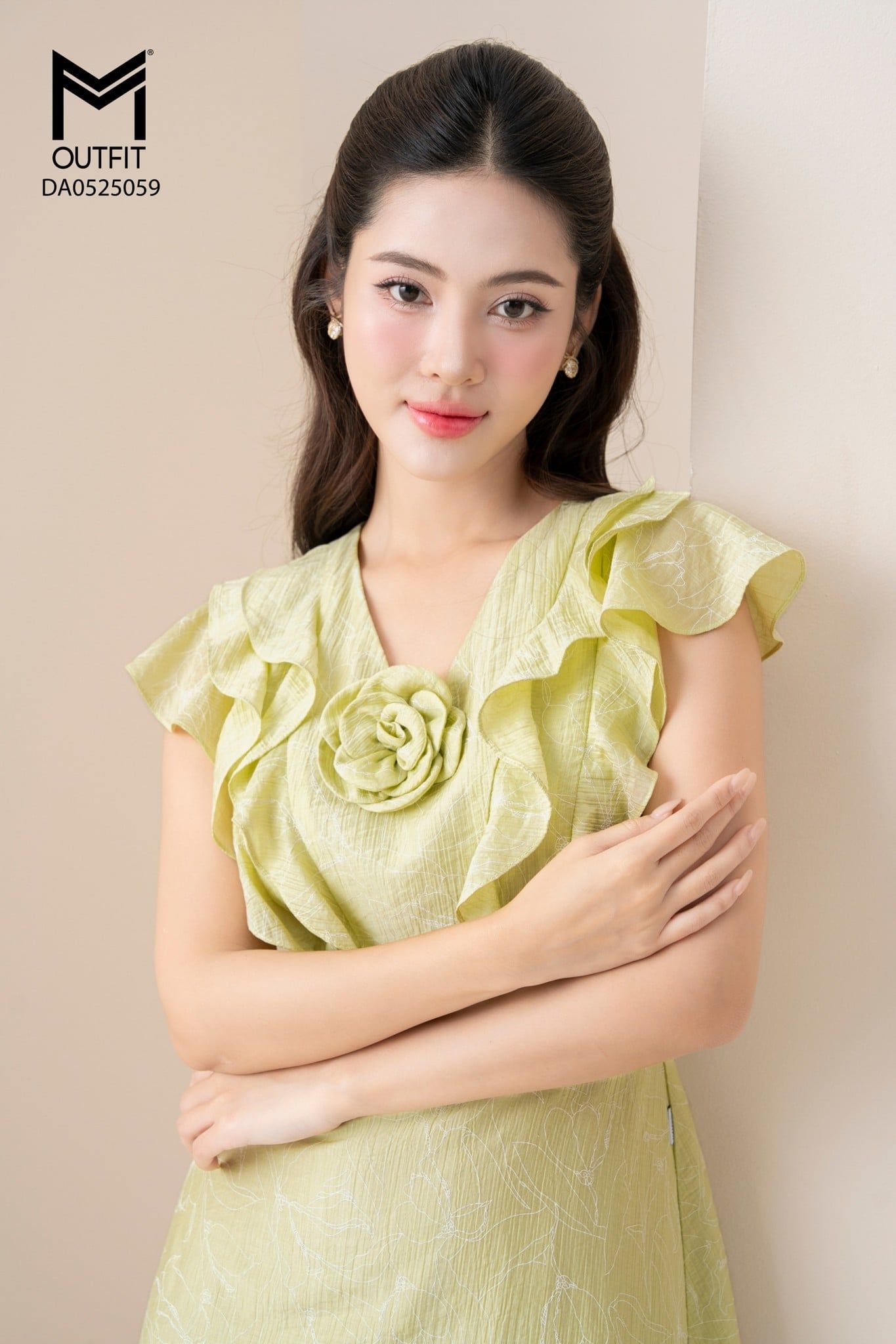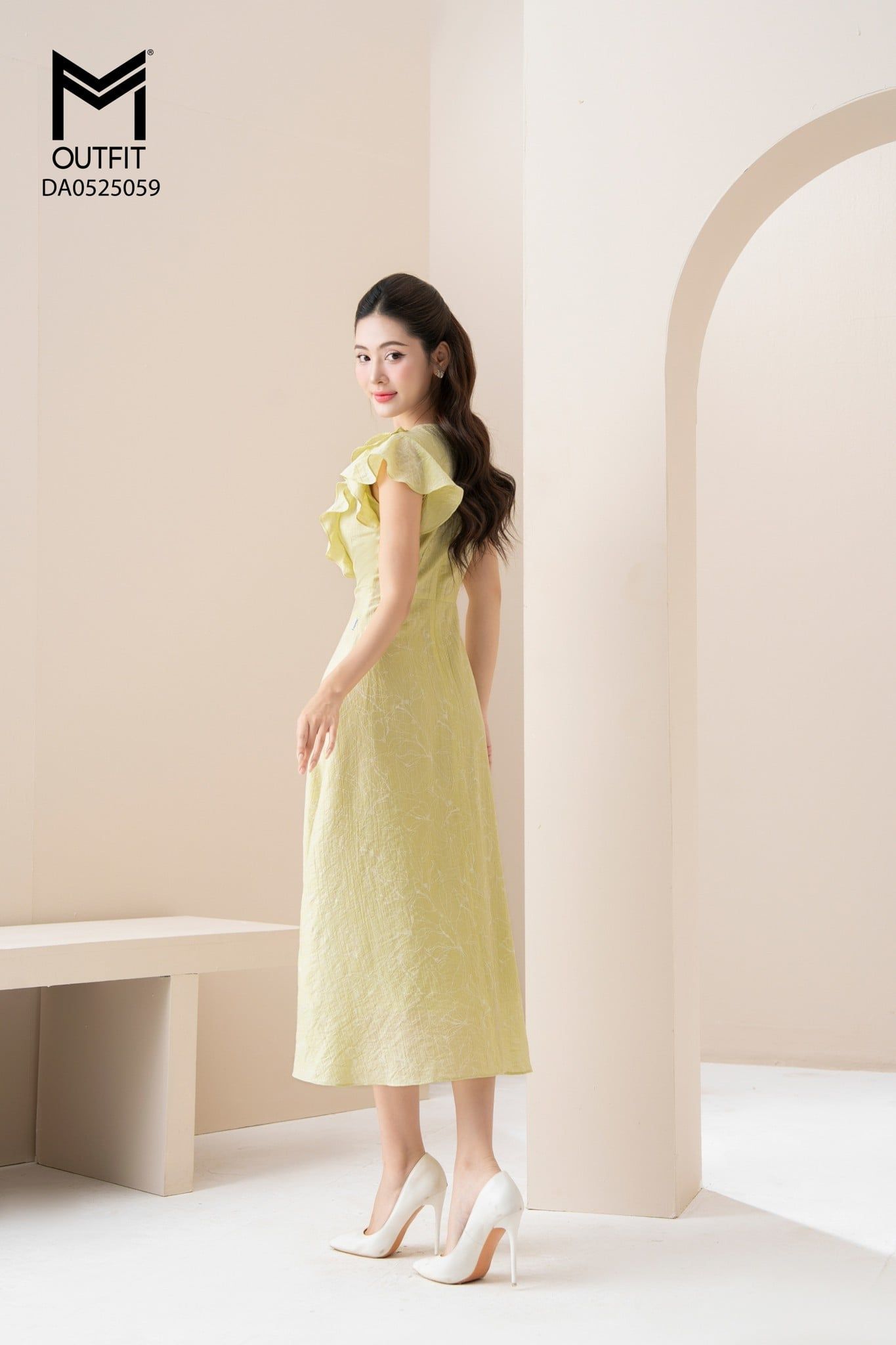 | Đặc điểm | Đầm xòe cổ V bèo ngực đính hoa tay cánh tiên |