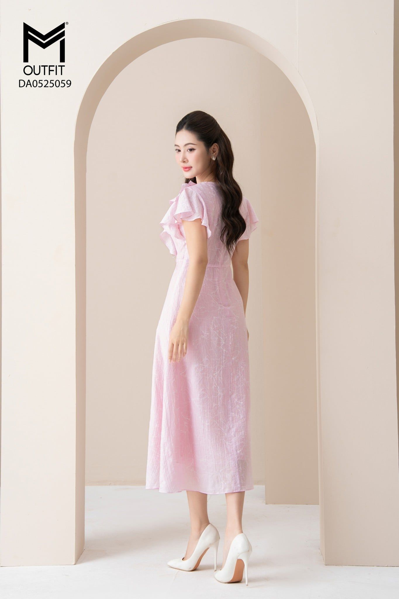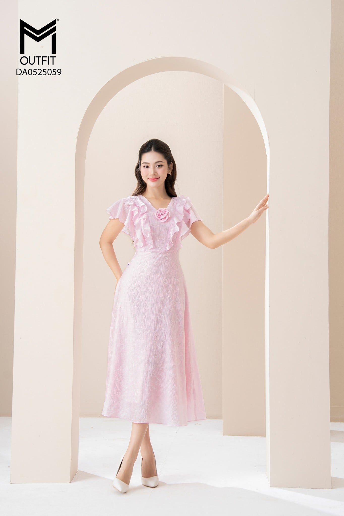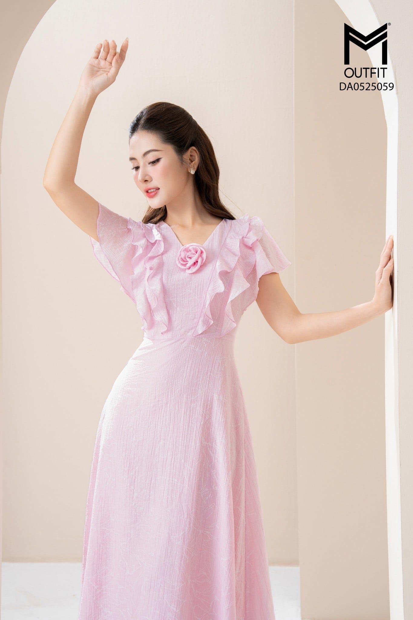 Đầm xòe cổ V bèo ngực đính hoa tay cánh tiên