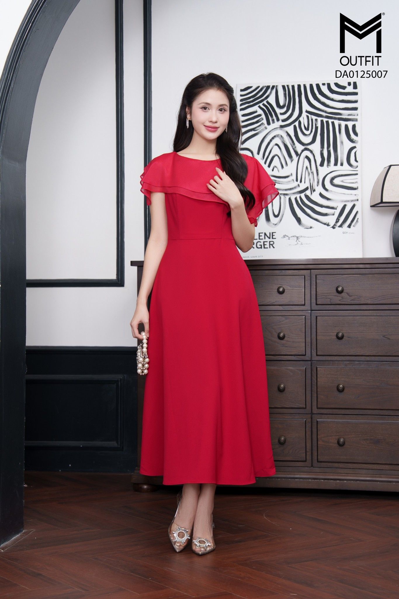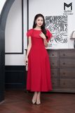 Đầm xòe tà bong phối tơ đính trai trên vai