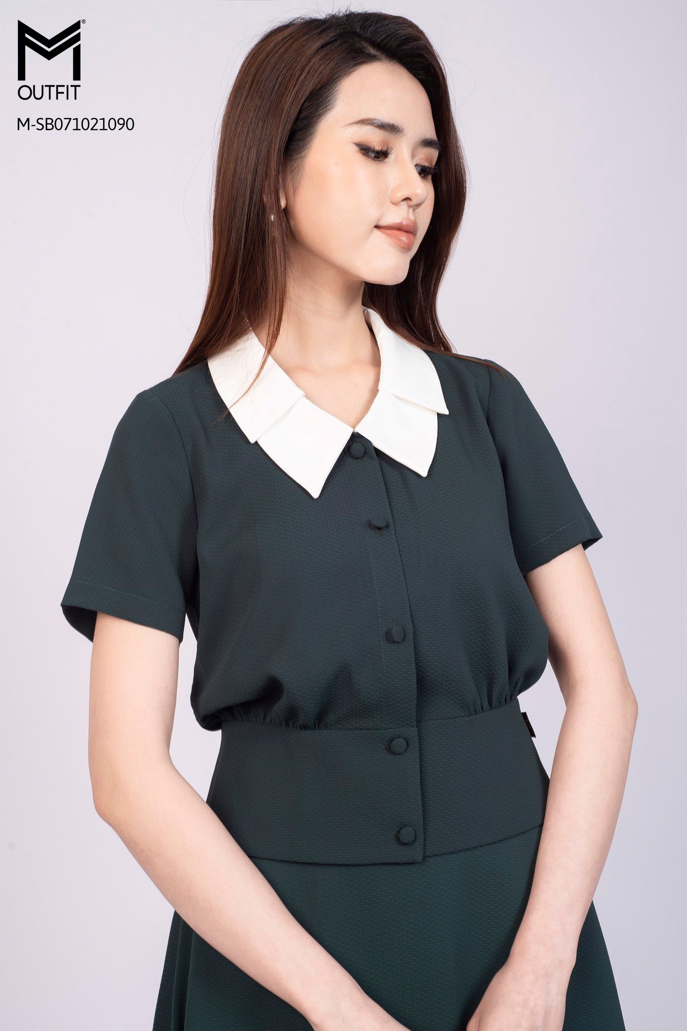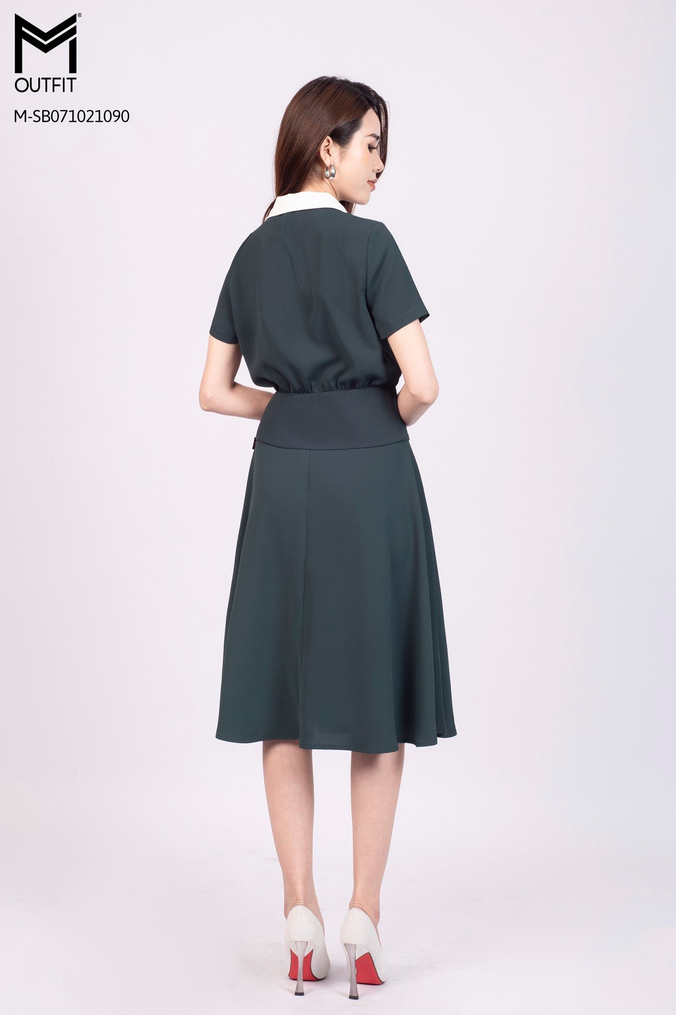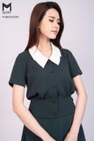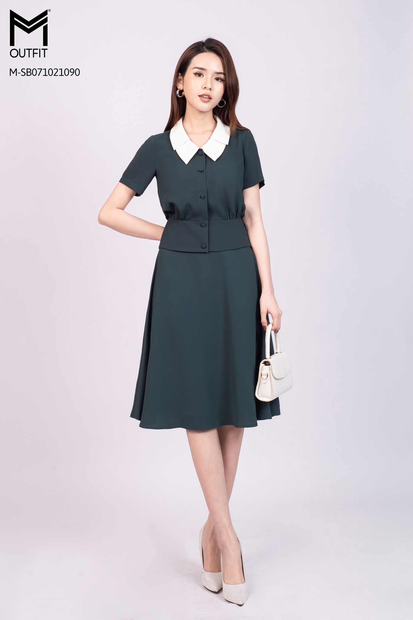 Set bộ áo cộc tay, cổ áo hai lớp. Chân váy dài trùm gối dáng xòe