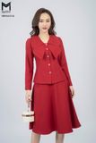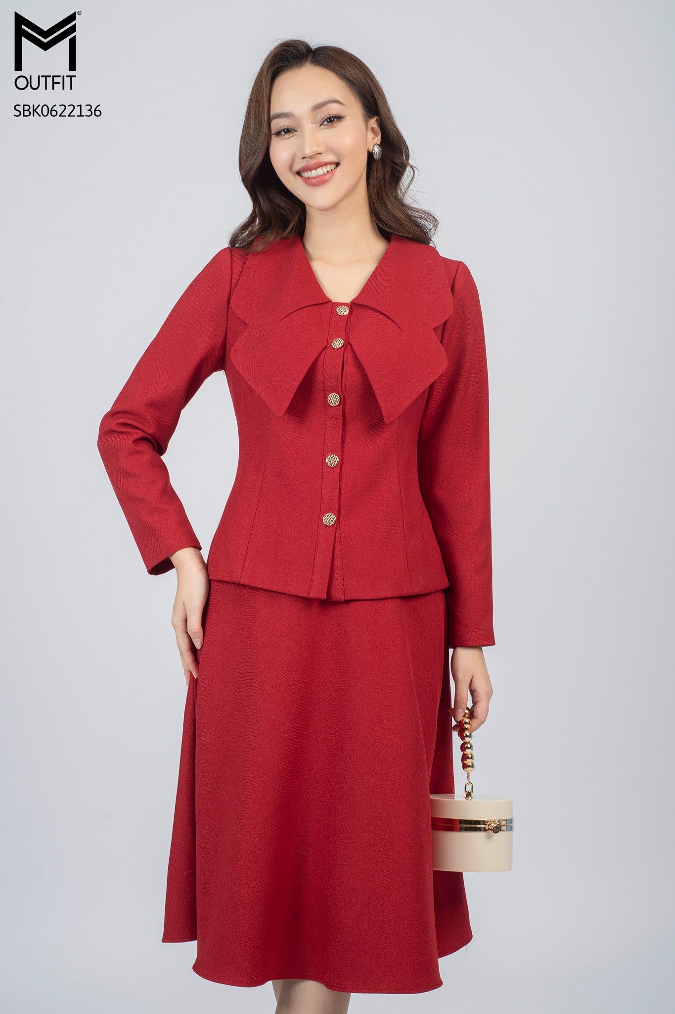 | Đặc điểm | Set bộ áo dài tay, cổ bèo, chân váy dáng xòe |