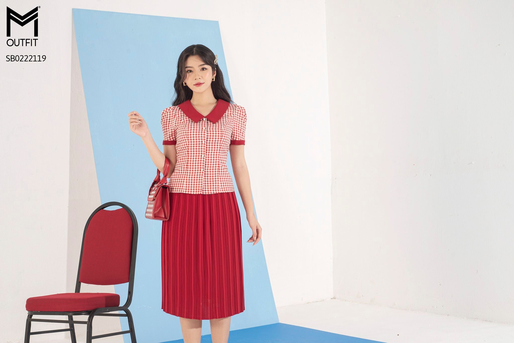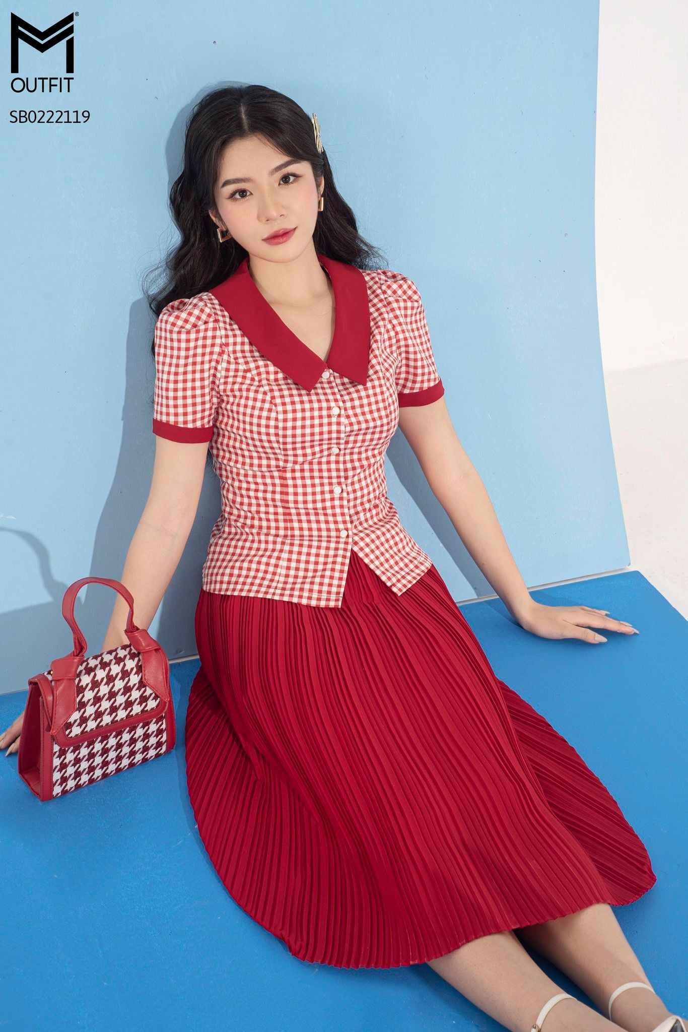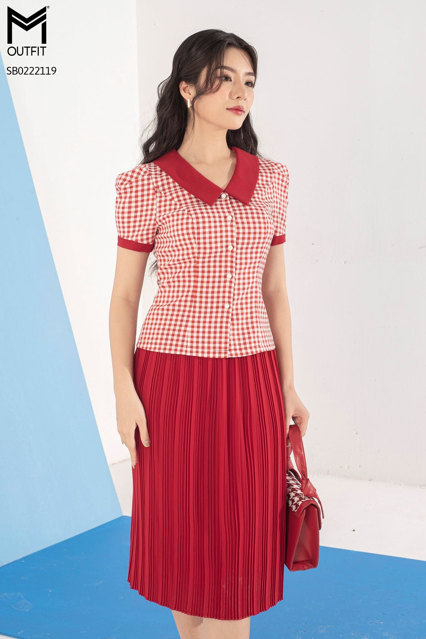 | Đặc điểm | Set bộ áo kẻ cổ đức, chân váy xòe dập ly |