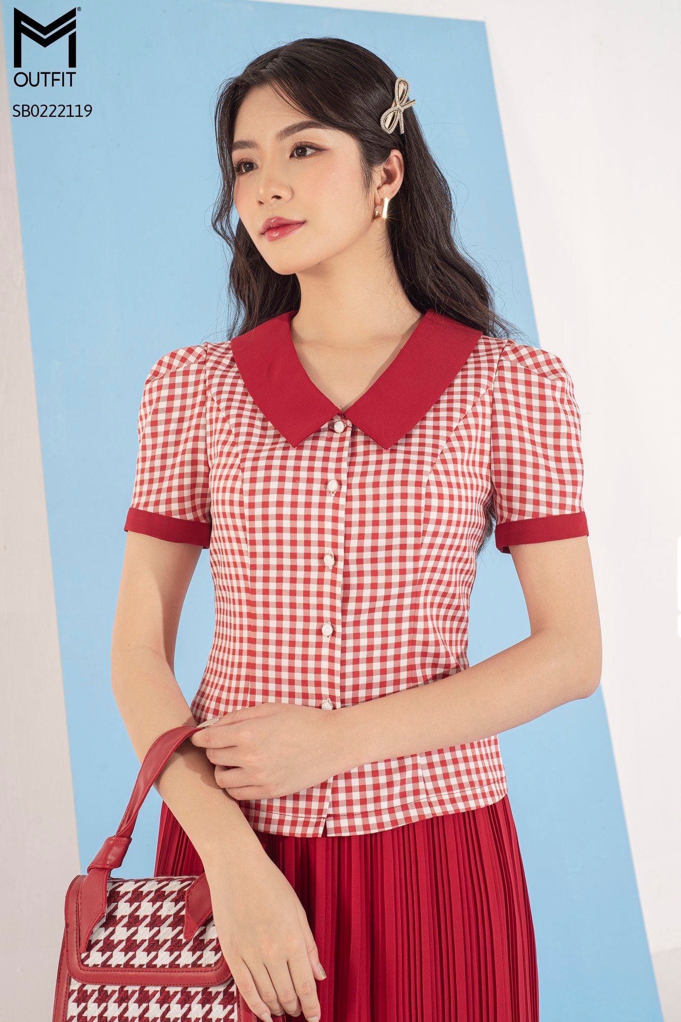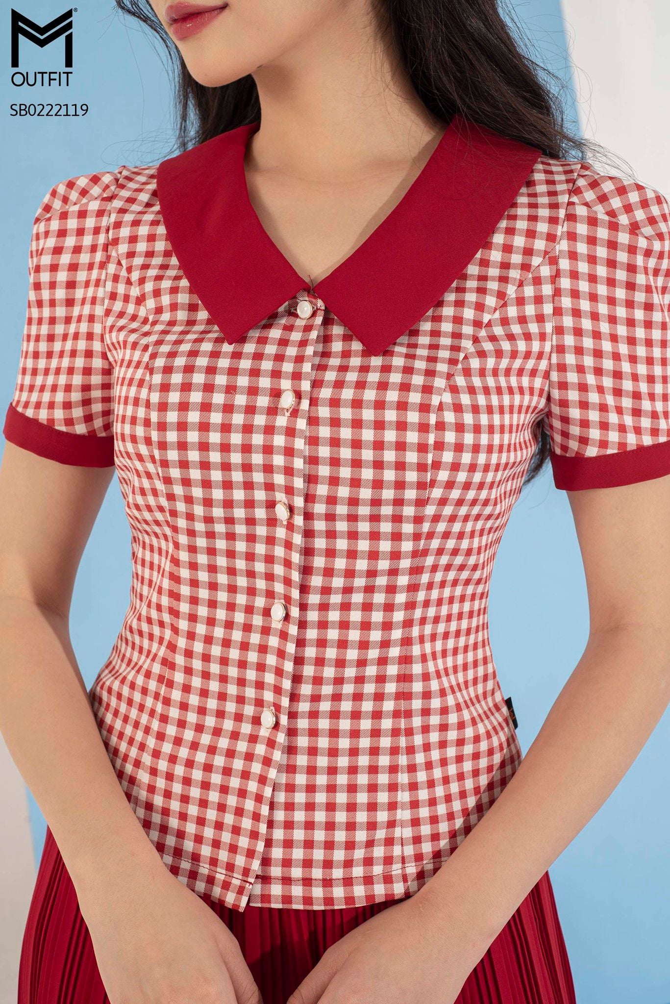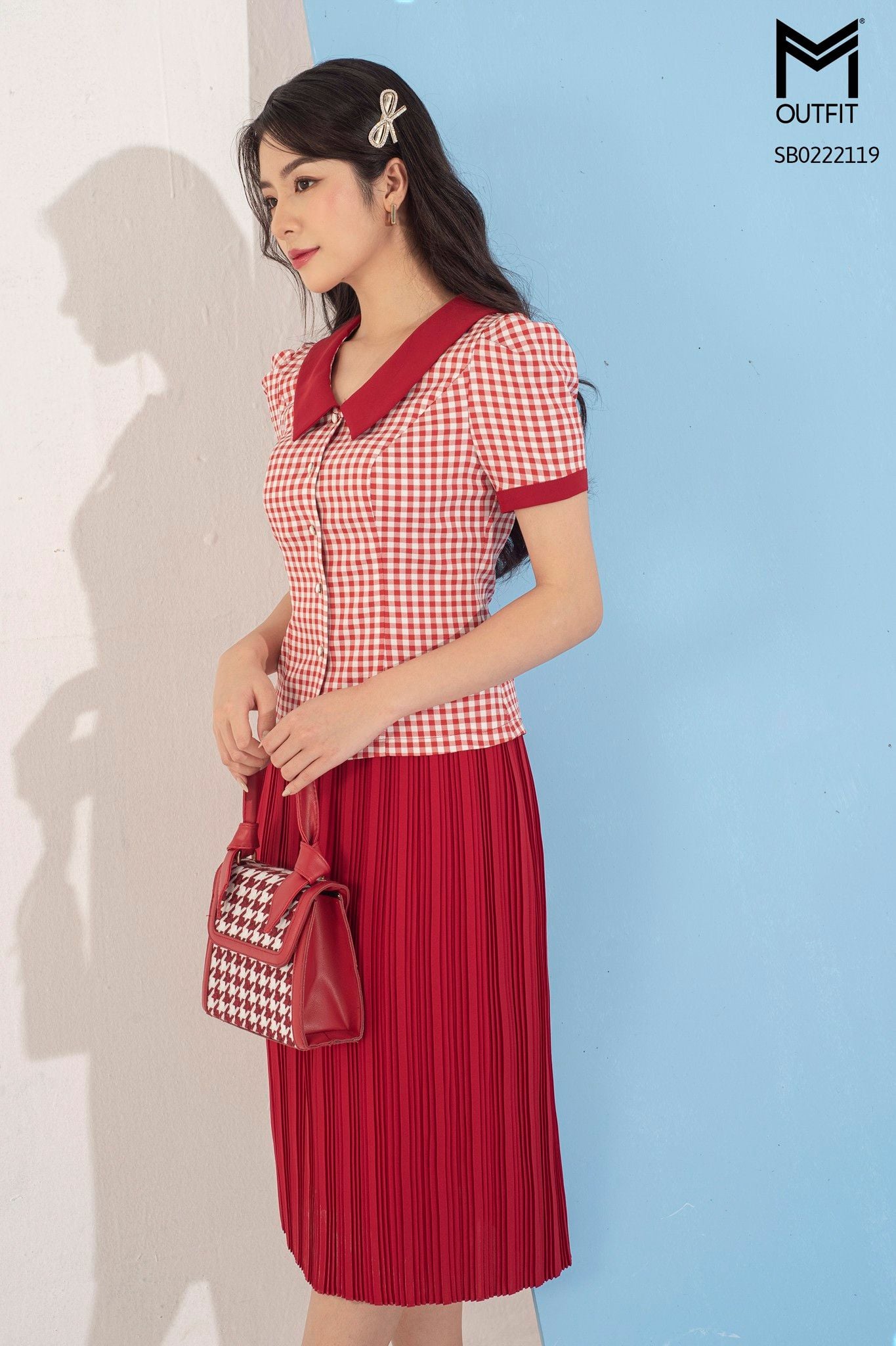 | Đặc điểm | Set bộ áo kẻ cổ đức, chân váy xòe dập ly |