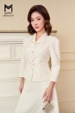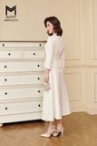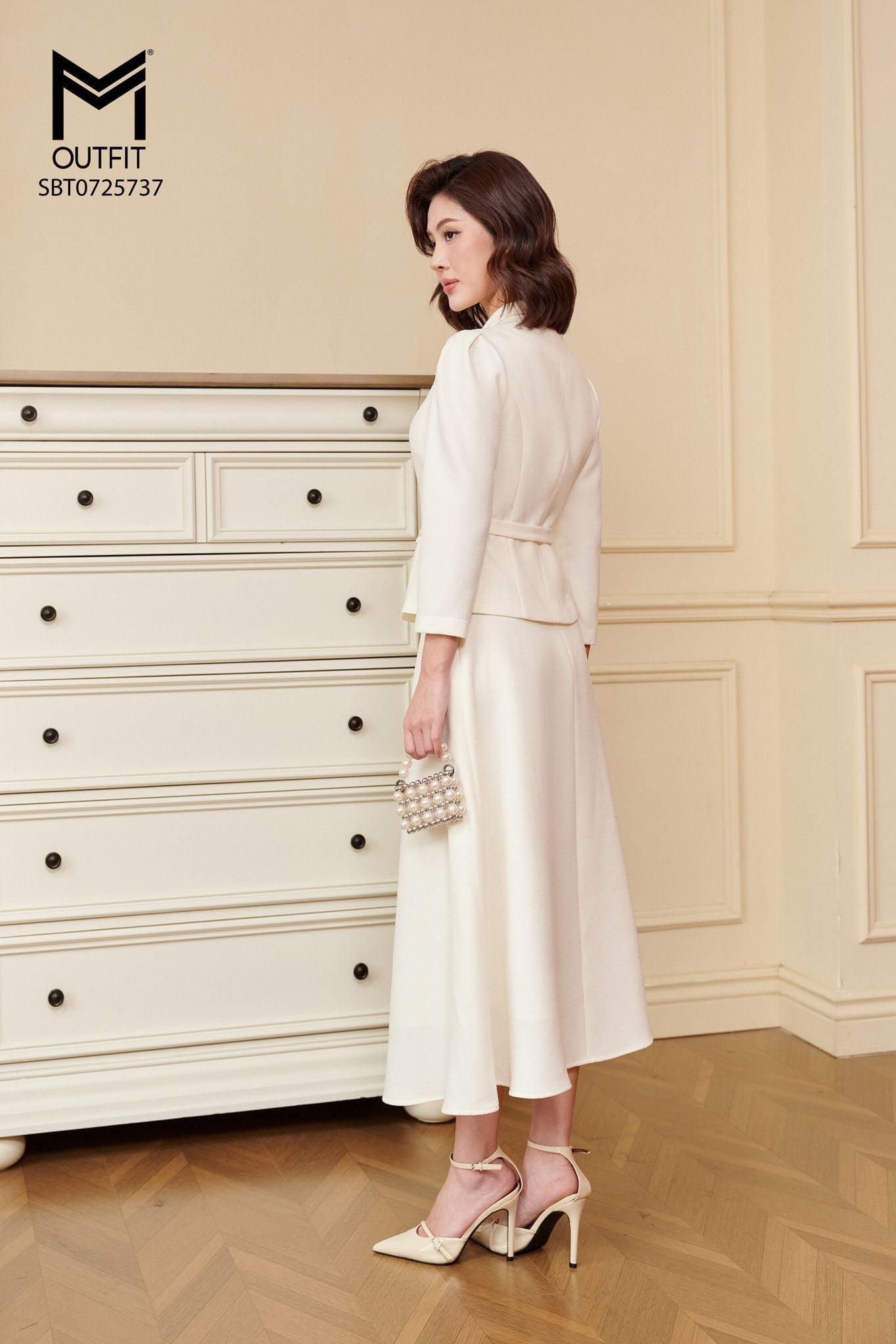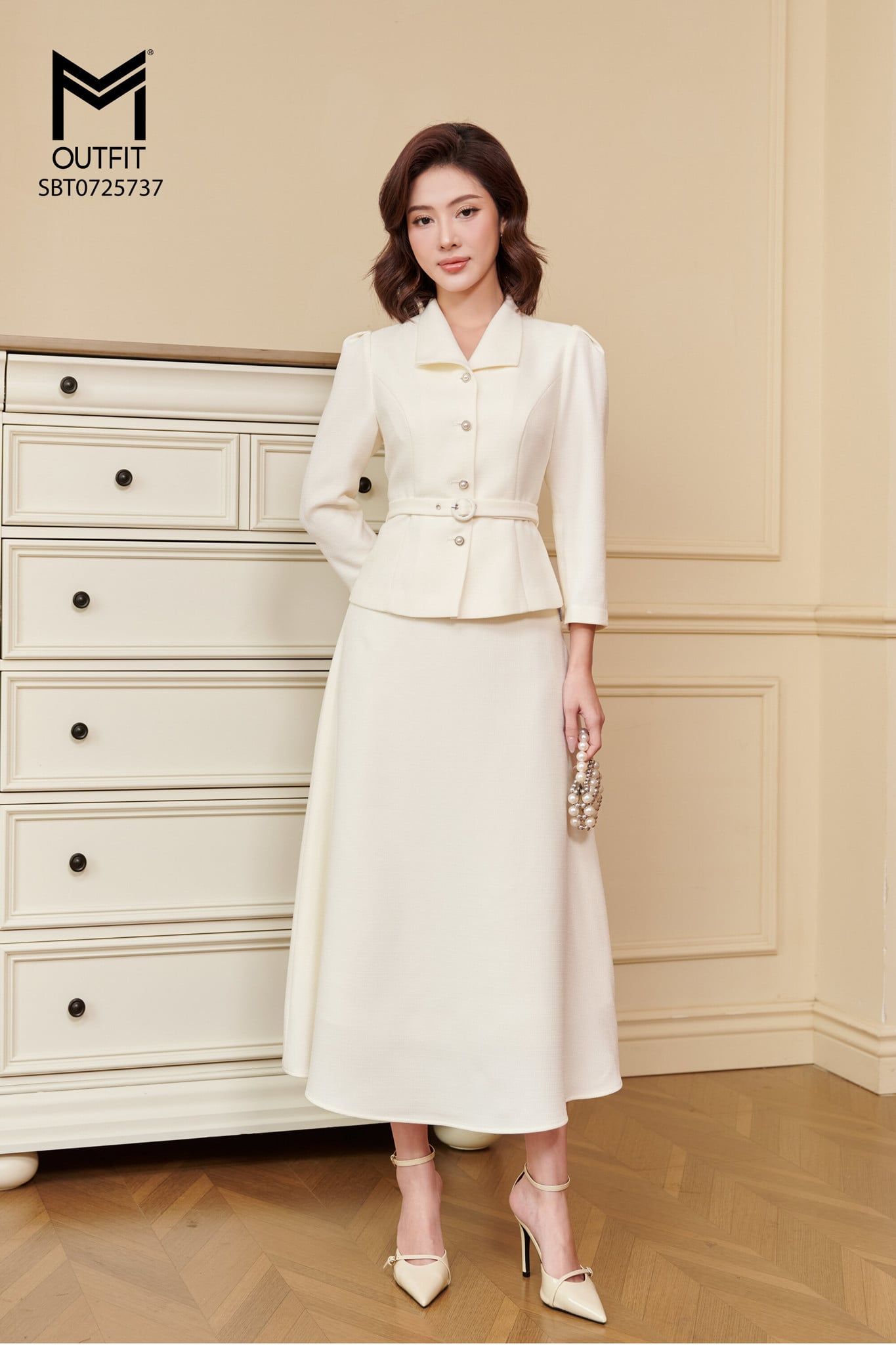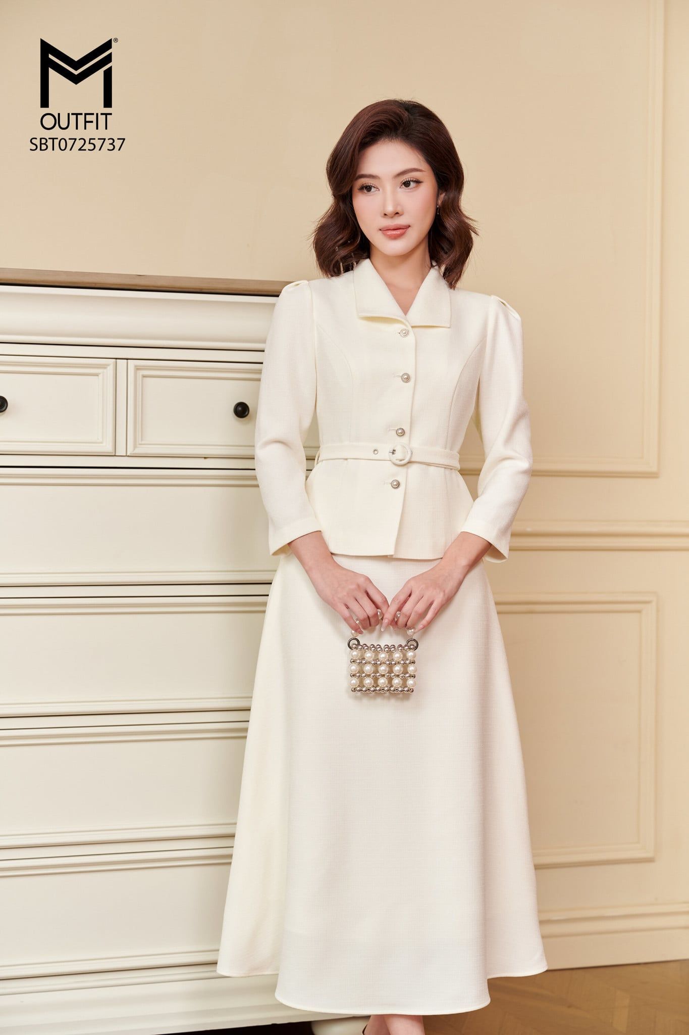 | Đặc điểm | Set bộ áo khoác cổ én có đai và chân váy xòe |