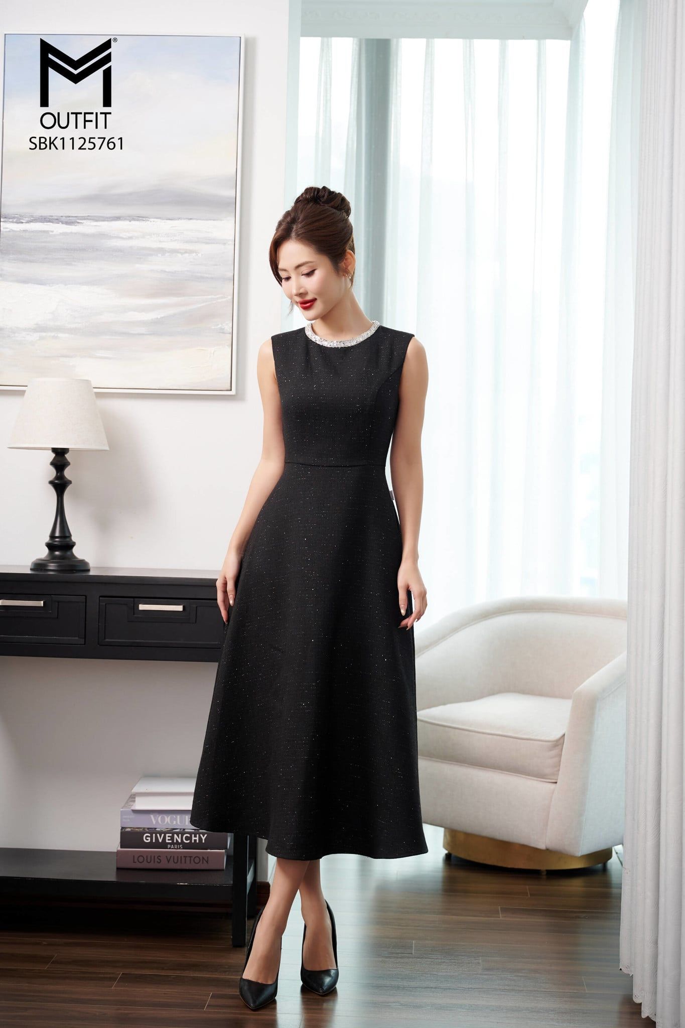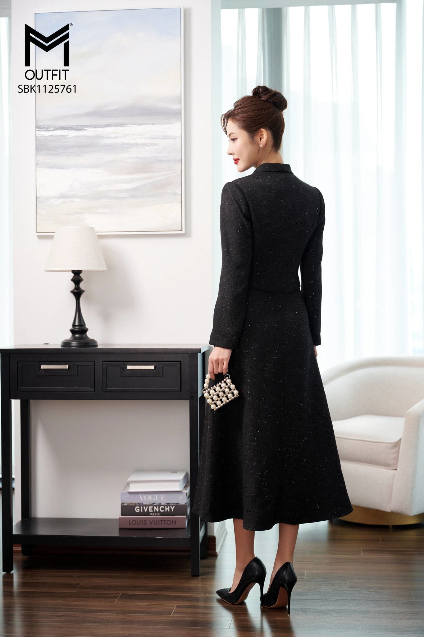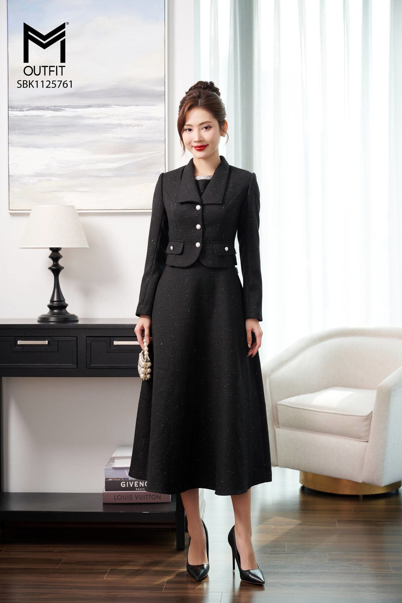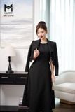 | Đặc điểm | Sét bộ áo khoác cổ én và đầm sát nách đính kim sa cổ |