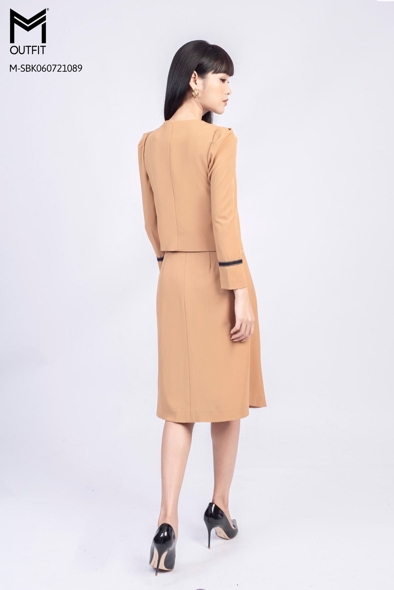 | Đặc điểm | Set bộ áo khoác cổ tròn kết hợp chân váy xòe |