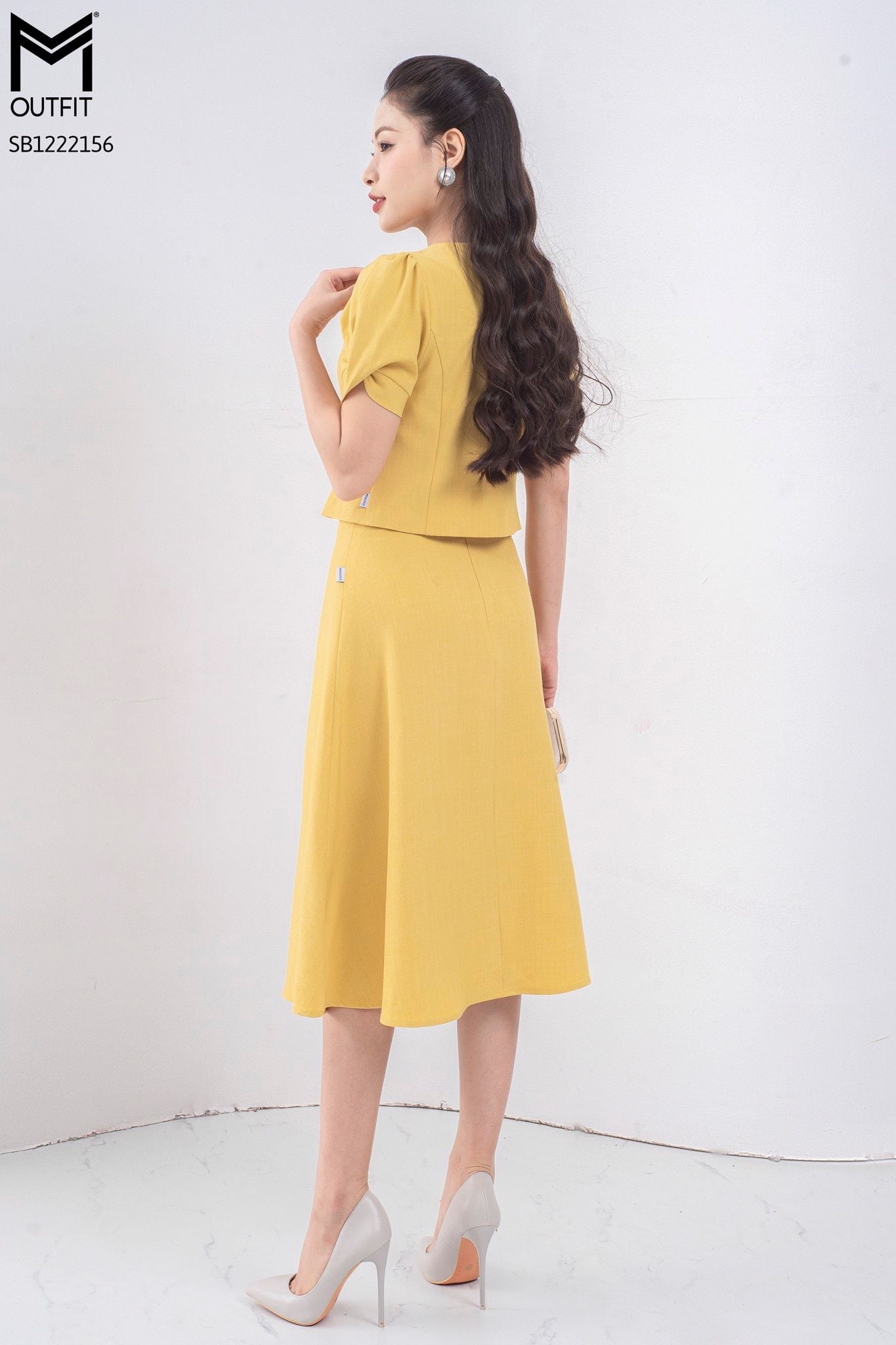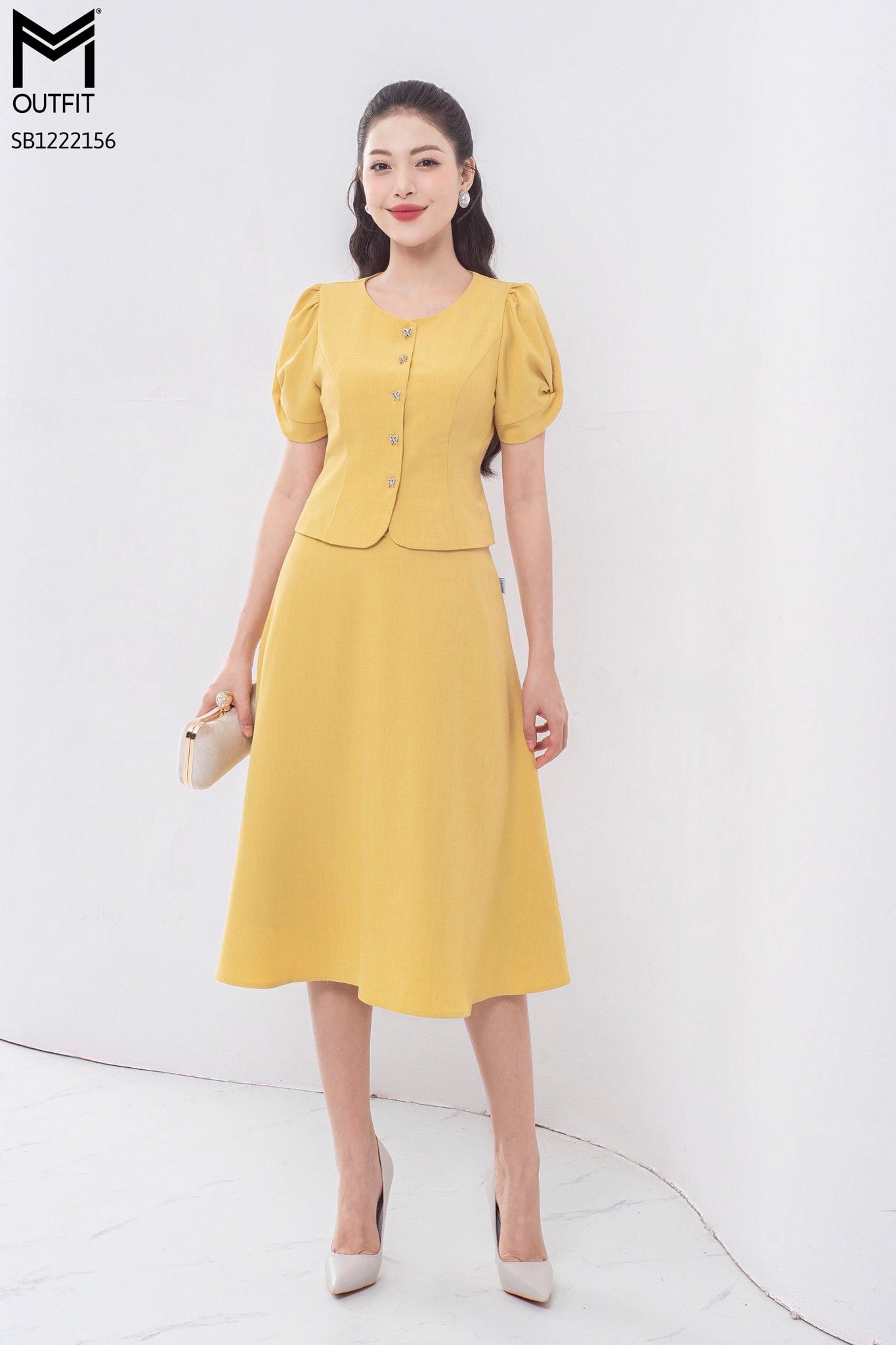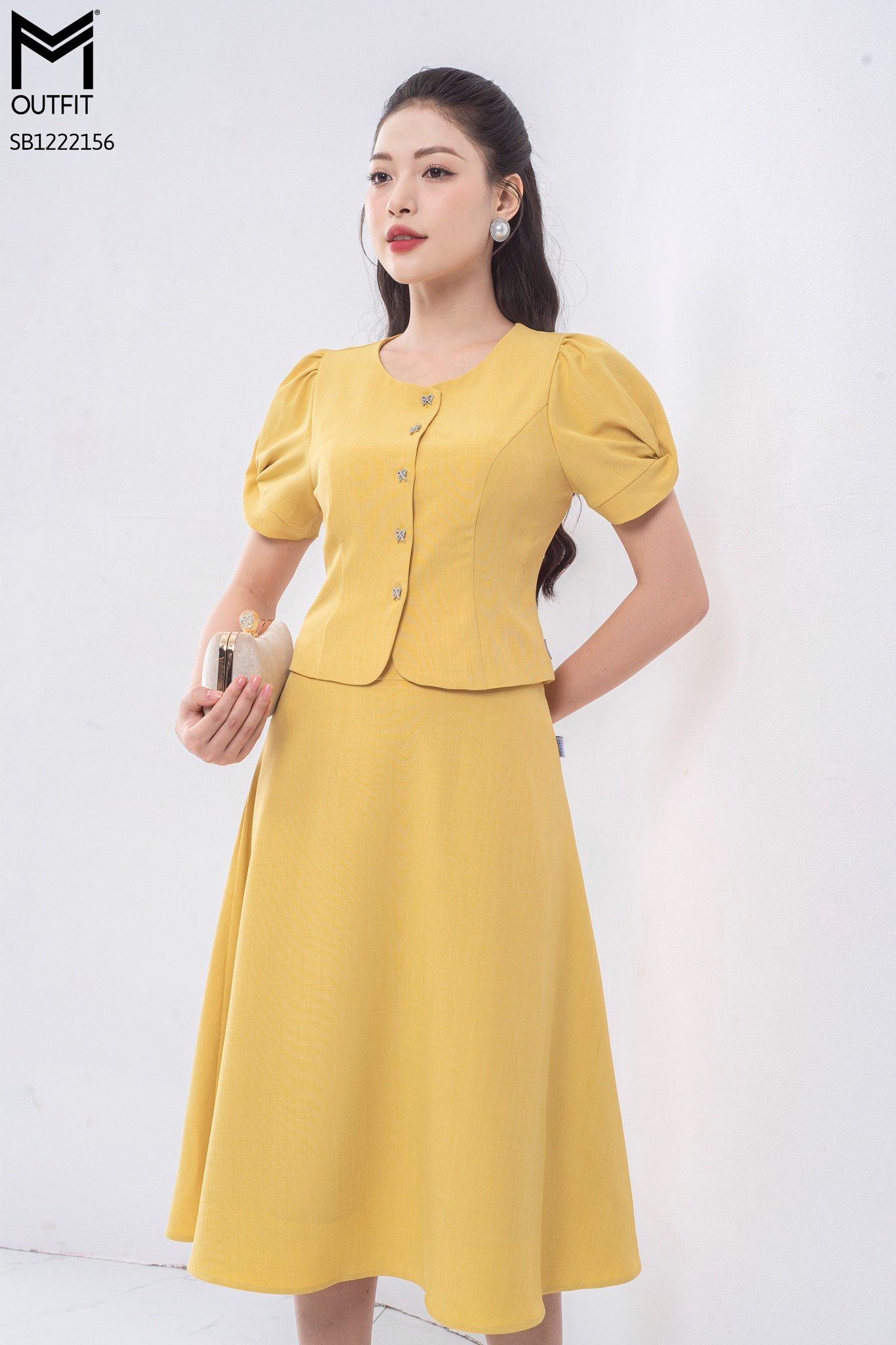 | Đặc điểm | Set bộ áo sơ mi cổ tròn + chân váy dáng xòe |