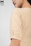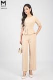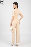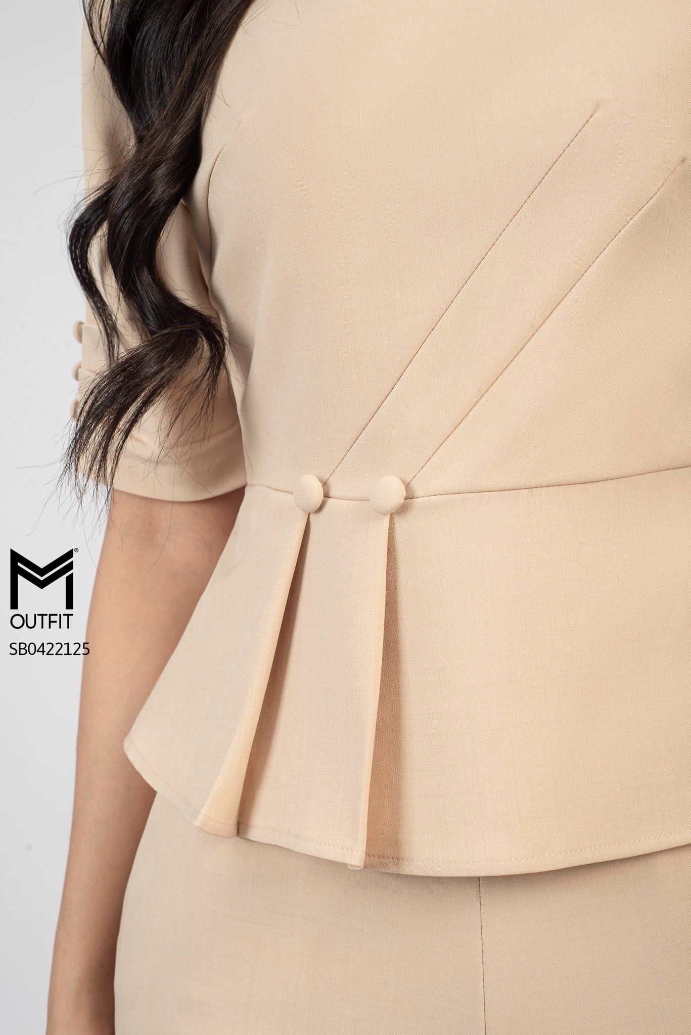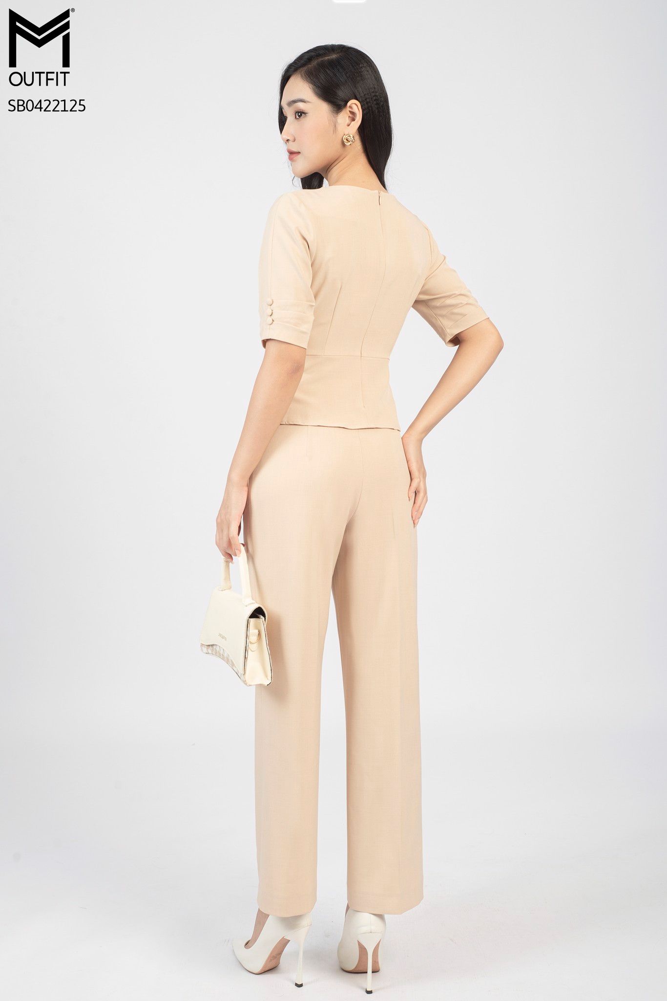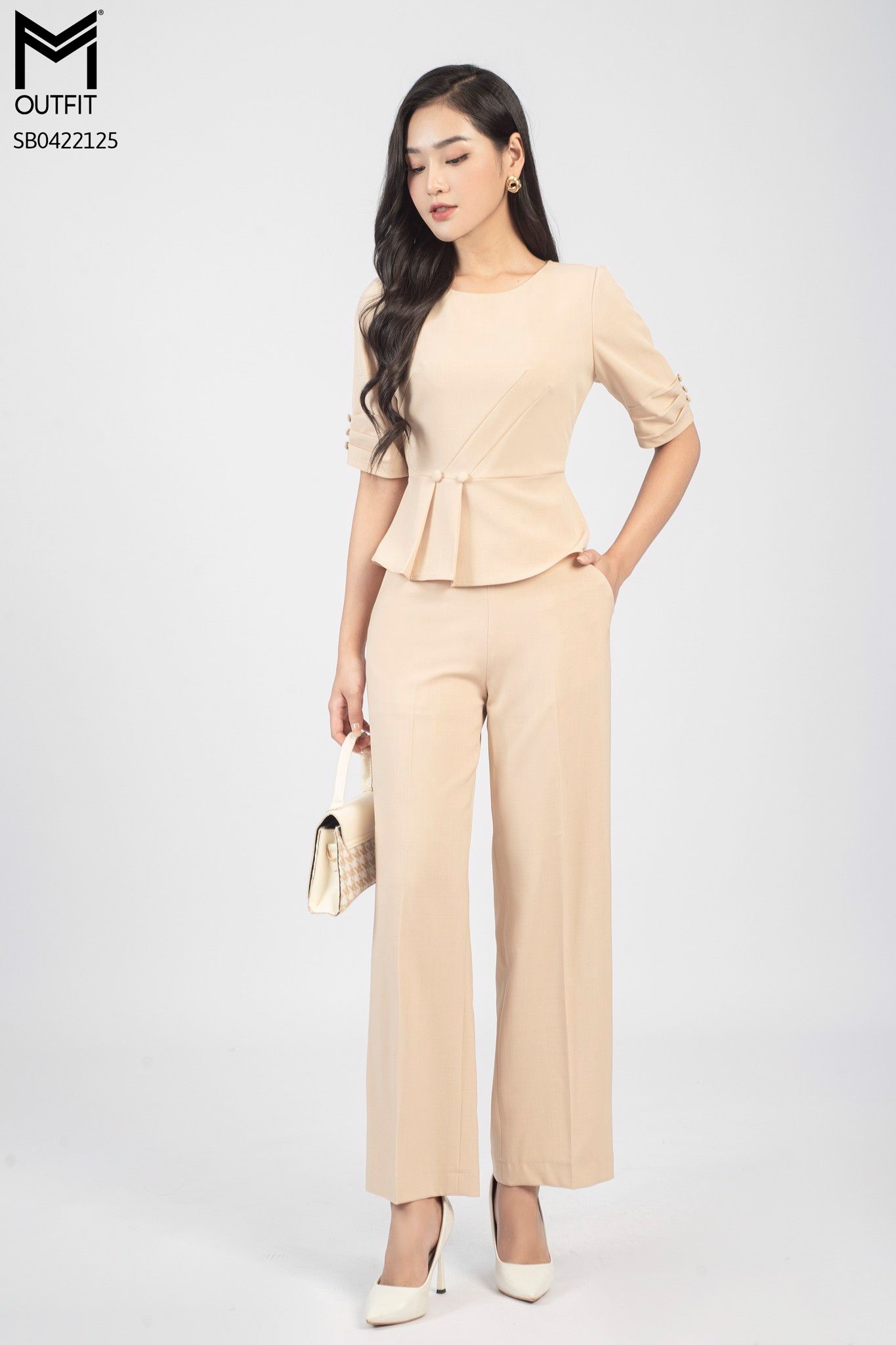 | Đặc điểm | Set bộ áo tay lỡ nhún đính cúc bọc TT, quần suông |