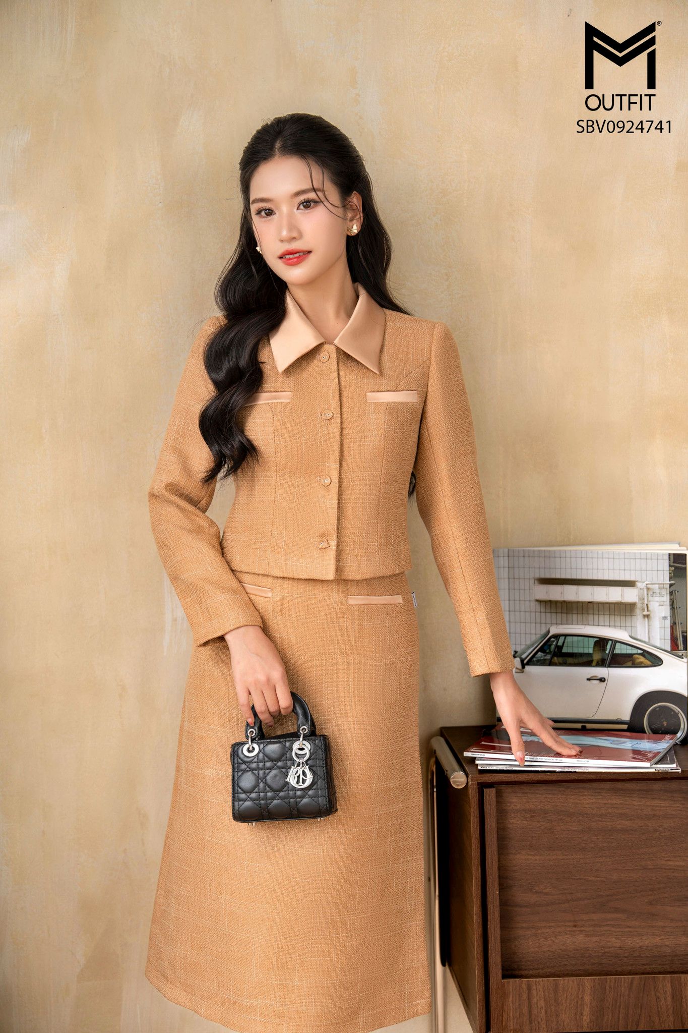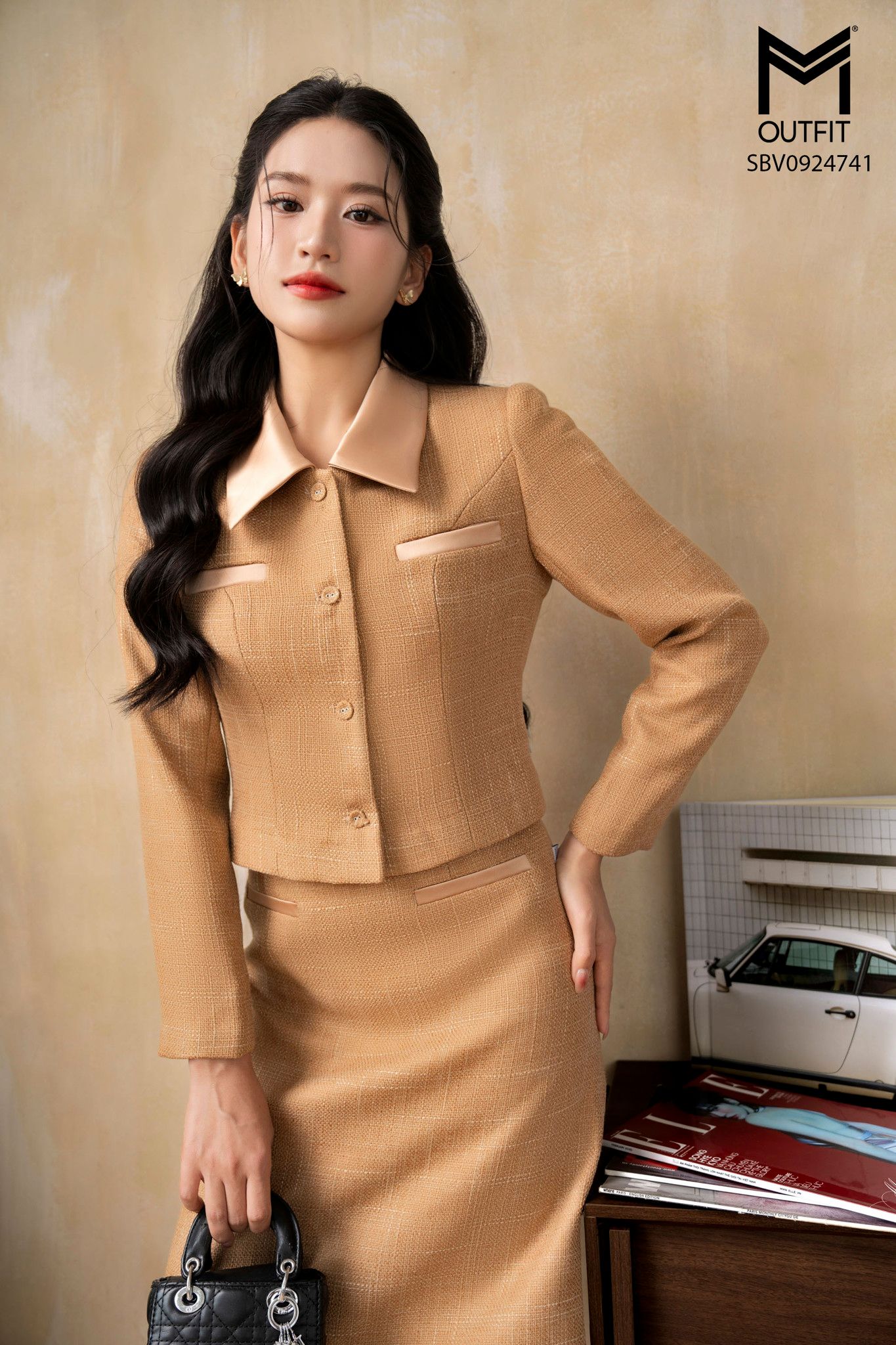 | Đặc điểm | Sét bộ áo vest cổ phối vải lụa cúc bọc kết hợp chân juyp dáng A |