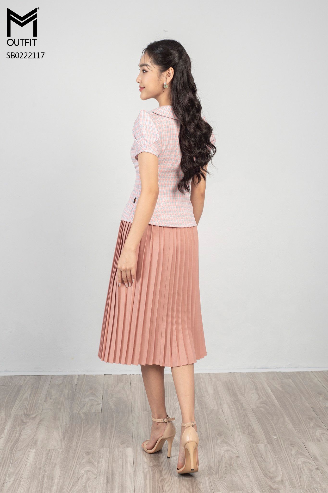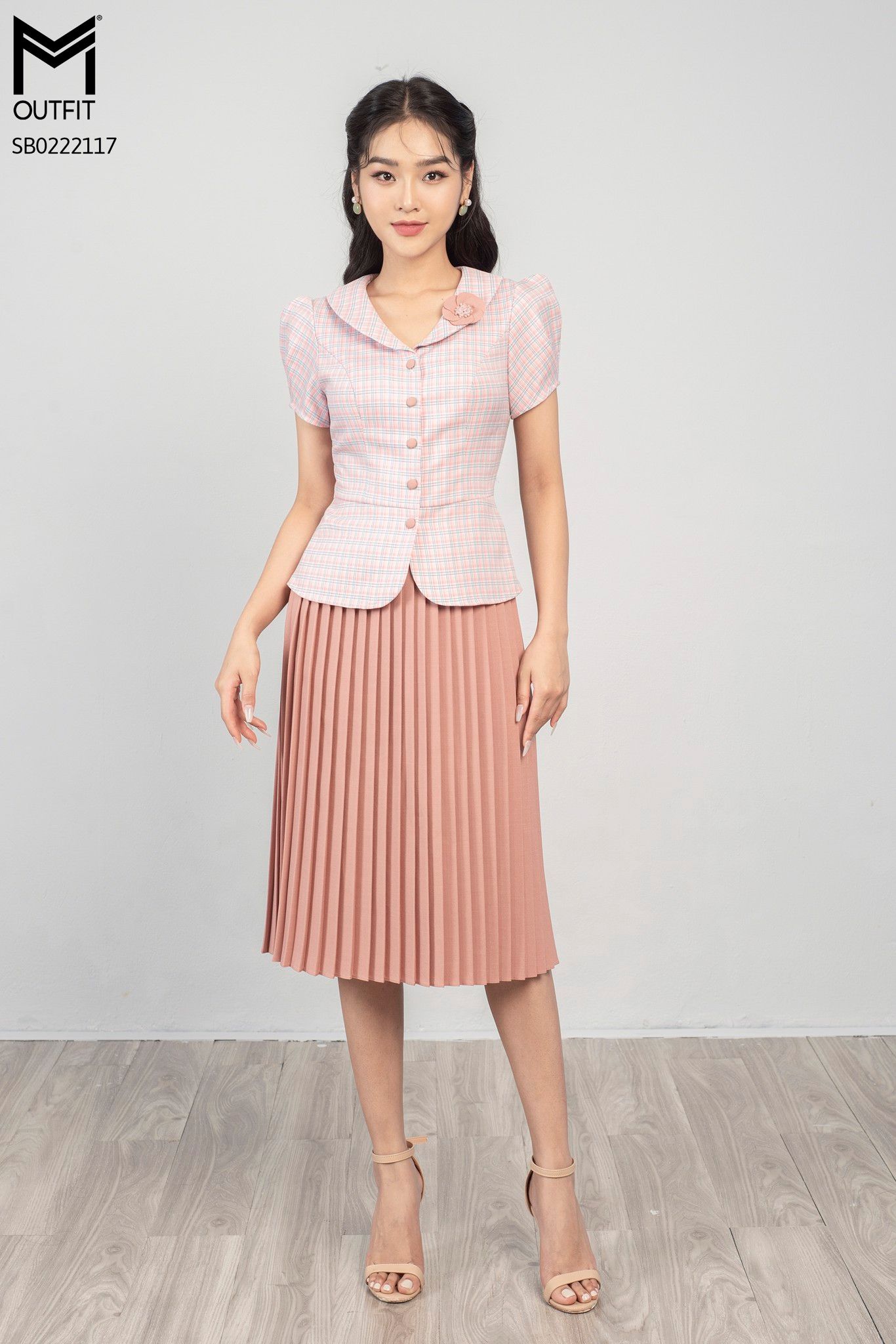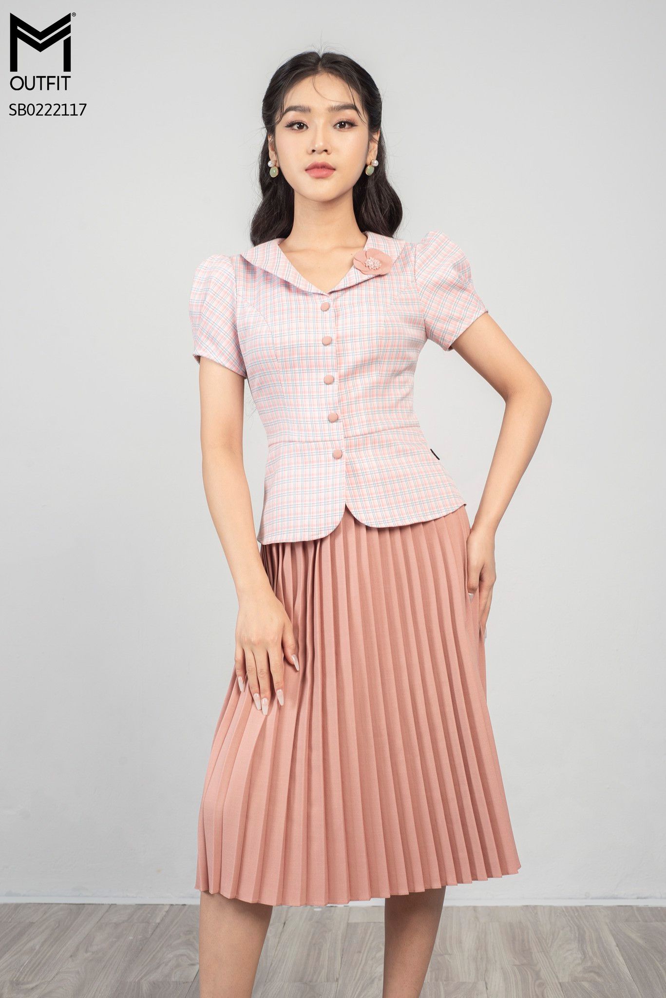 | Đặc điểm | Set bộ chân váy xếp ly, áo kẻ cổ sen đính hoa |