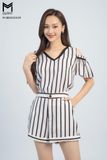 Sét bộ dạo phố, áo cổ tim can viền cổ phối một màu, tay cộc xòe hở vai. Quần sooc gấu lơ vê xoay kẻ.