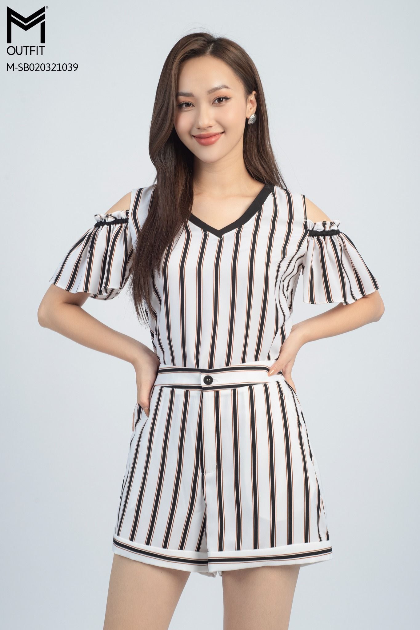 | Đặc điểm | Sét bộ dạo phố, áo cổ tim can viền cổ phối một màu, tay cộc xòe hở vai. Quần sooc gấu lơ vê xoay kẻ. |