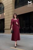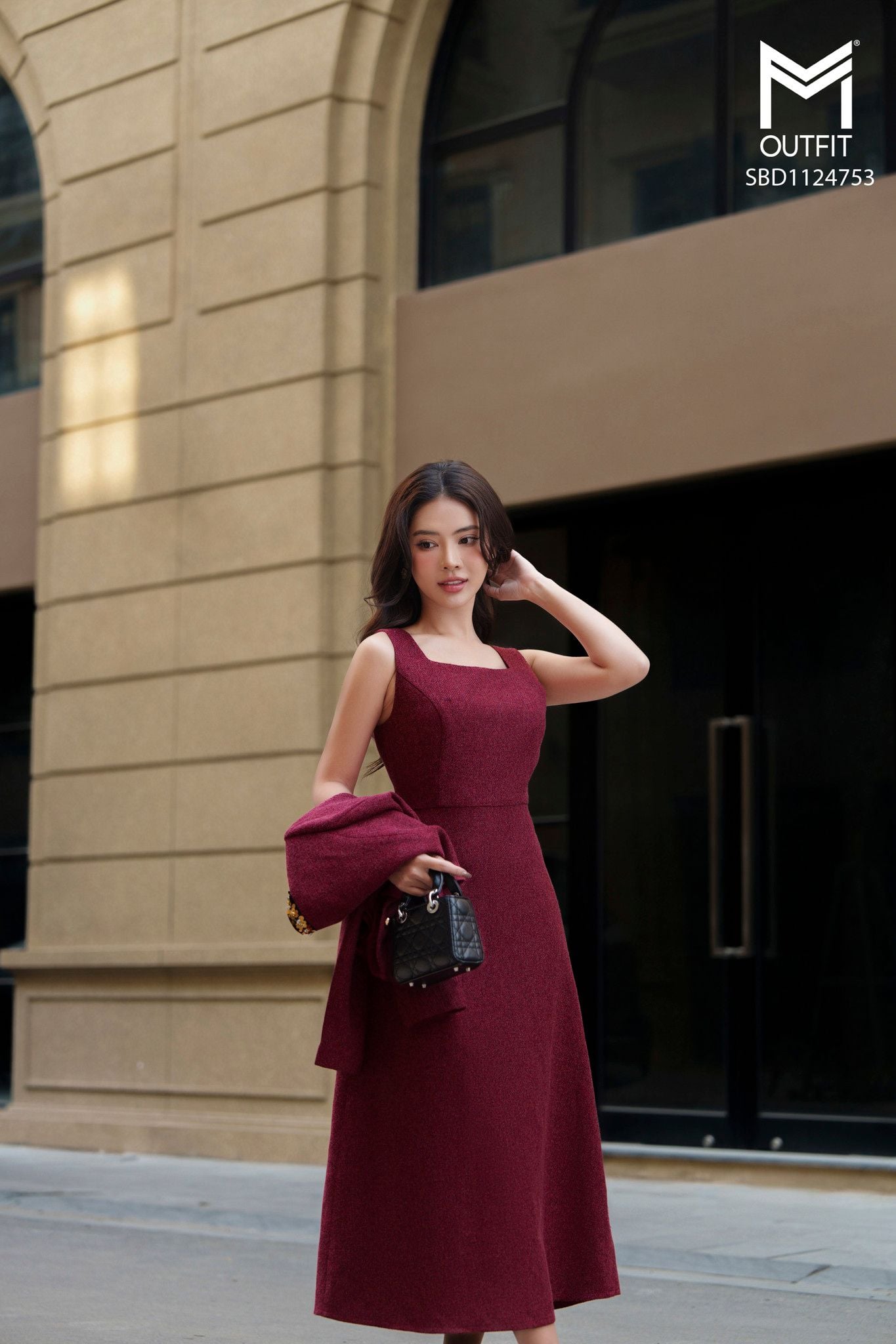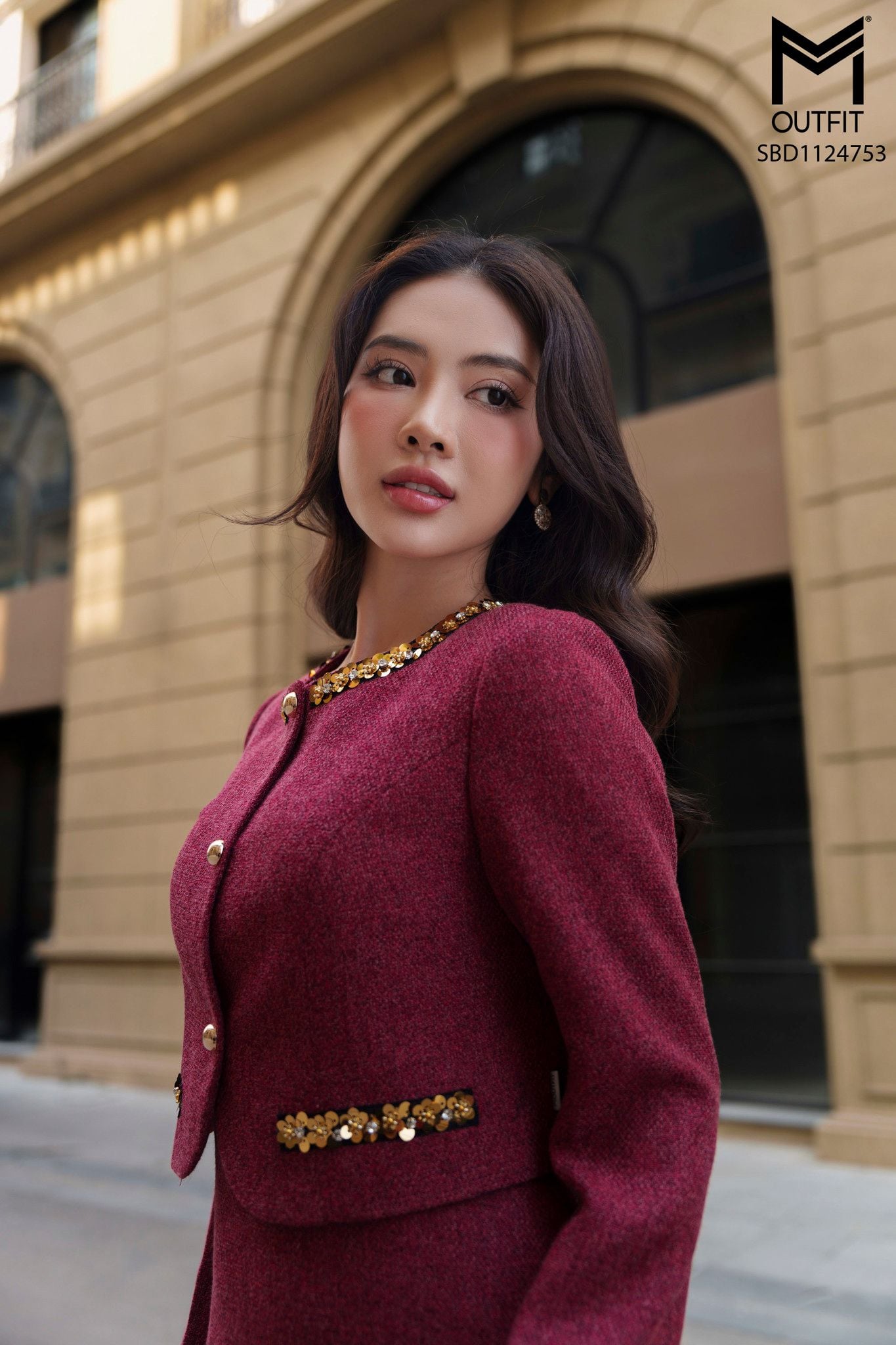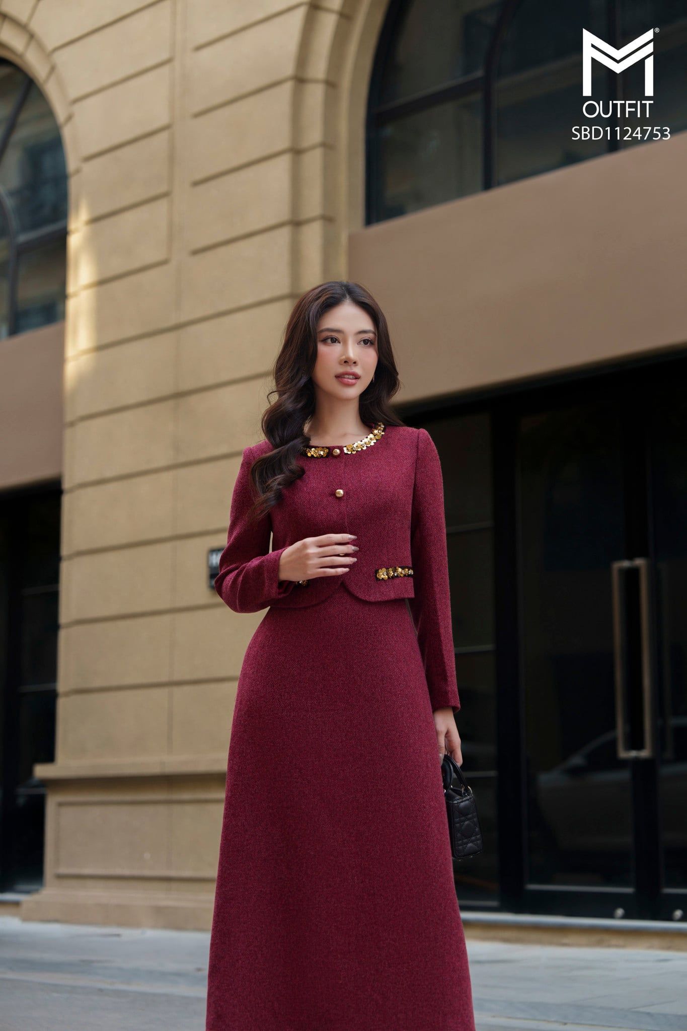 | Đặc điểm | Sét bộ dạ tweed áo vest cổ tròn đính kim sa kết hợp đầm A xòe |