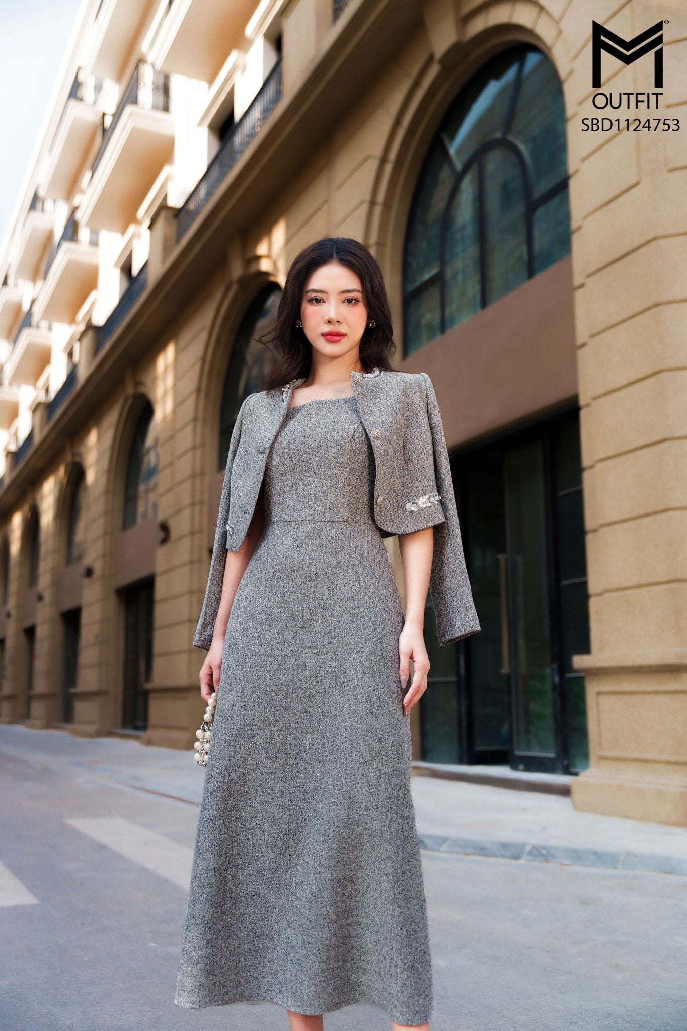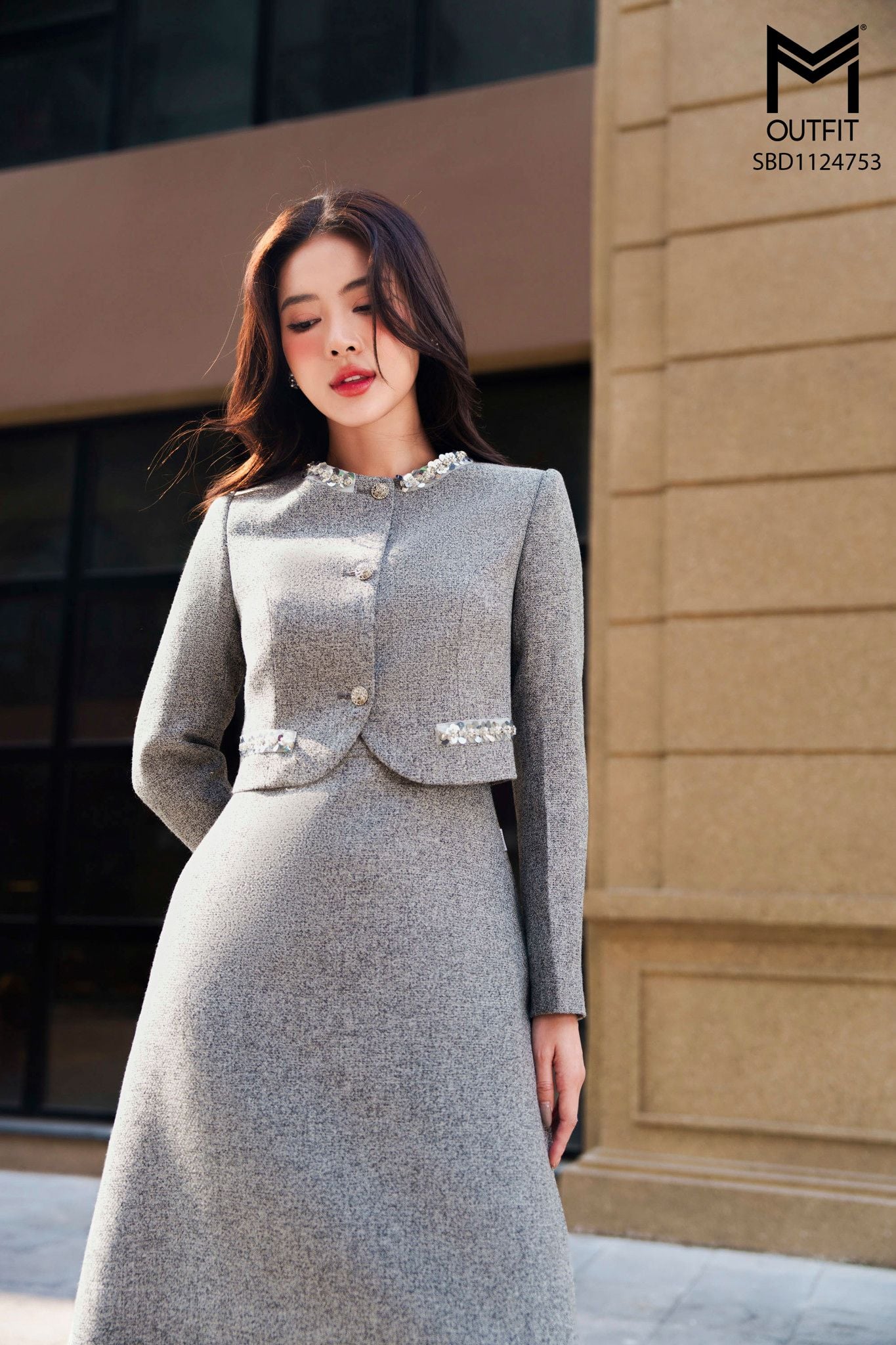 | Đặc điểm | Sét bộ dạ tweed áo vest cổ tròn đính kim sa kết hợp đầm A xòe |