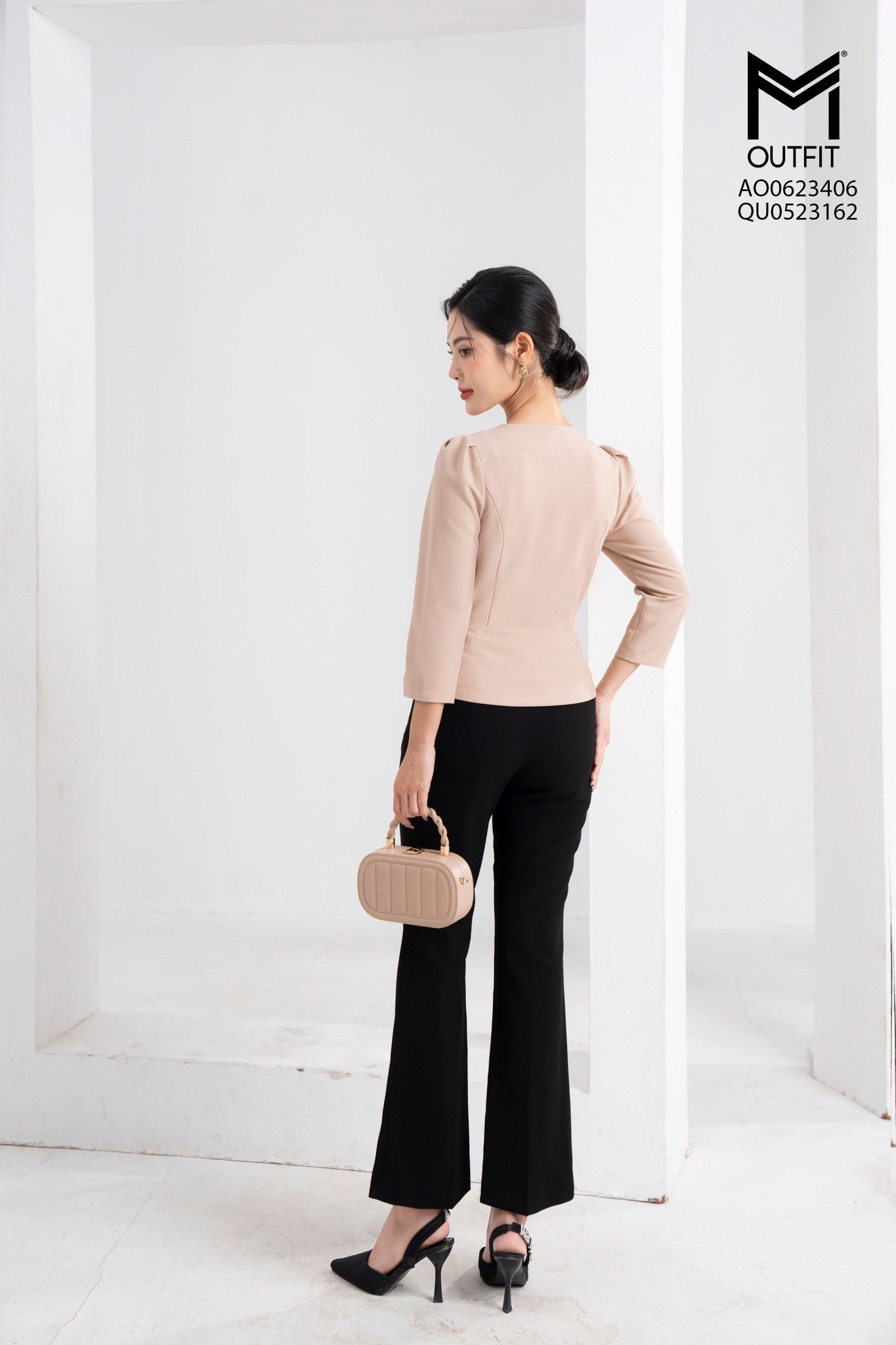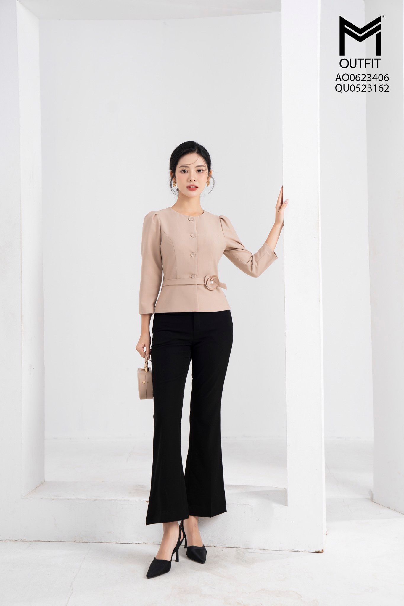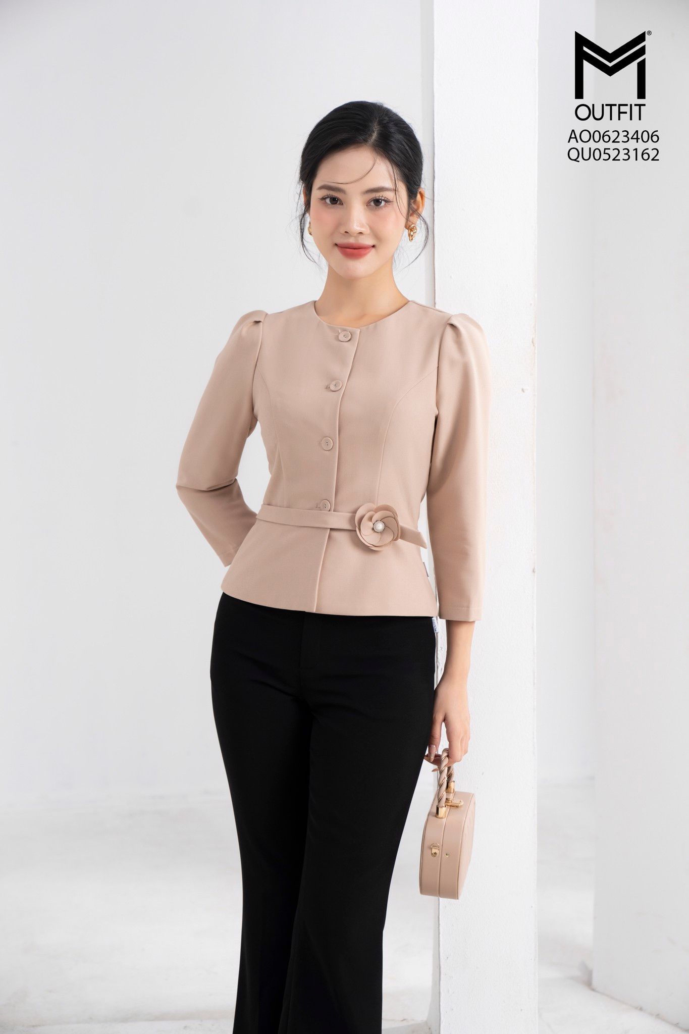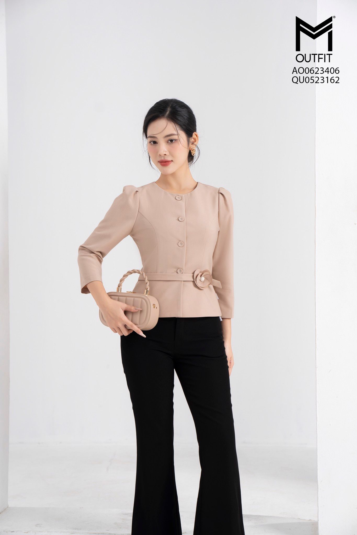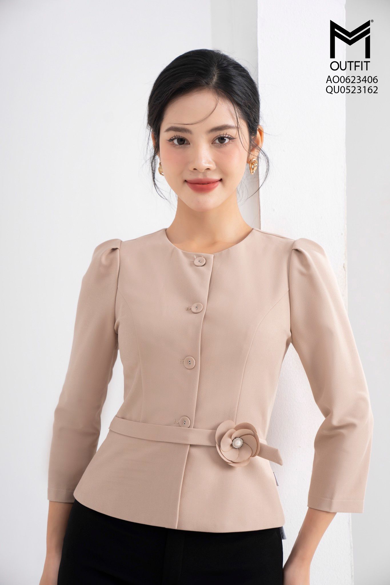 Sơ mi cổ tròn, đai bong đính hoa 3D trang trí tinh tế